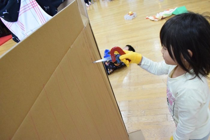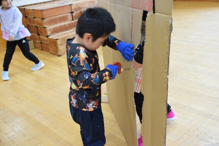 牢屋を作りたい年中さん、製作の得意な年長さんに設計図を書いてもらって。