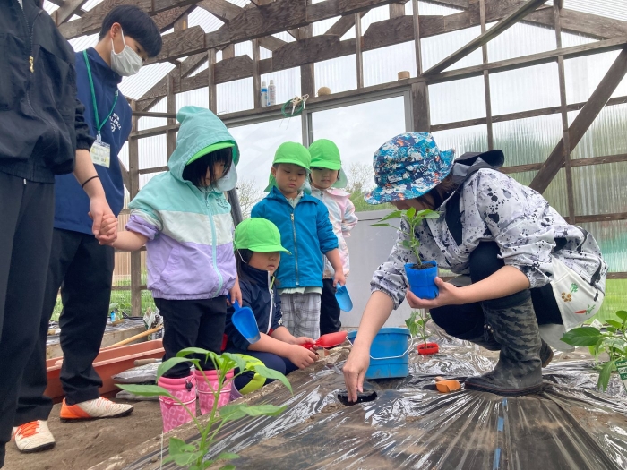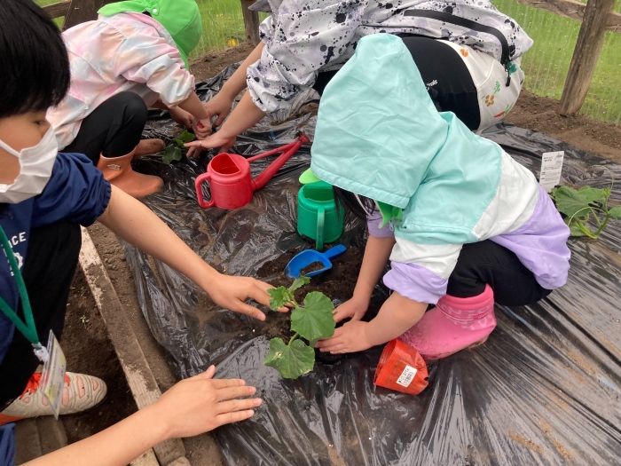 畑もできて、いよいよ念願の苗を植えにハウスに向かったさくらさん。穴に栄養(肥料)を入れて、喉が渇くからと水も入れて苗を穴にポン。上から優しく抑えて、また水を飲ませてあげて・・・と教えてもらい全部の苗や種を植えることができました。最後に豊作を楽しみに、「おおきくなあれ~」「おいしくなあれ~」と呪文を唱えていましたよ(^^)/