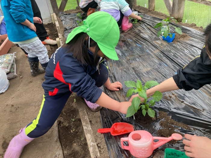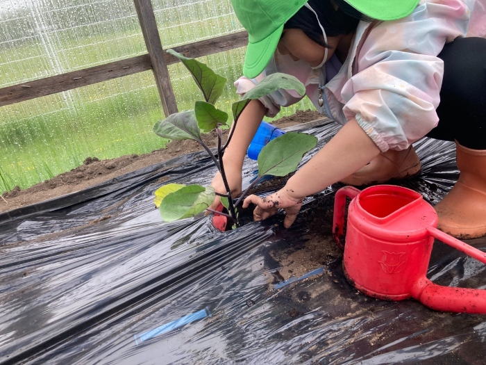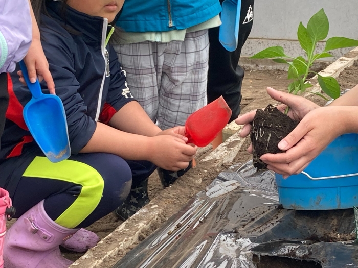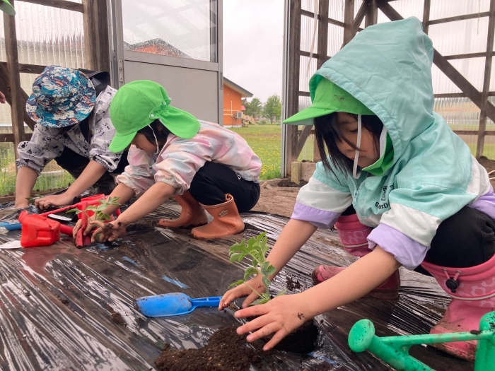 今日はハウスに野菜の苗を植えよう!と、昨日から楽しみにしていたさくらさん。植える野菜も自分たちで決めたので余計にやる気アップ!朝の会が終わったら勇んでハウスへGO!