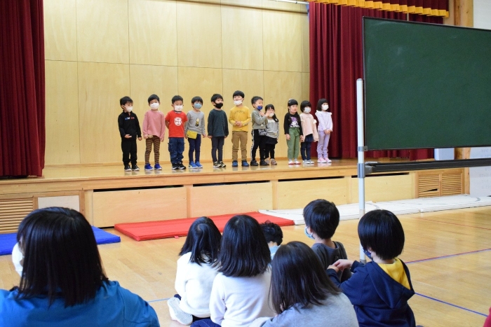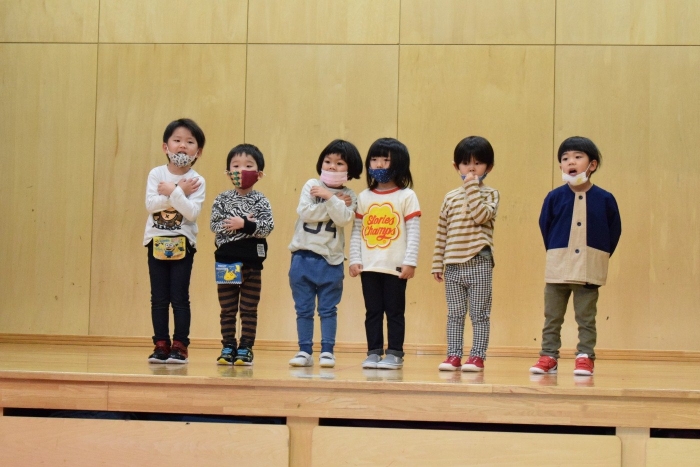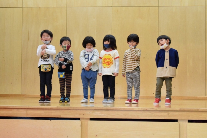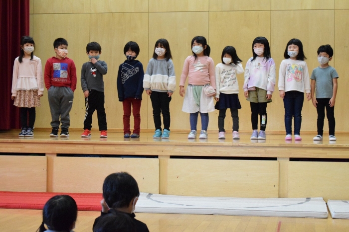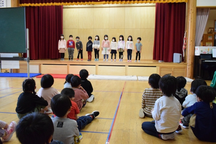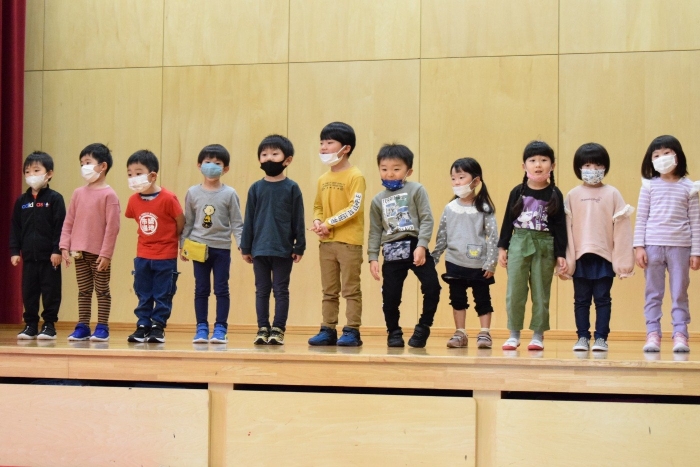 今日の集会は、これまでお遊戯会の練習をしてきた中で、一つずつお友だちの前で発表し合おうという内容でした。各クラスとも合唱を披露しました。緊張したというお友だちもおりましたが、練習の成果が少しずつ現れていていいなあと感じました。