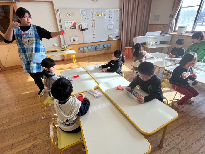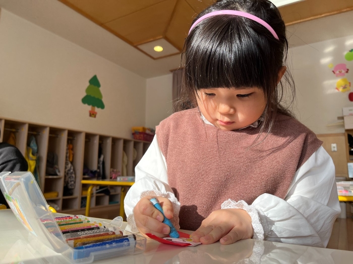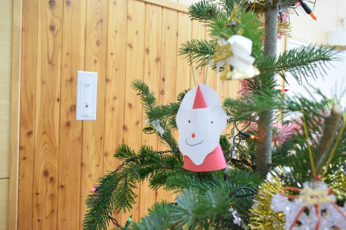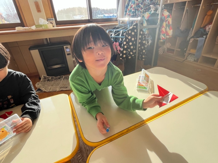 今回は折り紙でサンタさんを折りましたよ(*^-^*) 折り紙は線や角をきれいに合わせるのが上手に仕上がるポイント、お手本を見ながら一つひとつ丁寧に折っていきます。仕上がりは満足にいくものが出来上がったようです(*^-^*)