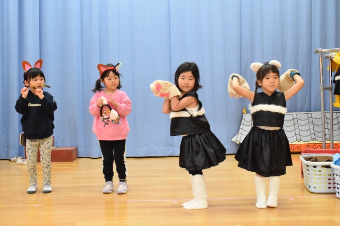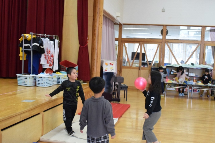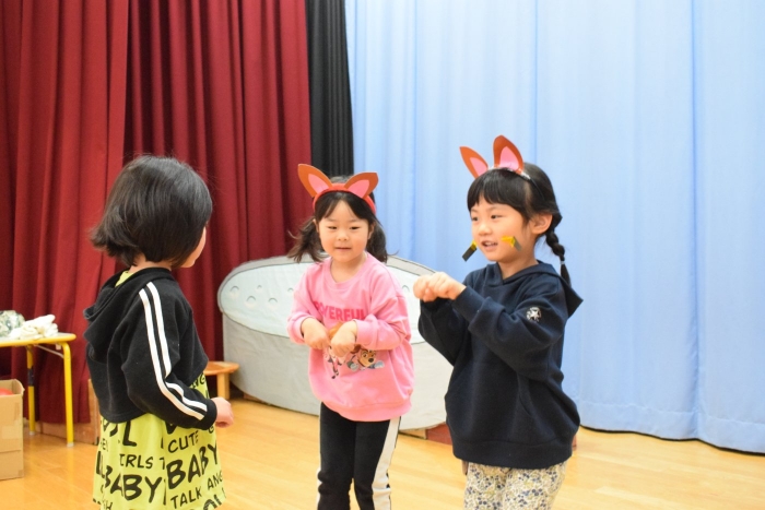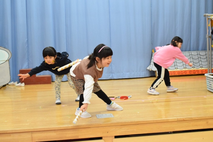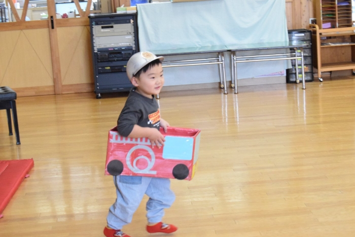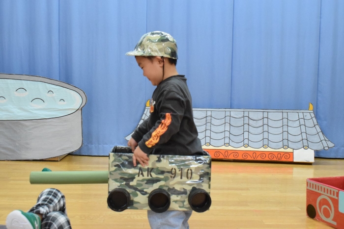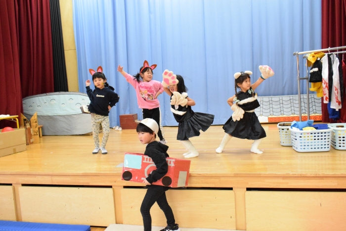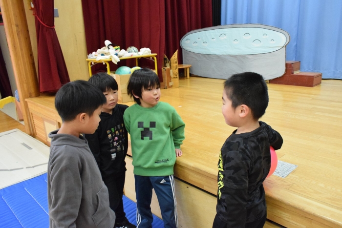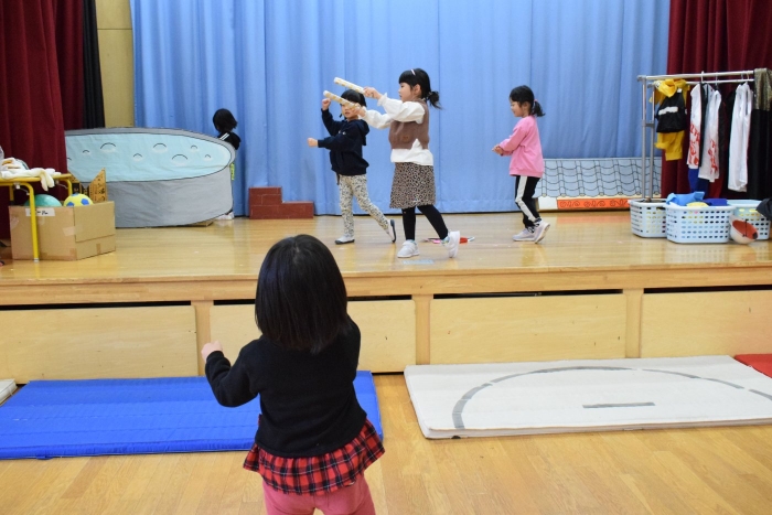 今日も仲間を集めて『かたき』とステージでのお遊戯が始まっていました。毎日やることで、ルールを守るようになったり、話し合いができるようになったり、着替えも自分でできるようになり、遊びへの意欲も増しています(*^-^*)