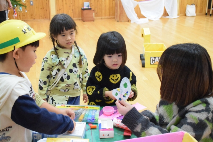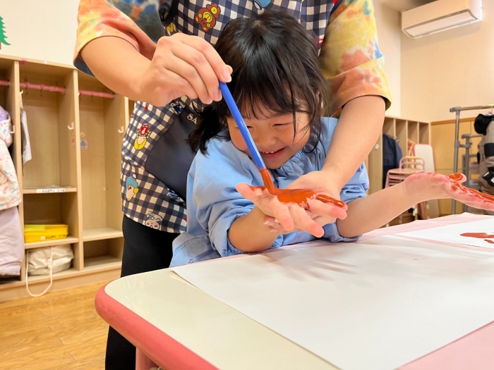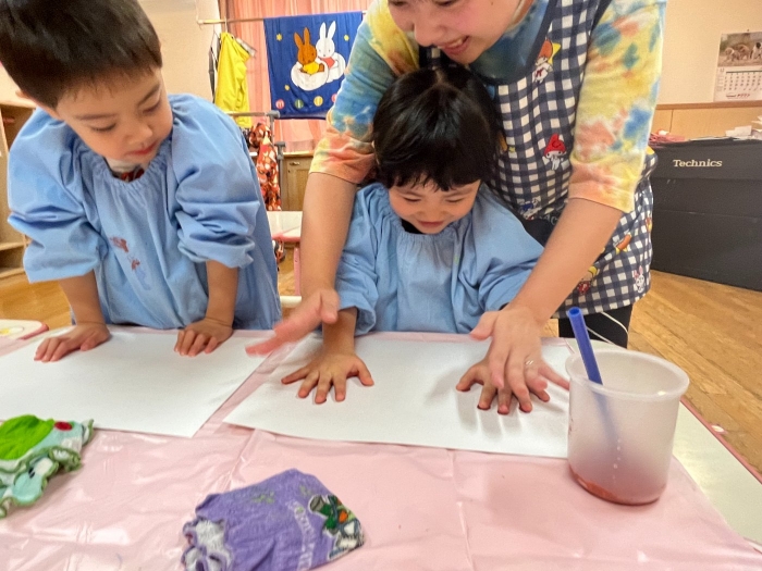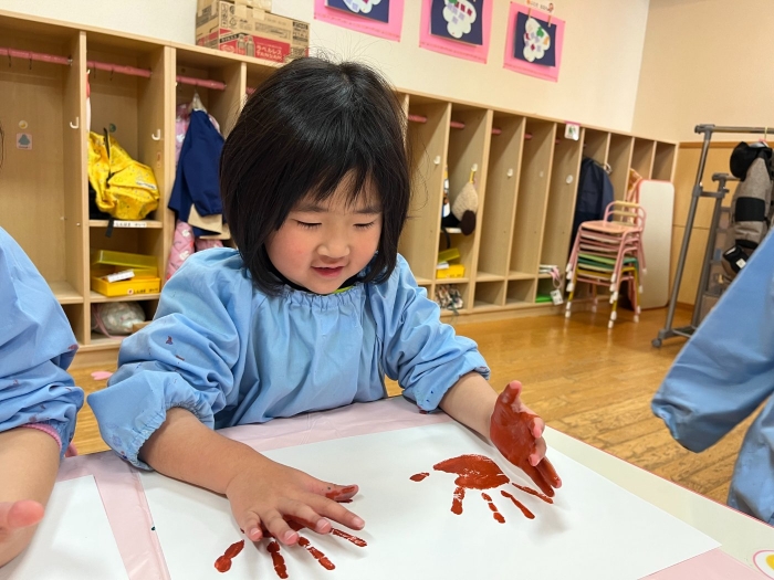 季節の製作。今回は手形を押してクリスマスにちなんだものを作りますよ!なにになるかわかりますか?