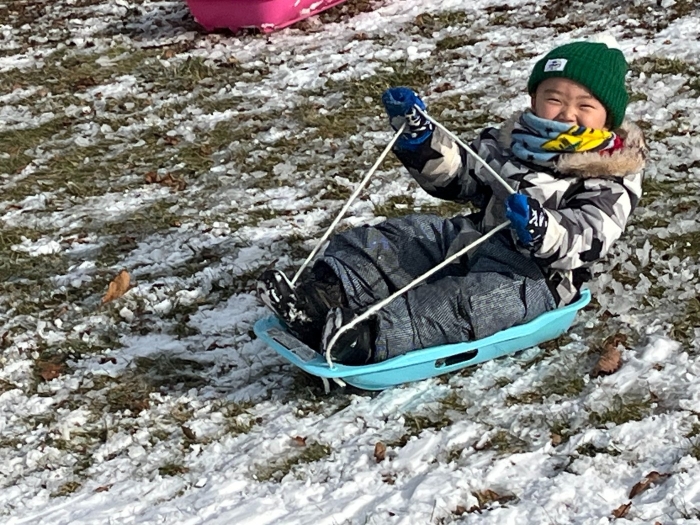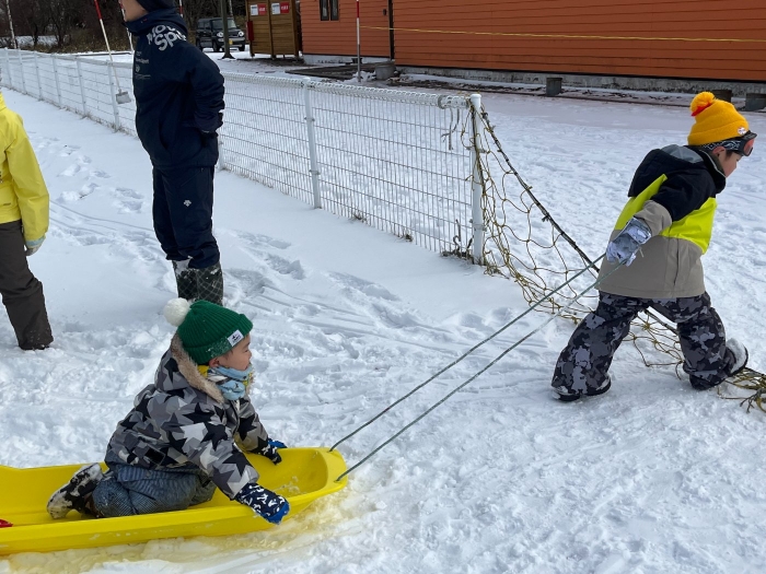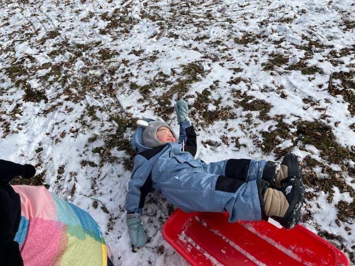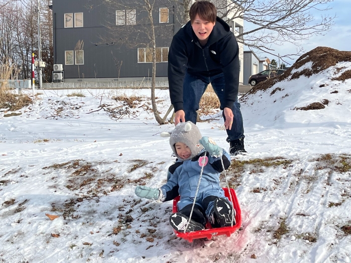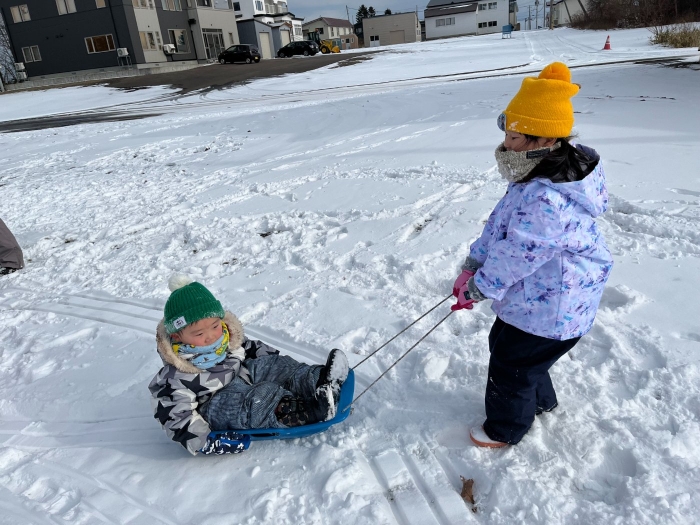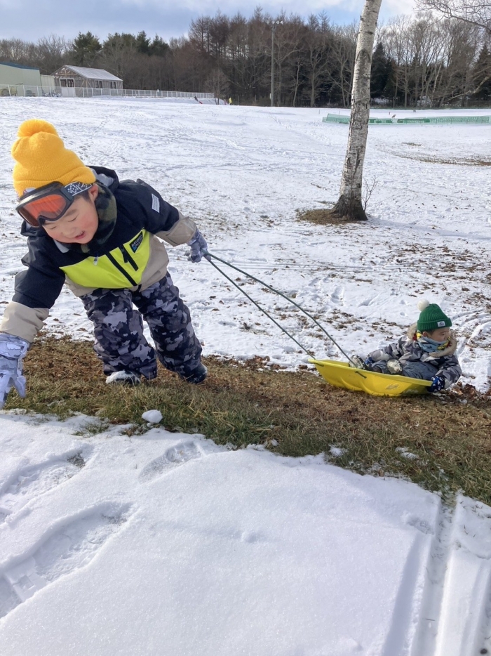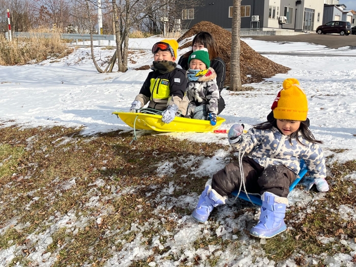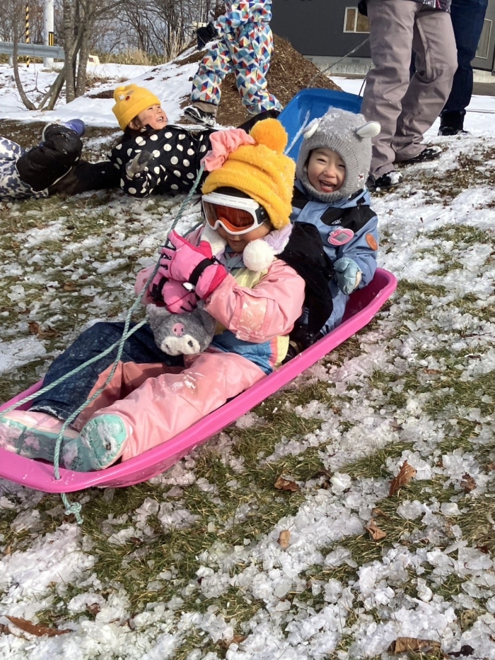 パークゴルフ場でのそり遊び、雪がしまってきたからか芝生が見えてても良く滑るようになりました。