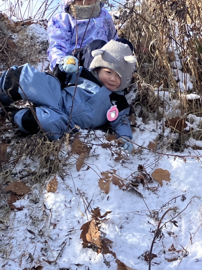 さくらさんはもっと刺激が欲しくてスケートリンク横の崖滑りに行きました。未就園児さんもついていっていましたよ!
