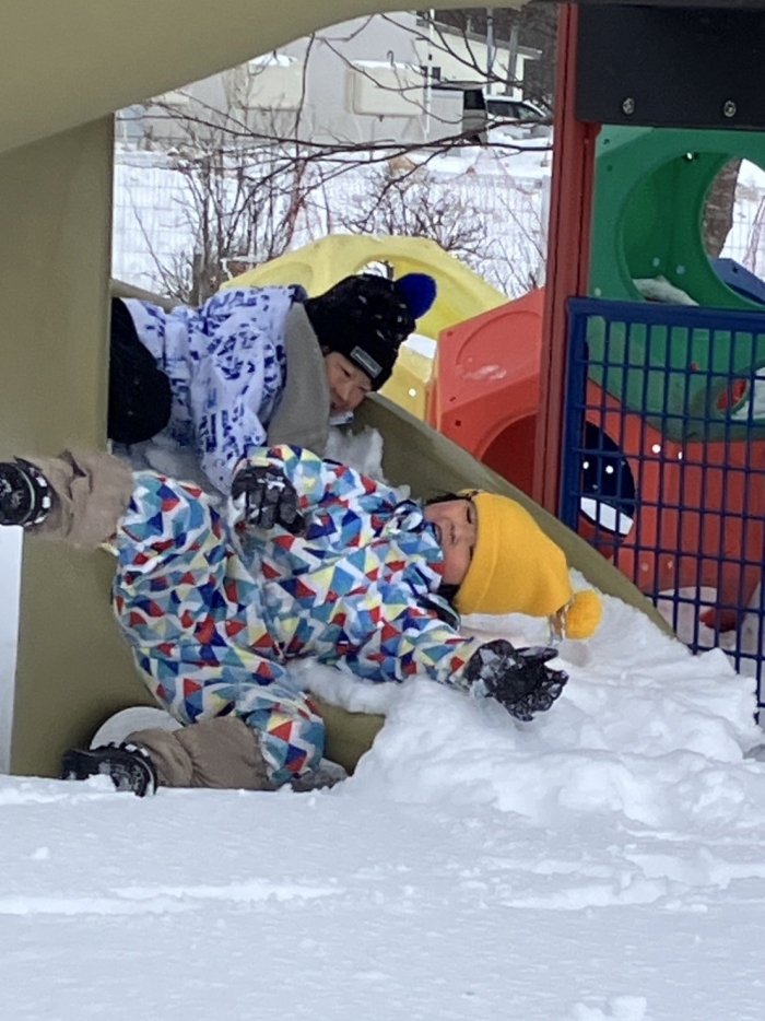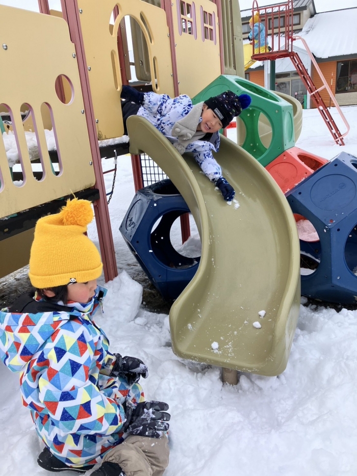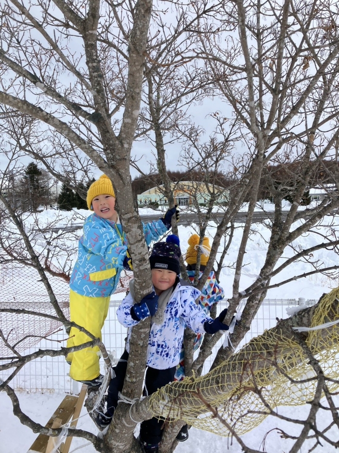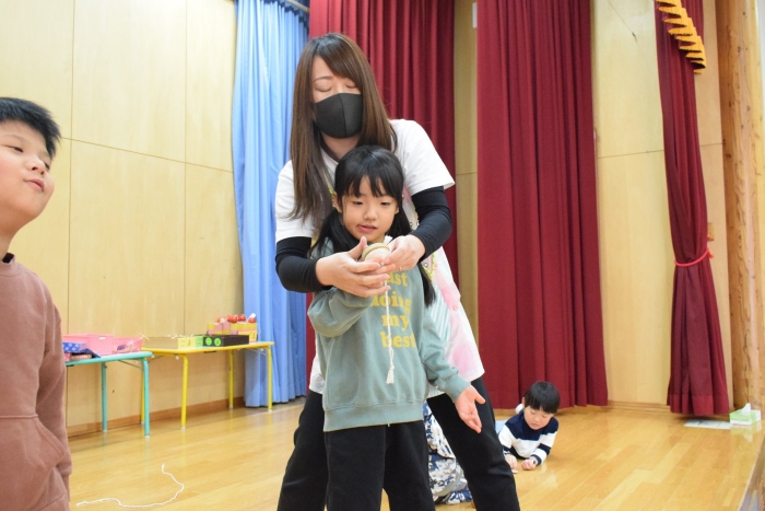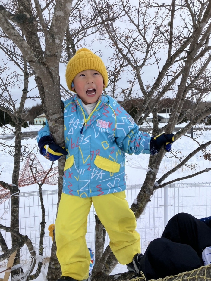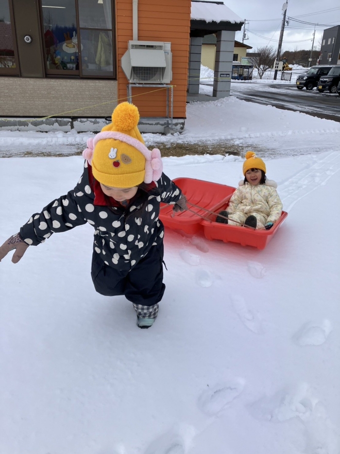 外は強風で寒さもひとしお(>_<) それでも外に飛び出して行くうめさん、ももさん。誰も「寒い」なんて言いません! たくましさ全開で遊びに夢中になっていました(^^)/