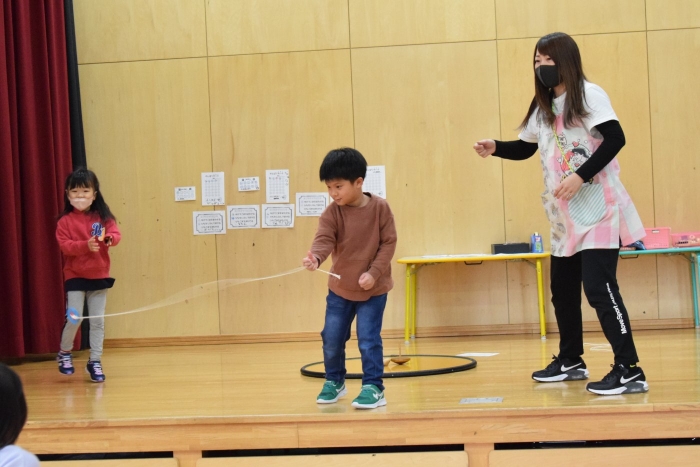 伝承遊びはまだまだ続いています。今日も紐コマに夢中になる子たちが次々と増えて、お互いに切磋琢磨しながらスタンプカードの欄を埋めようと頑張っていました。でもまだ一人で回せる子は現れていません(>_<)