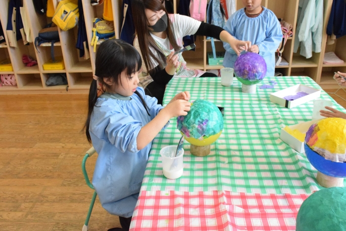 固くなった張子に今日は水糊を使ってお花紙を貼り付けていく作業をしました。自分の顔にピッタリのオニのお面が出来上がるようですよ!どんな表情を付けるのか楽しみです!(^^)!