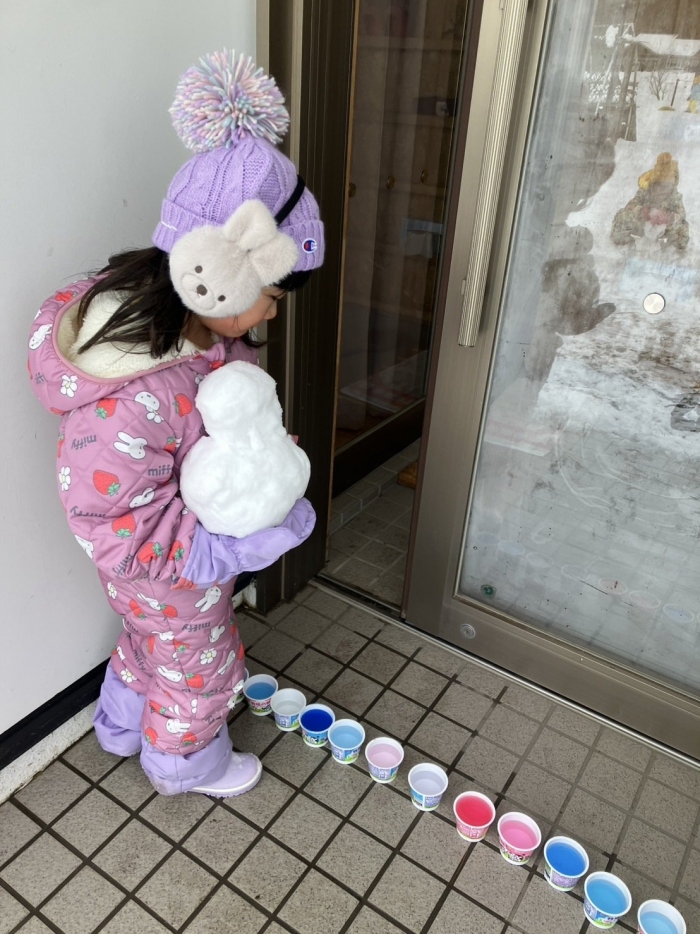自分で作った雪だるまを大事そうに抱えて。うめさんは色水で氷るかどうかの実験中
