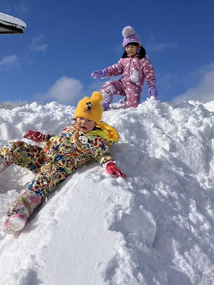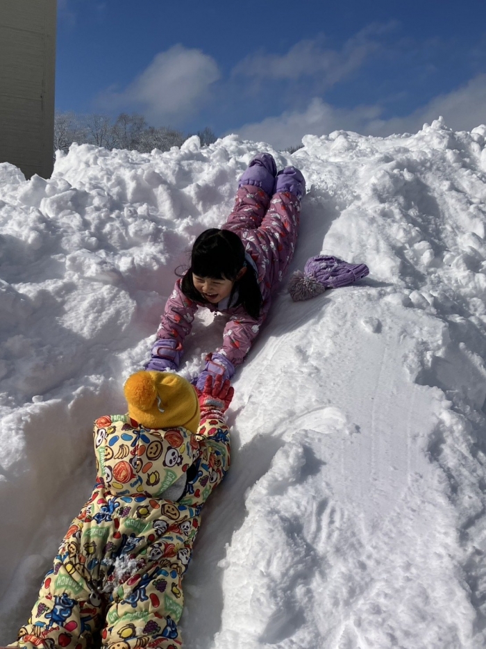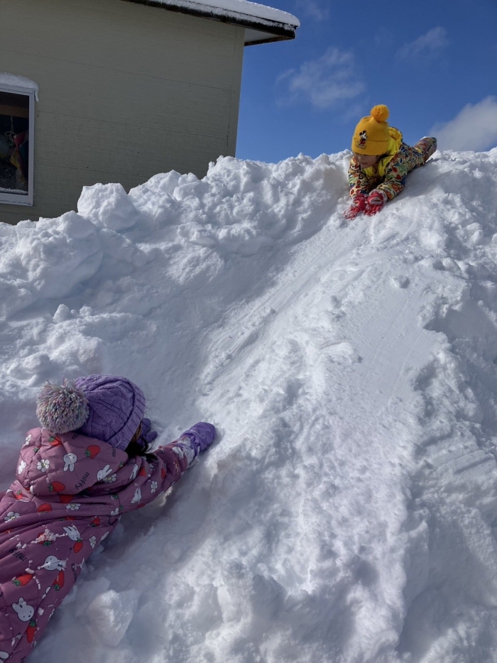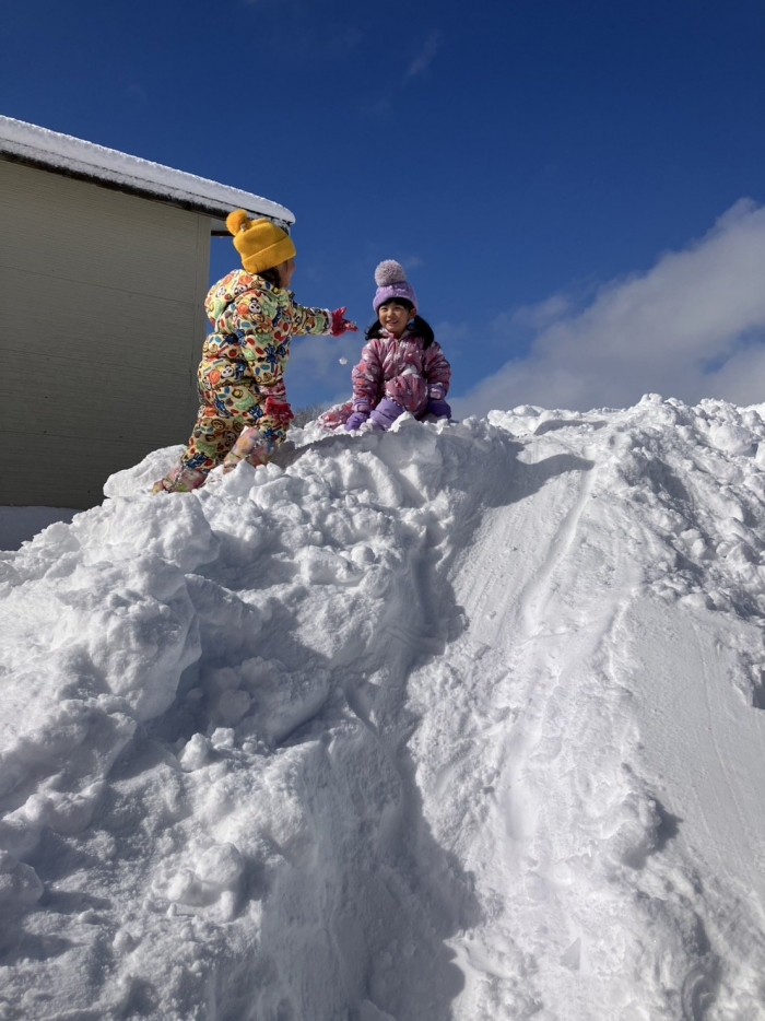 この大雪で園庭は様変わり、グランドにも雪山を作っていただき、子ども達は登園してくるとさっそく外遊びに出ていきました(^^)/