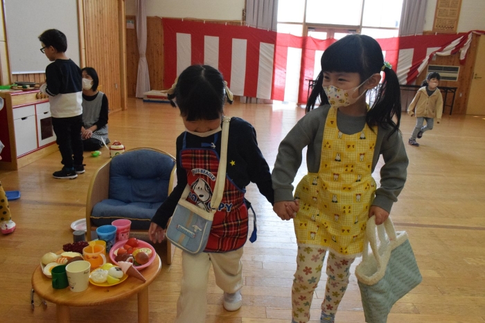 お母さんごっこや美容室ごっこ、社会生活とのつながりが遊びに反映されていました。子ども達はお母さんや美容師さんのやっていることをよ~く見ているものですね(*^-^*)