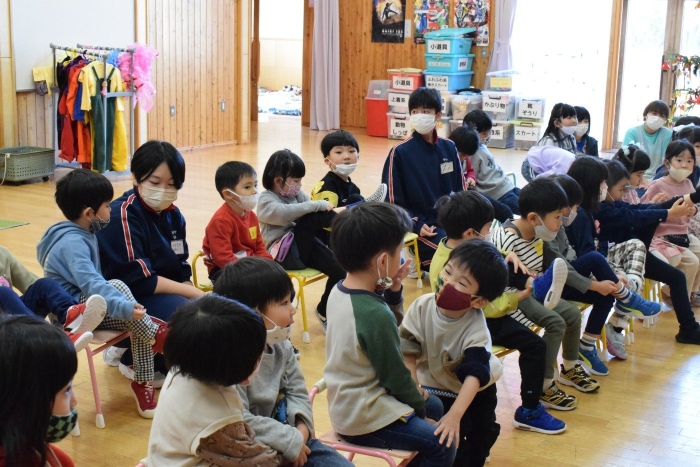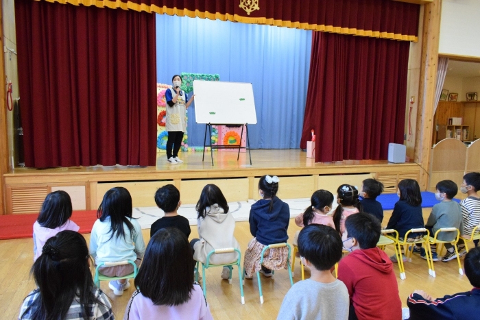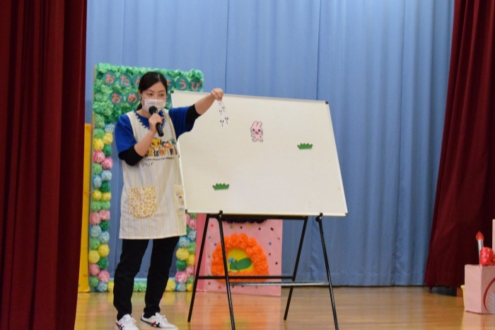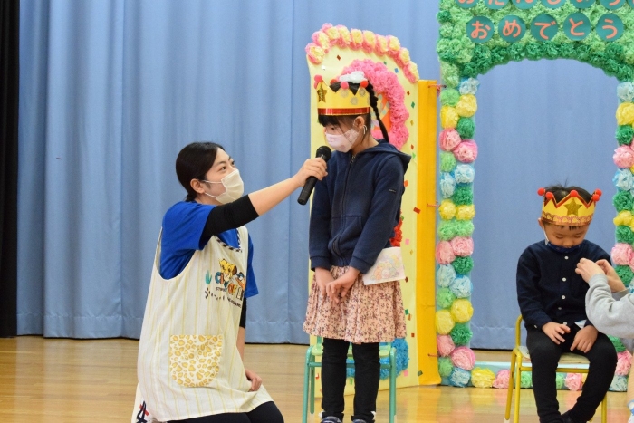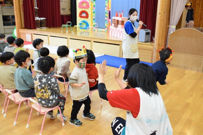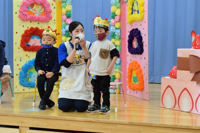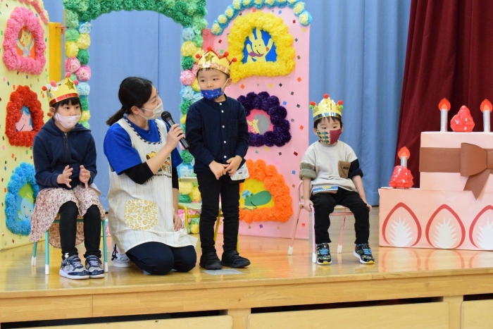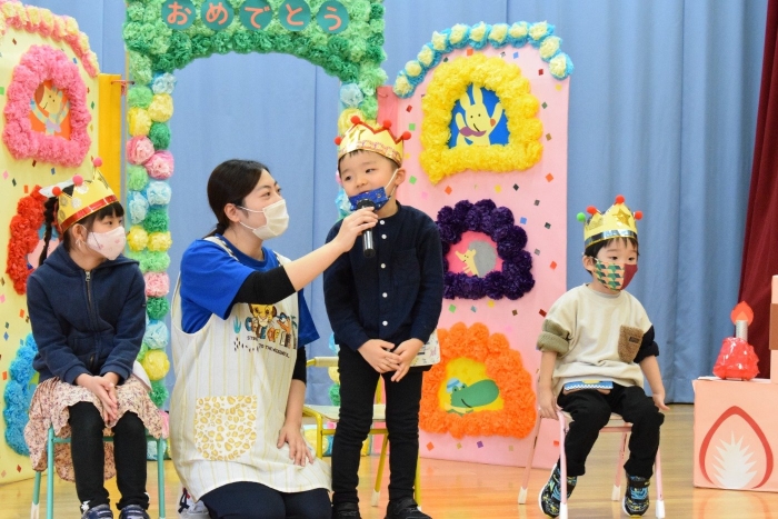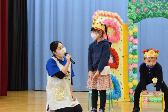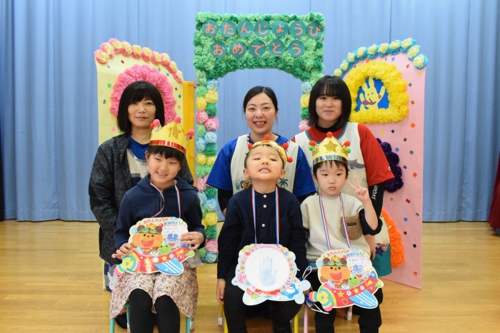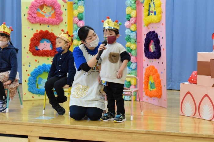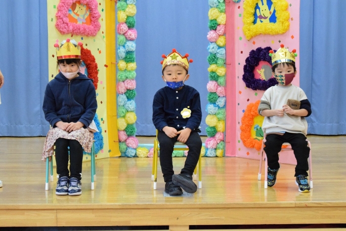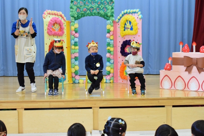 今日は12月生まれの誕生会でした。12月生まれは1名ですが、お休みしていた11月うまれさん1名と来月お引越しする1月生まれさん1名の3名のお友だちが祝福をうけました。主役さんはみんなとタッチをしながら「おめでとう!」というお祝いの言葉をうけて入場しました。インタビューでは3人ともはきはきと応えてくれてすばらしいなあと思いましたよ。