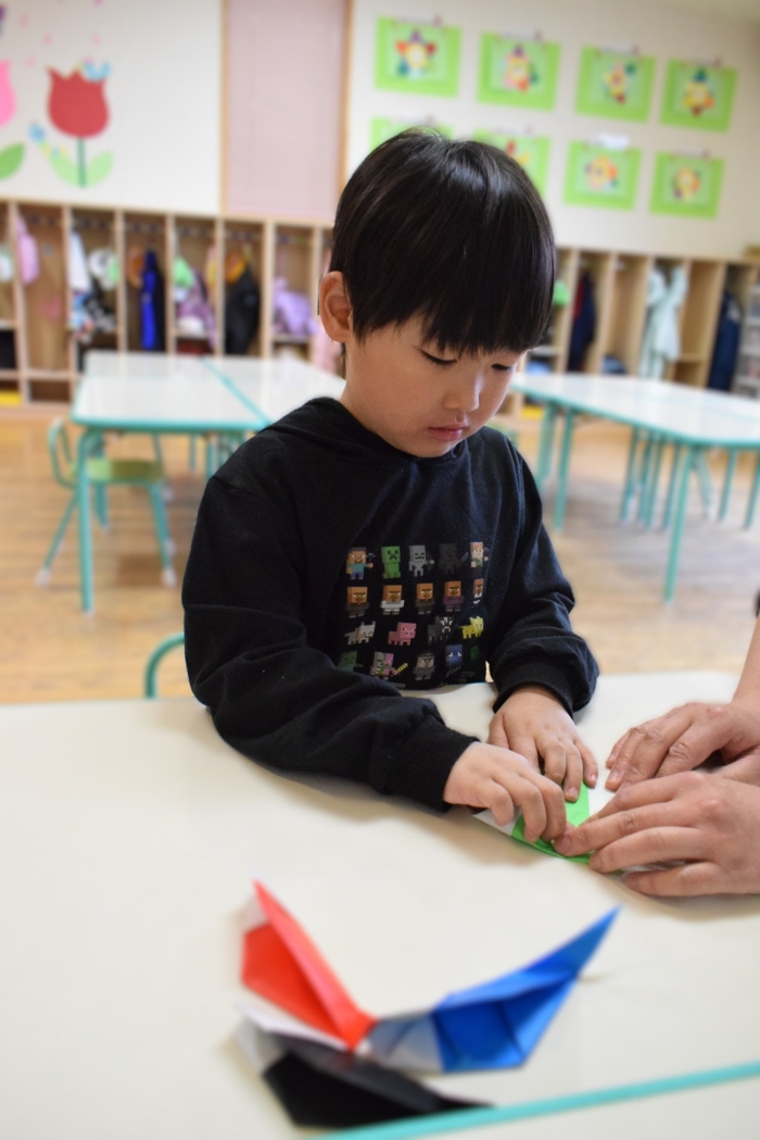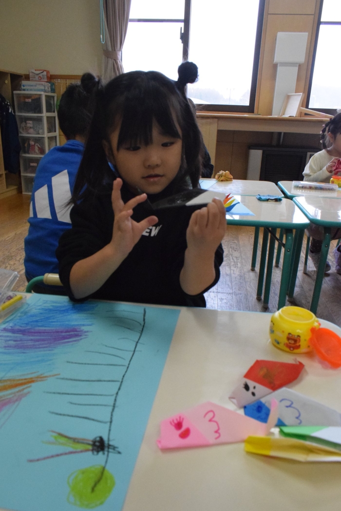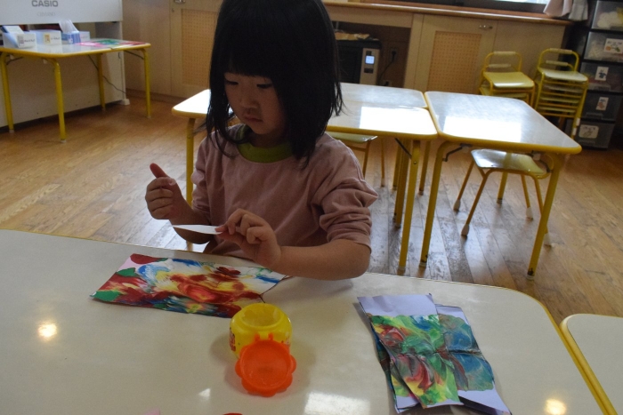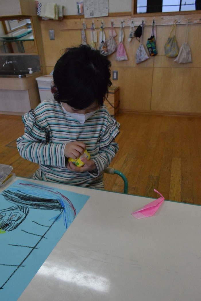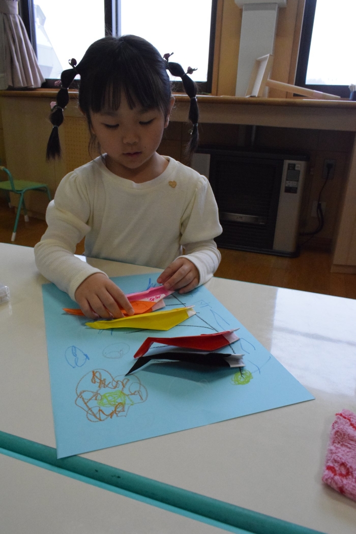 さくら組さんでは,昨日の続きの折り紙製作。昨日お休みしていたお友達も,朝,お部屋で先生と一緒に折り紙を折っていました。