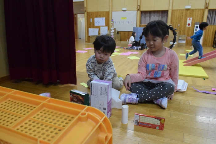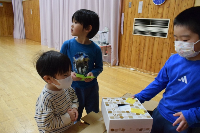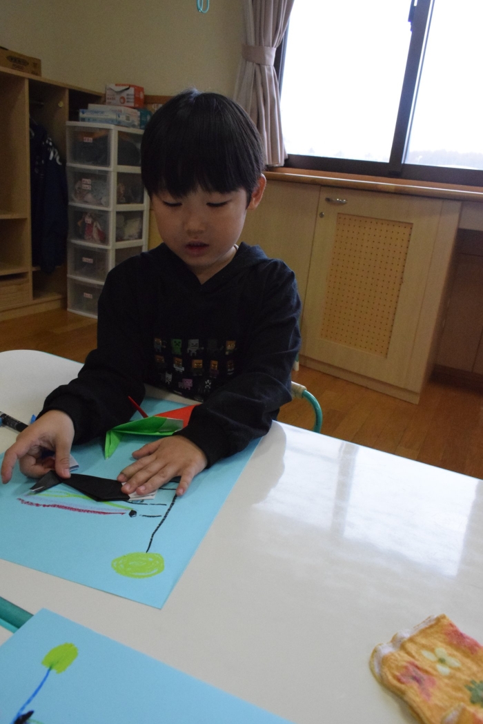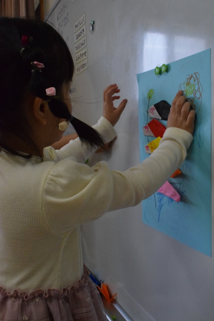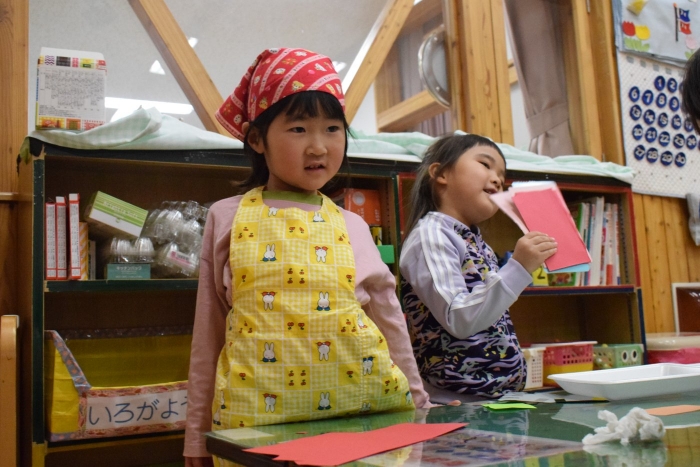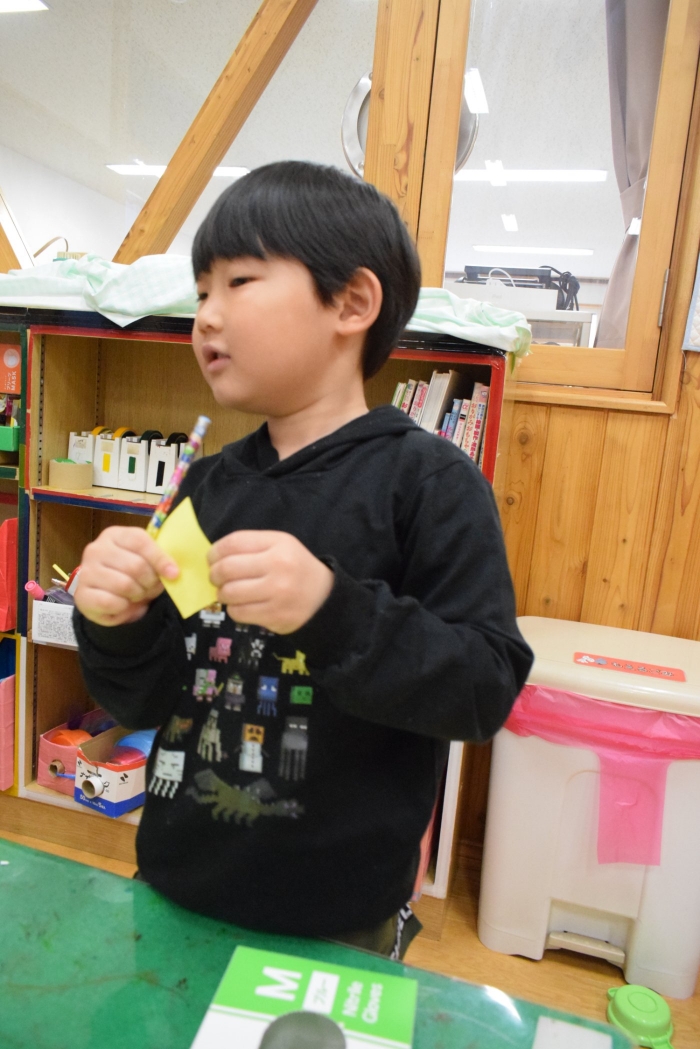 さくら組さんでは,昨日の続きの折り紙製作。昨日お休みしていたお友達も,朝,お部屋で先生と一緒に折り紙を折っていました。
