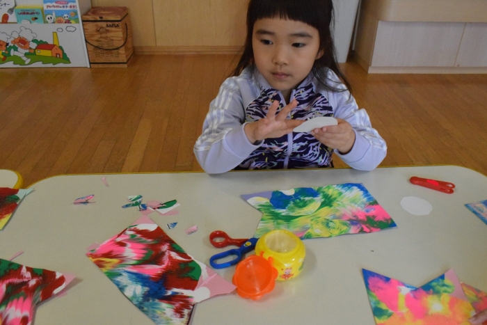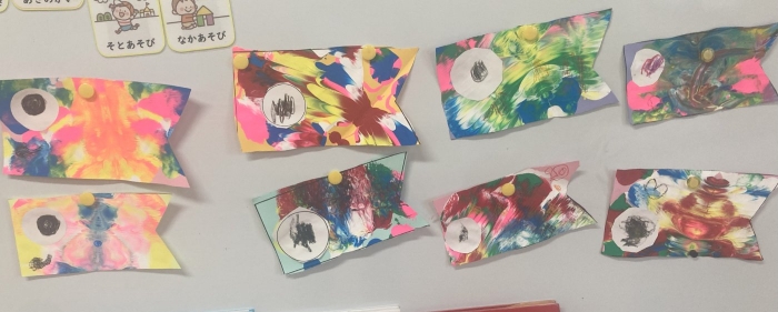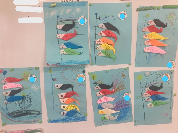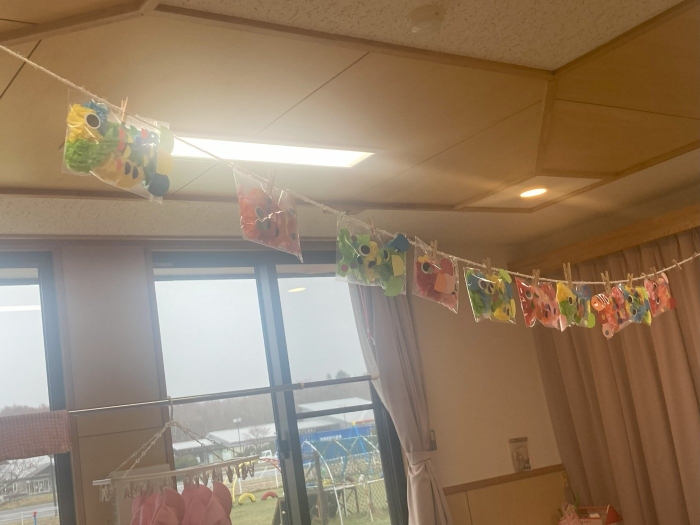 うめ組さんのお部屋でも,先日お休みだったお友達がこいのぼり製作中。他のお友達も,また作りたくなって,一緒に作っていましたよ。