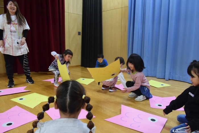 風邪流行中のため,今日は一日室内遊びとなりました。もも組さんの昨日の参観日でお母さんと一緒に遊んだこいのぼりめくりゲームを楽しんでいましたよ。