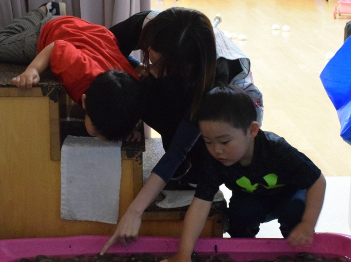 海水につけて砂出し中のあさりを見ています。水が出てくる様子がおもしろい