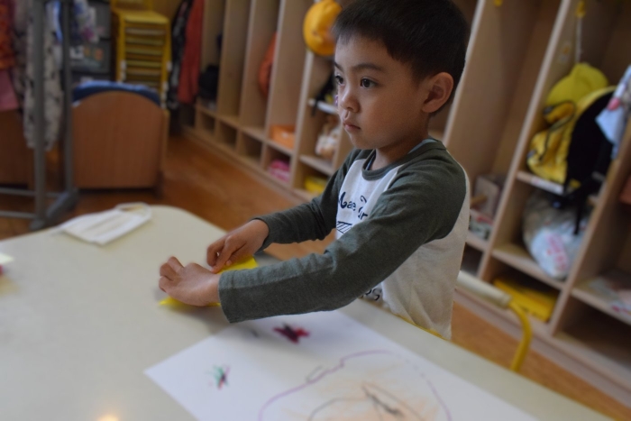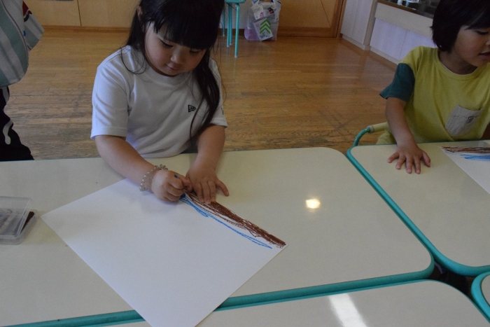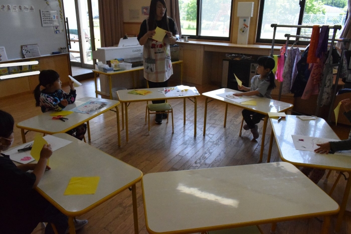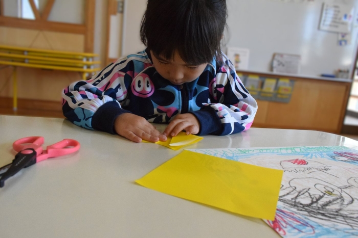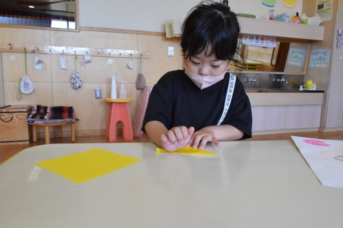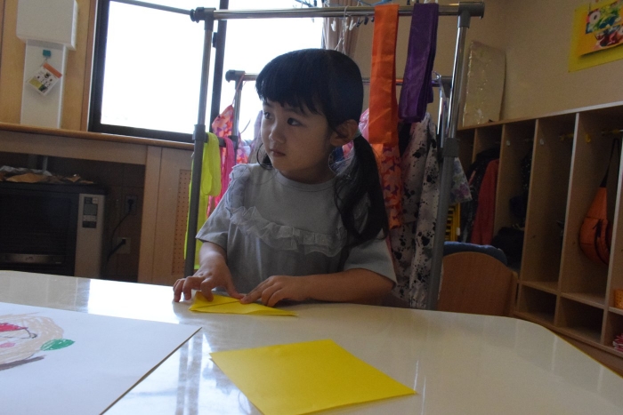 もも組さんは父の日のプレゼントの折り紙製作の様子