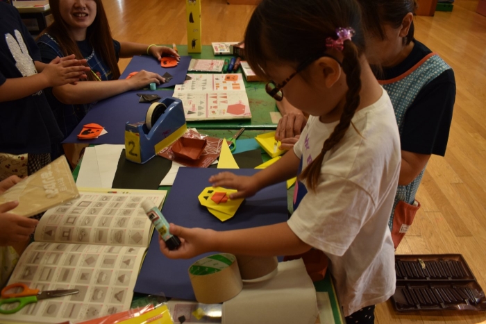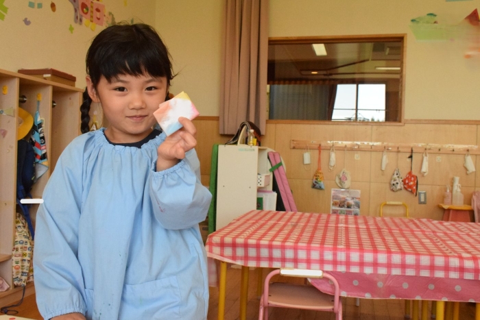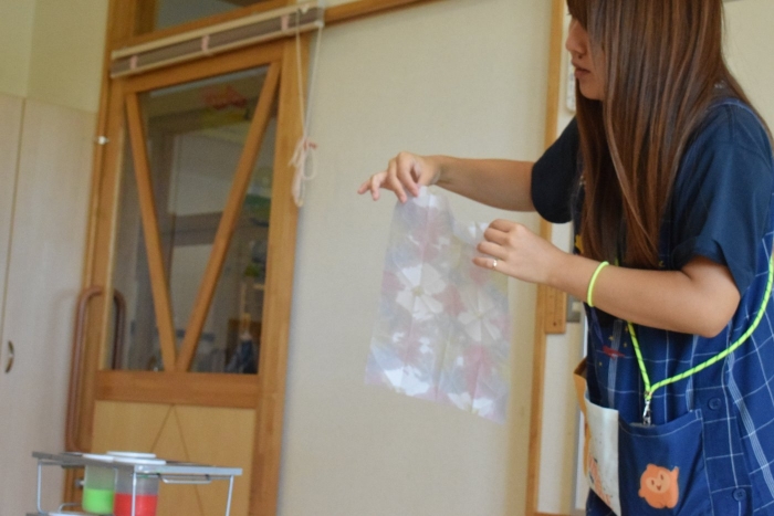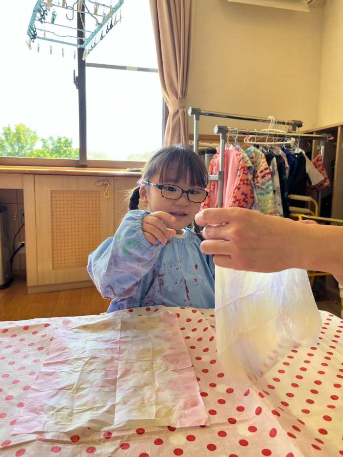 この後,自分の染紙をそーっと開くと,淡いきれいな模様・・・・。模様ができていることの不思議さと,色のきれいなことに驚いたり,感激していたそうです(*^-^*)