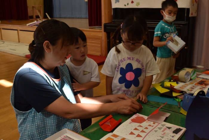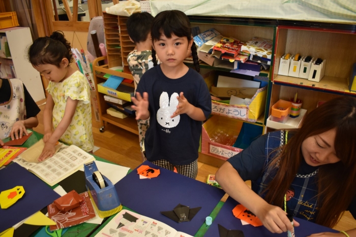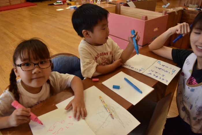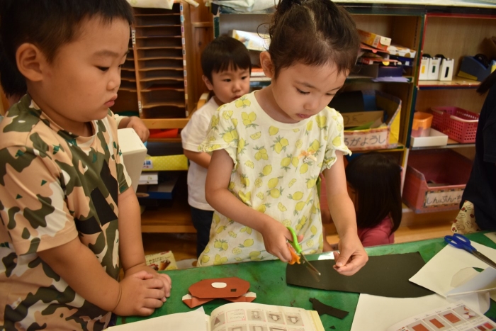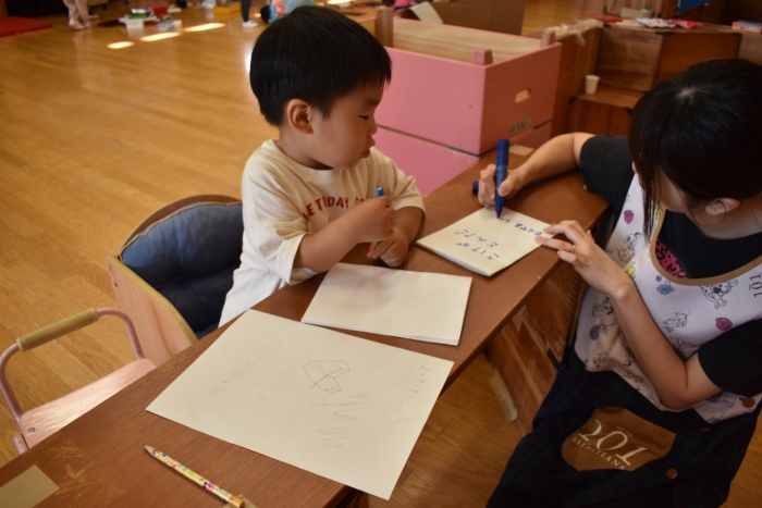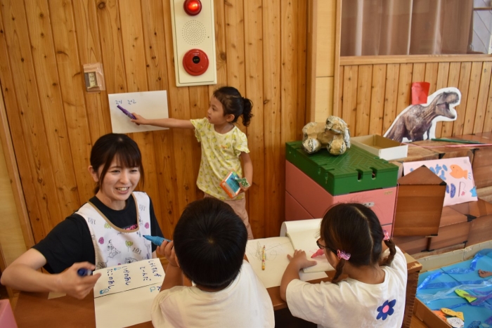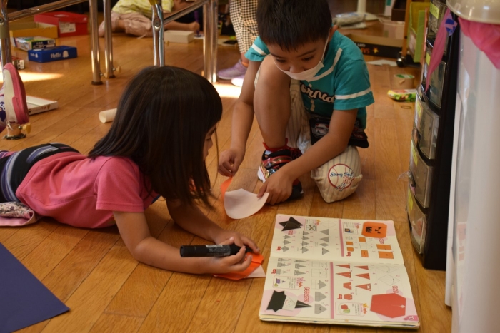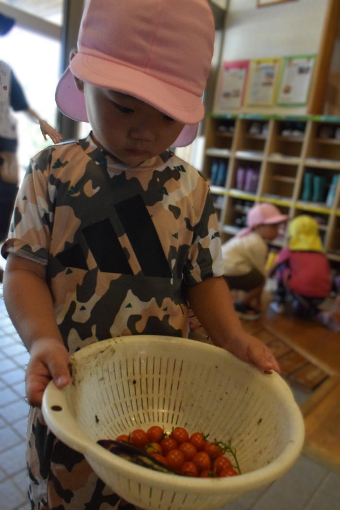 火曜日は,2学期から積極的に取り入れようと先生方で考えていた「縦割り保育」を予定しています。名付けて「T」の日です。(安易ですが・・・)今日も、うめ組ともも組は合同保育を行いましたが,定期的に3クラスの縦割り保育「T」を行うことで,同年齢クラスでは得にくい育ちが得られるのではと考えています。先生たちも楽しみにしています(*^-^*)