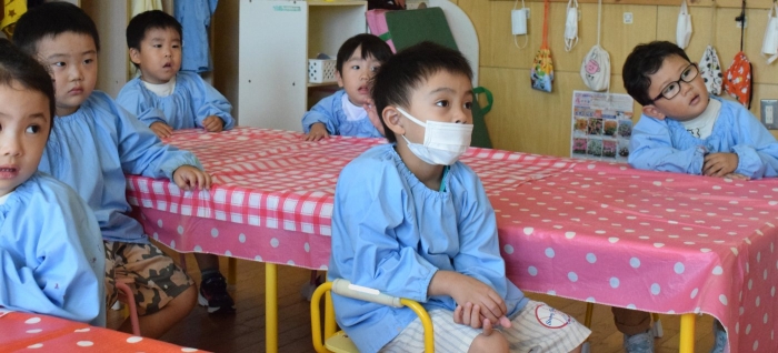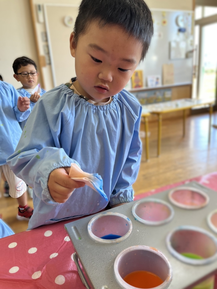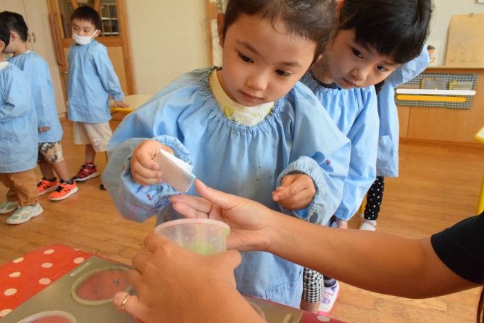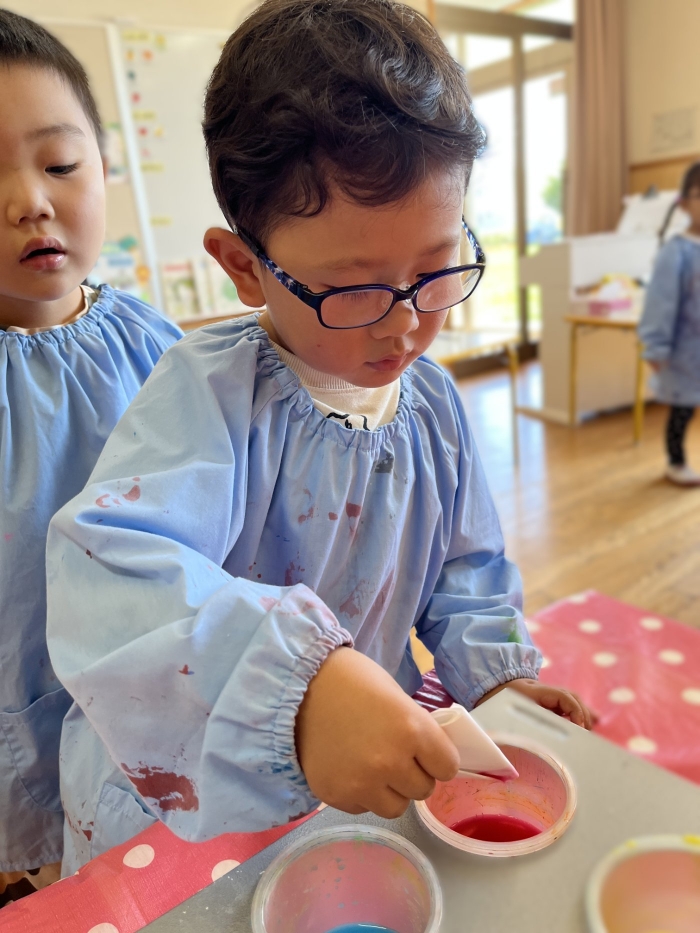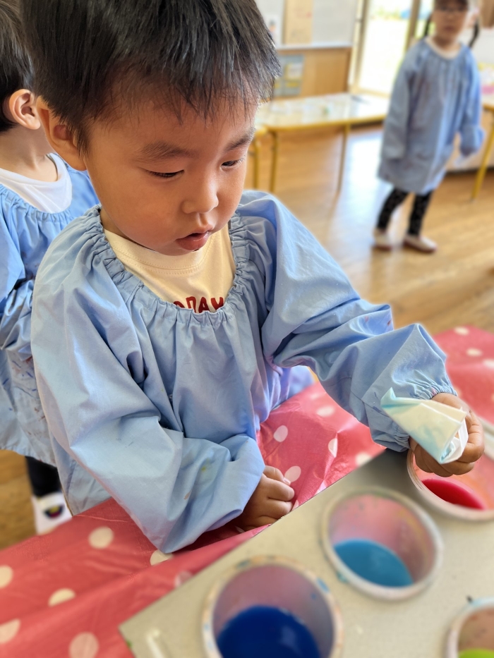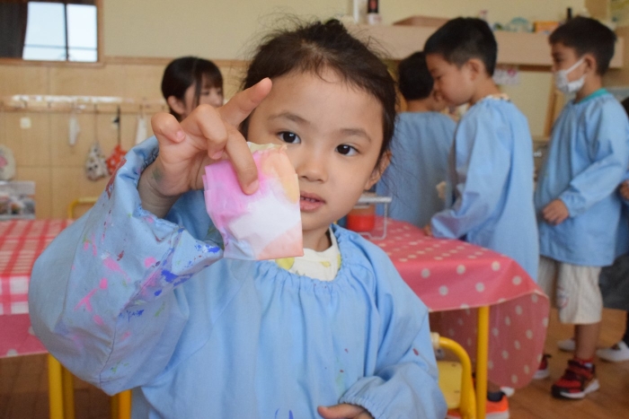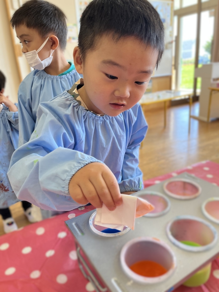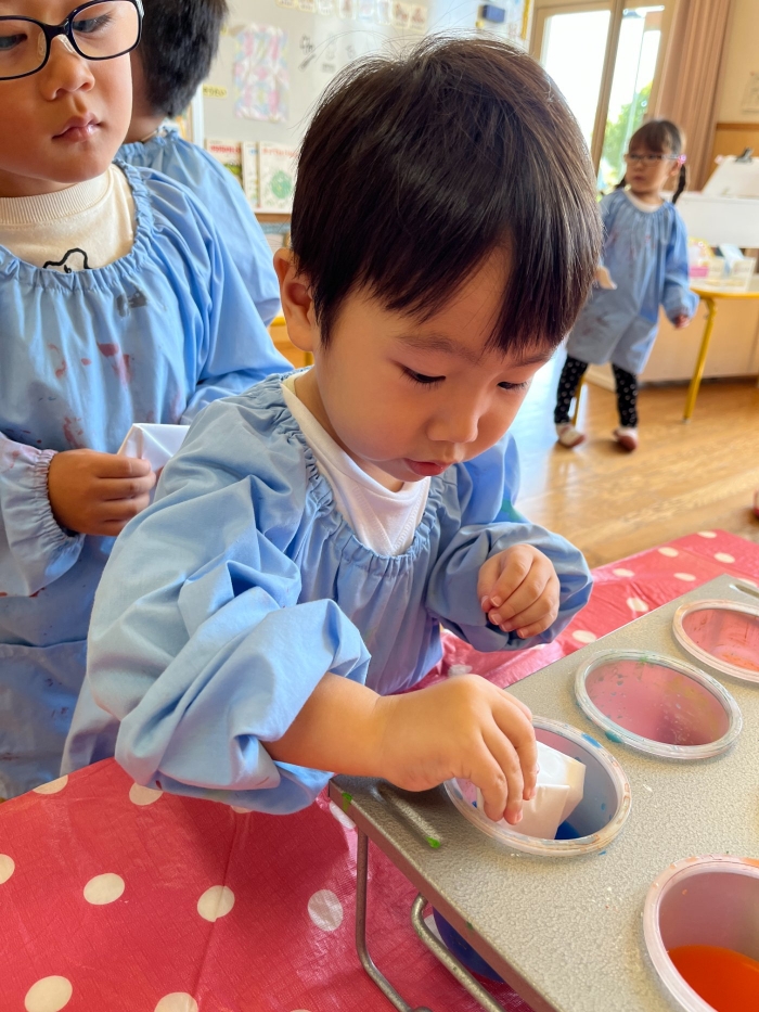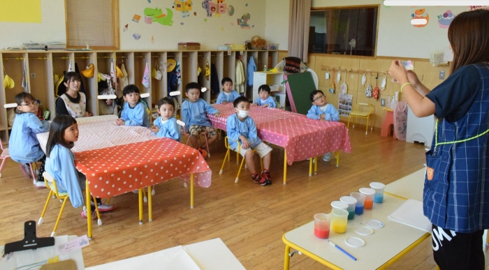 今日は2クラスだけのため,合同保育とし,そして一緒にクラスで「染紙」の製作を行っていました。絵の具を使うのでみんなでスモックを着て,まずは先生の説明を見て聞いています。製作中の写真のみご紹介します。
