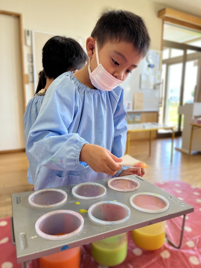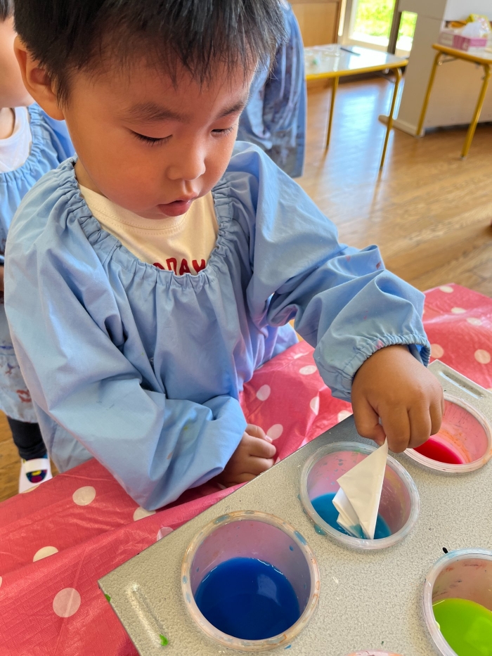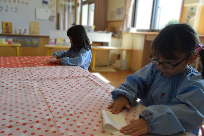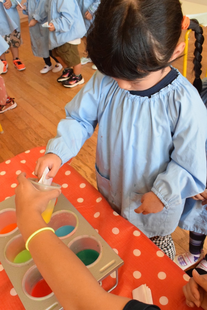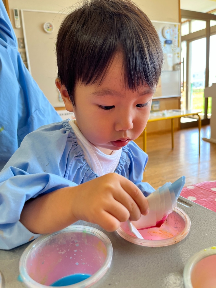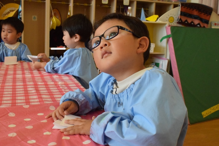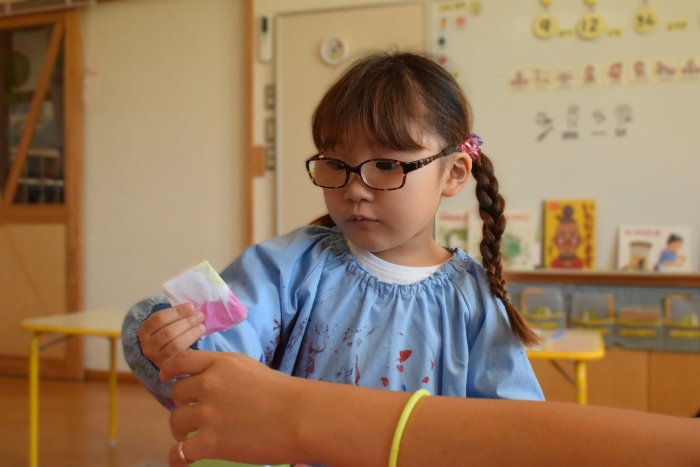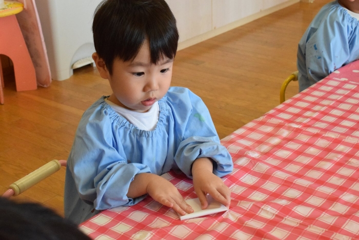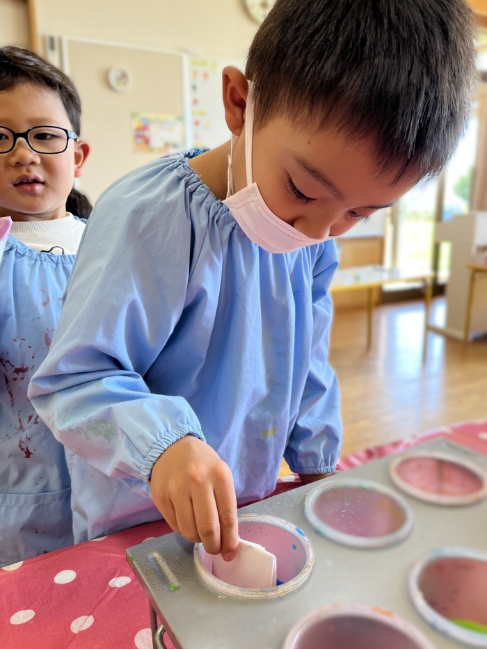 今日は2クラスだけのため,合同保育とし,そして一緒にクラスで「染紙」の製作を行っていました。絵の具を使うのでみんなでスモックを着て,まずは先生の説明を見て聞いています。製作中の写真のみご紹介します。