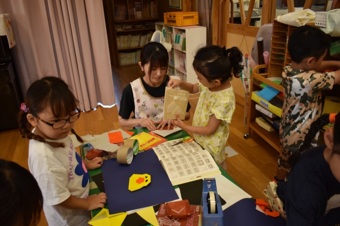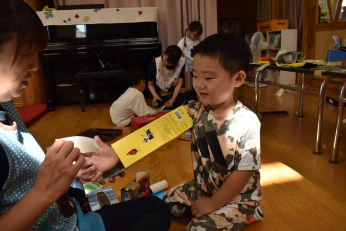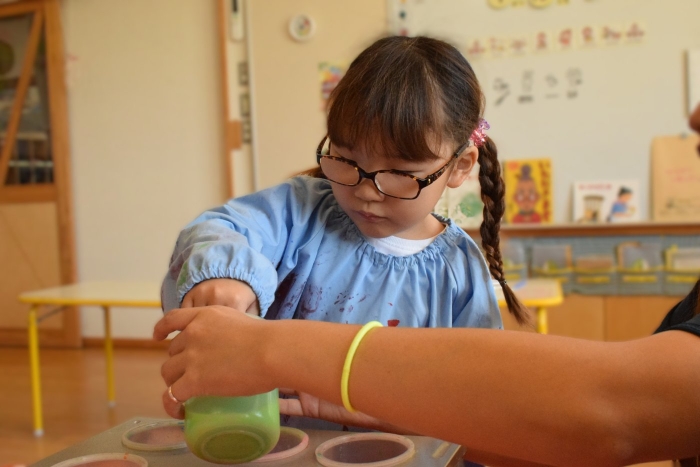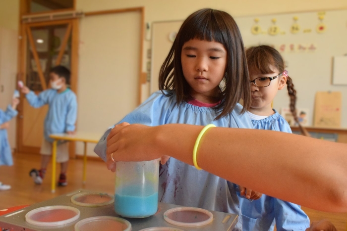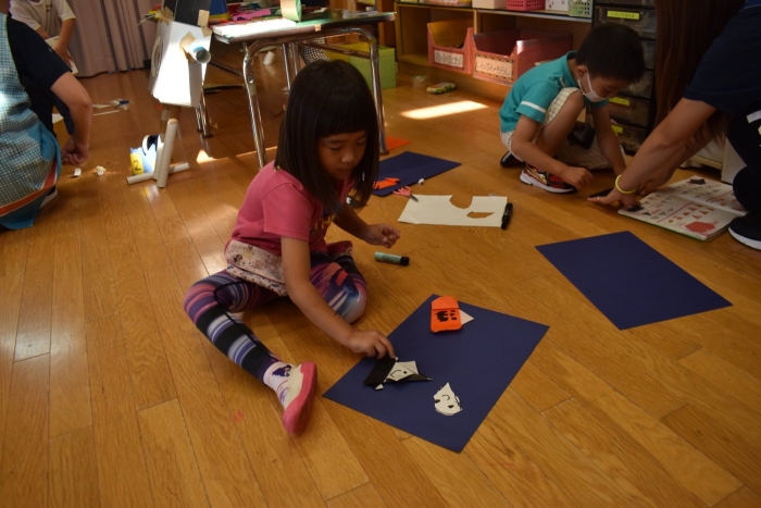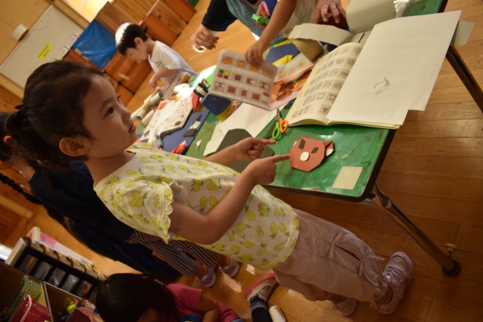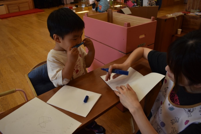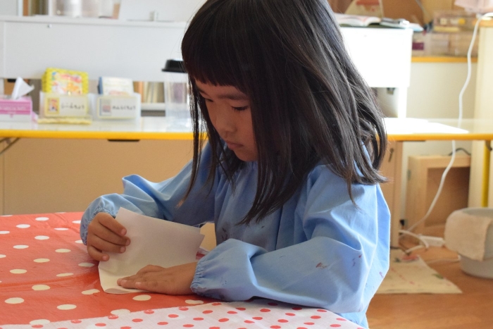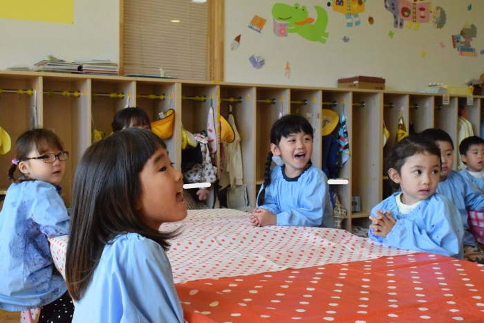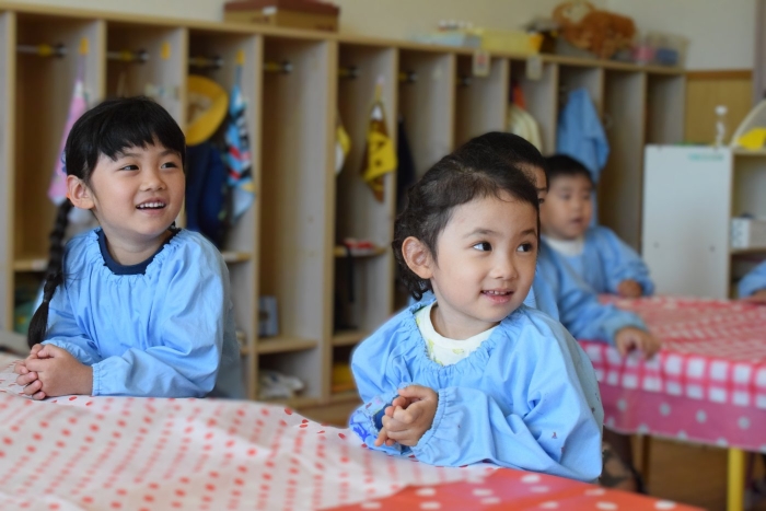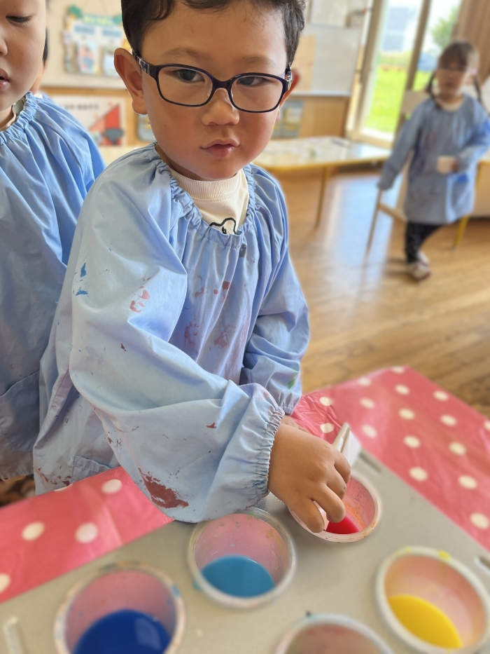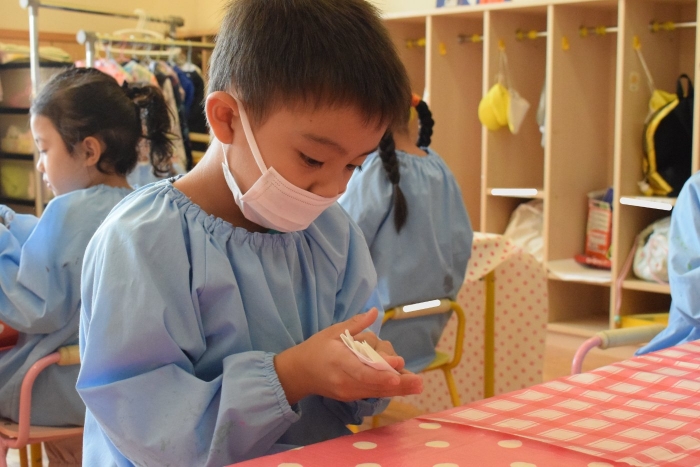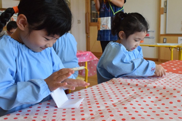 今日は2クラスだけのため,合同保育とし,そして一緒にクラスで「染紙」の製作を行っていました。絵の具を使うのでみんなでスモックを着て,まずは先生の説明を見て聞いています。製作中の写真のみご紹介します。
