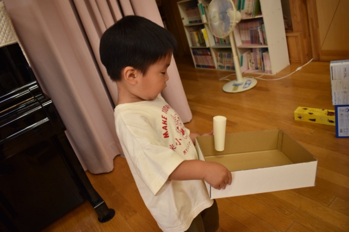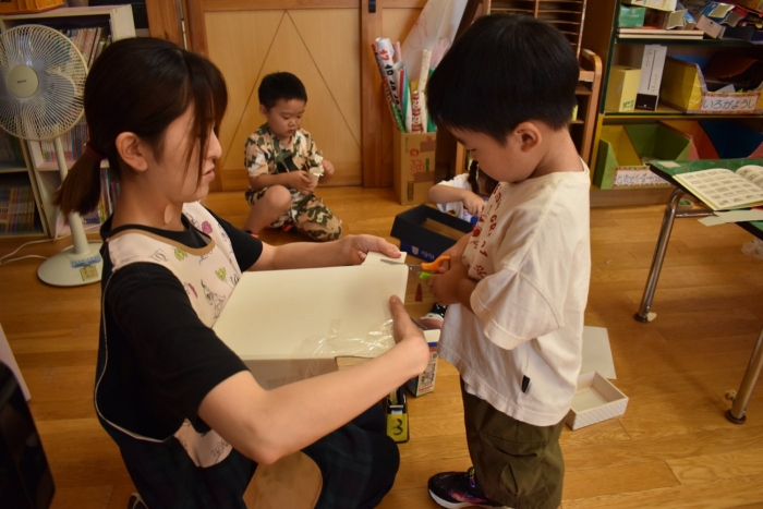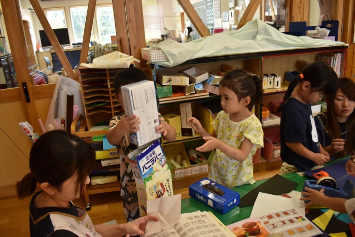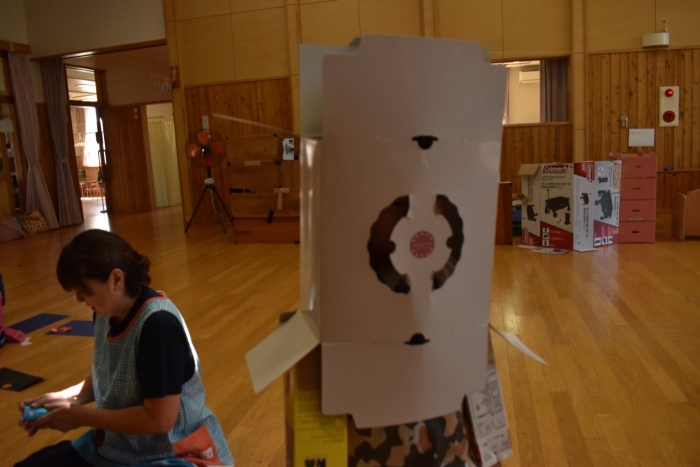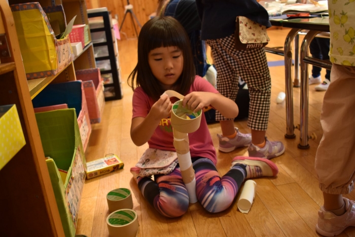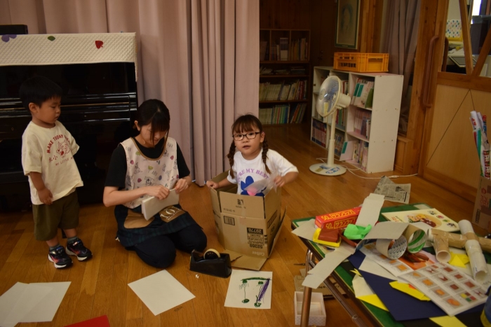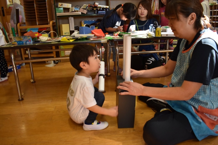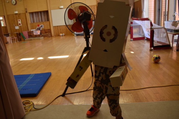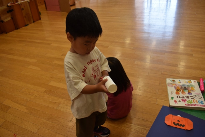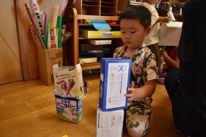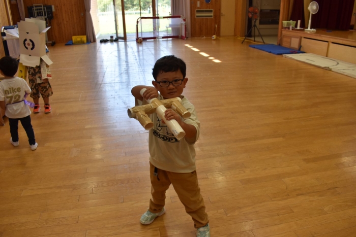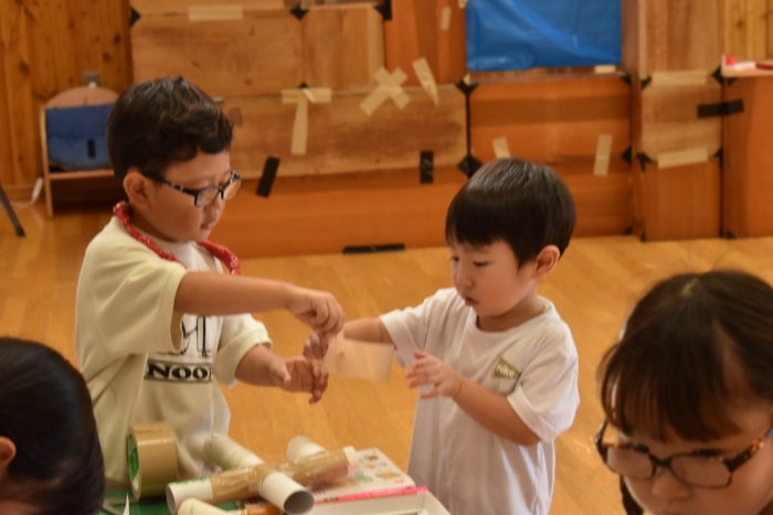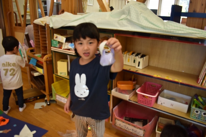 さくら組さんが親子学級レクでバスで出発し,今日はうめ組ともも組だけの幼稚園となりました。幼稚園のリーダー的なさくら組さんがいないことで,普段より静か(?)な幼稚園。「さくらさんだけ,いいな~」「一緒に行きたかったな~」という声ももちろんありました。そして,いつもならさくら組さんと一緒にサッカーもしていたことで,ちょっと物足りないなという様子も。また,さくら組のお兄ちゃんを見送った,うめ組の弟くんも最初はしょんぼりしていたり・・・などの姿があったのですが,さくら組のいない普段と違った幼稚園も,なかなか新鮮だったみたいで,朝は制作などにじっくり取り組むお友達も多く,遊びに使うアイテムの大作もたくさん作り上げ,楽しむことが出来たようです。よかったです(^^)