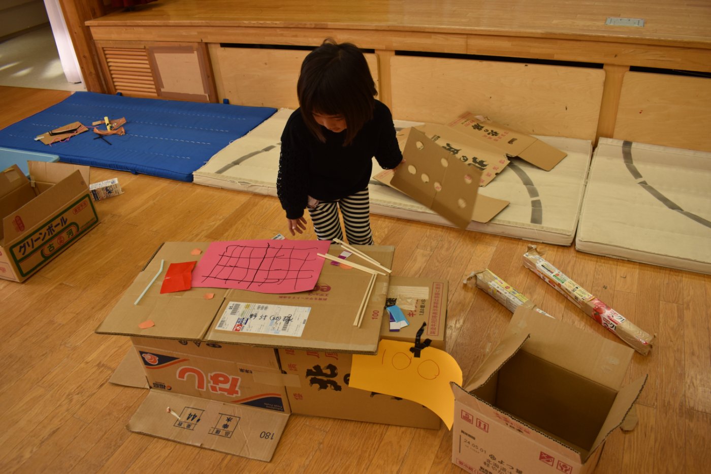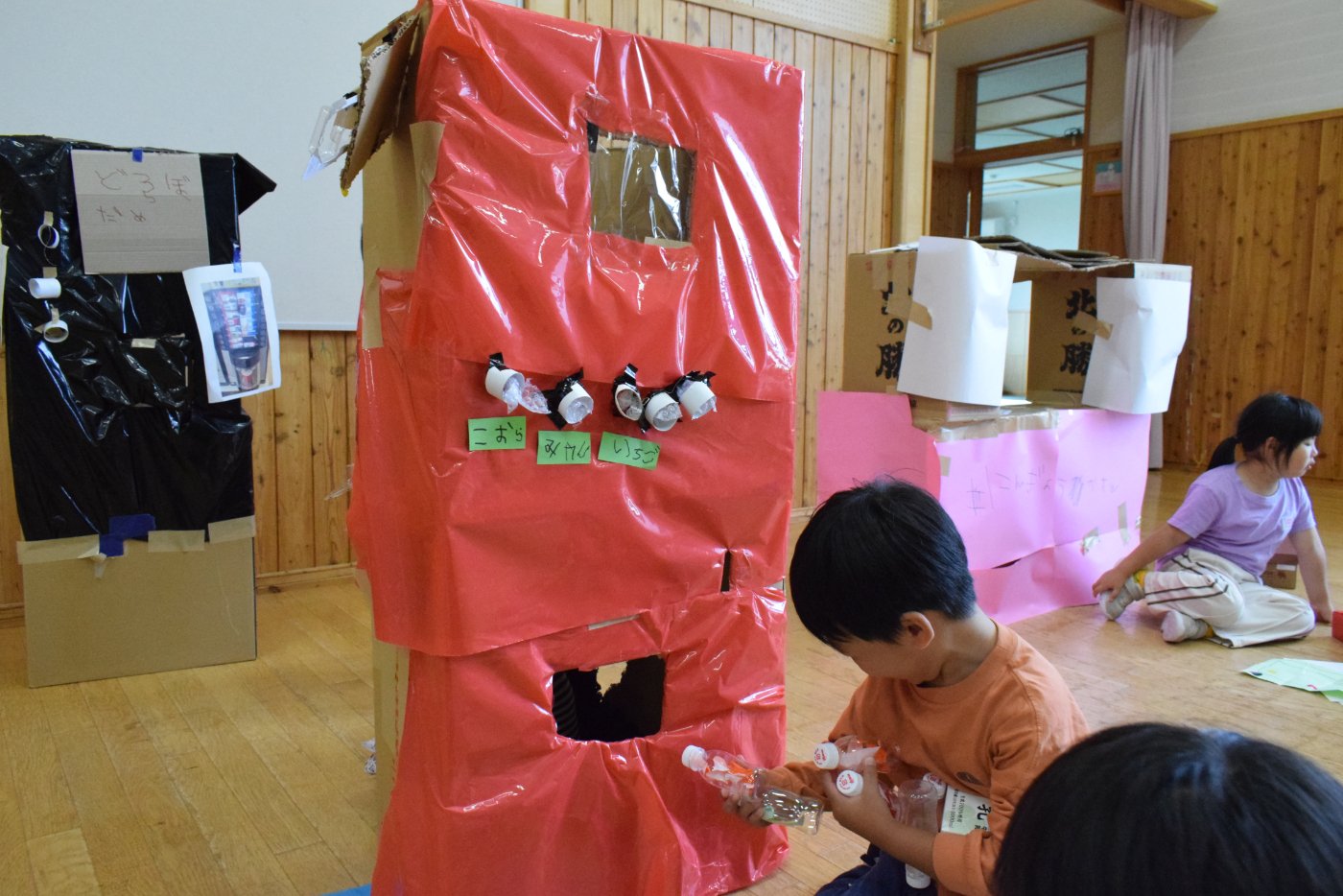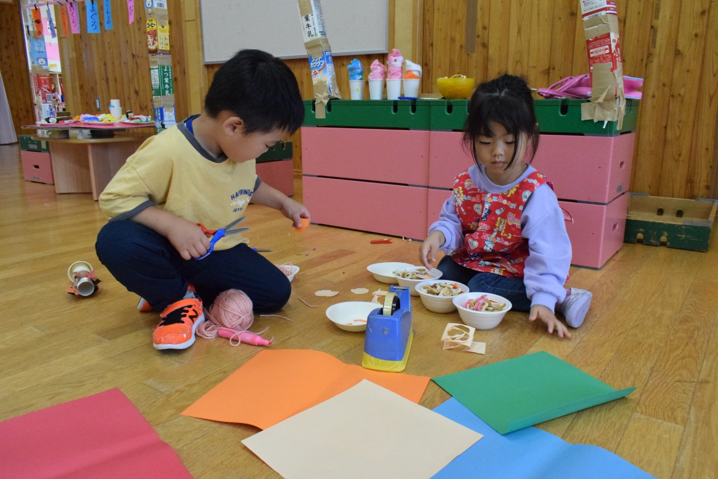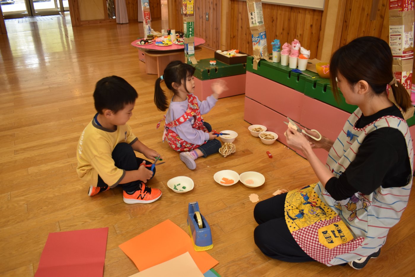 今日もお祭りとお店屋さんごっこに取り組む子どもたちの姿がありました。お祭りのお店の品物を作ったり,お店の建物を作ったりすることを, じっくり楽しむ子もいれば,準備は大急ぎで済ませて,早くお店をオープンしたい!という子もいます。そのため,遊びの進め方も,自分の思いだけではなく,ちゃんと友達の意見も聞いたうえで, どうやって行うかを考えることが必要になってきます。イメージしたことが実現できないと,あきらめてしまったり,すぐに新しいものに目移りしたりすることもあるようです。友達とお祭りやお店のイメージで,役になりきったりやり取りを楽しんだりし,いろいろな工夫もしたりする姿も見られます。