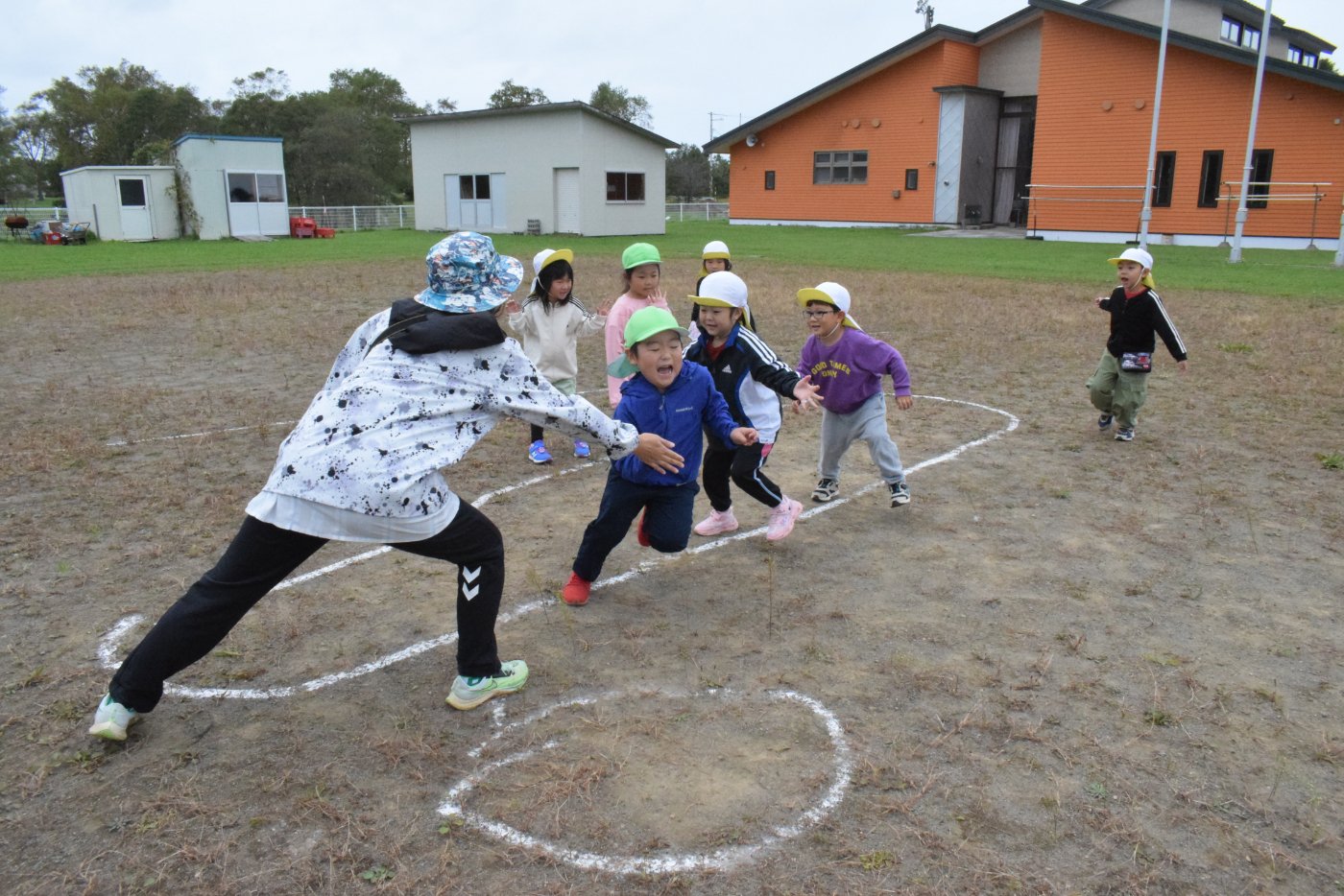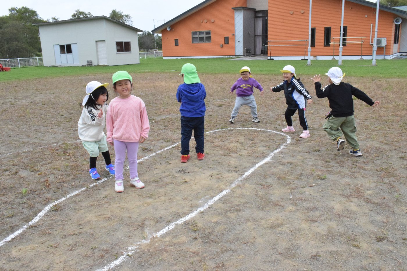 お引越しゲームでは,さくら組さんの逃げ方が上手で,なかなか捕まえられないため,今日はもも組さん5人が鬼になって,さくら組さん7人に勝負を挑んだようです。さくらさんが7人で,鬼のもも組さんが5人・・・ということで,「それじゃあ負けちゃうかも」と嫌がっていたさくら組さんもいたようでしたが,もも組さんの熱意に負けて勝負を受けることになりました。