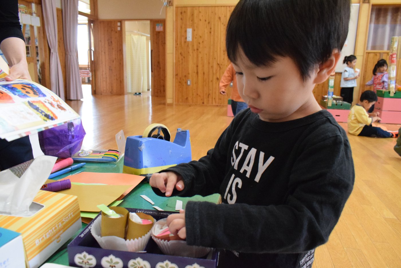 プレイルームの中は,オープンしているお店と,色々準備中のお友達が,それぞれ楽しんでたようです。明日は,今日の遊びをもっと楽しもうとするのか,それとも次はこうしてみよう!と違った方向に行く可能性も?今取り組んでいることを自分たちで楽しんで,満足できるといいですね。