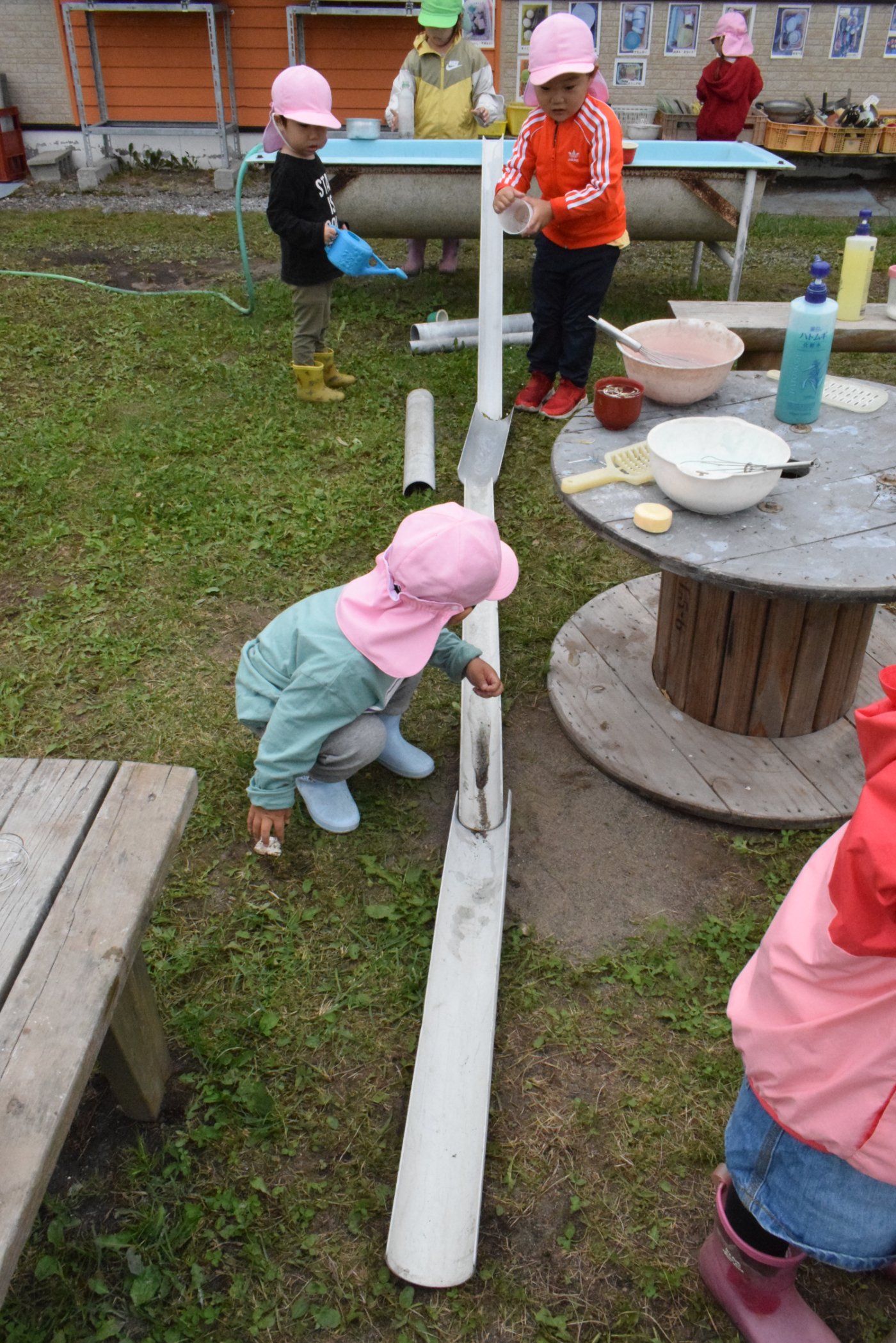 今日は,芝生の上に置いてあった,テーブル代わりのコードリールの場所をずらしたのですが,コードリールの下敷きになっていた草が,日が当たらずひょろひょろの白い「もやし」のようになっていることに気づき,「もやしだ~」と,みんなで喜んでとっていました。