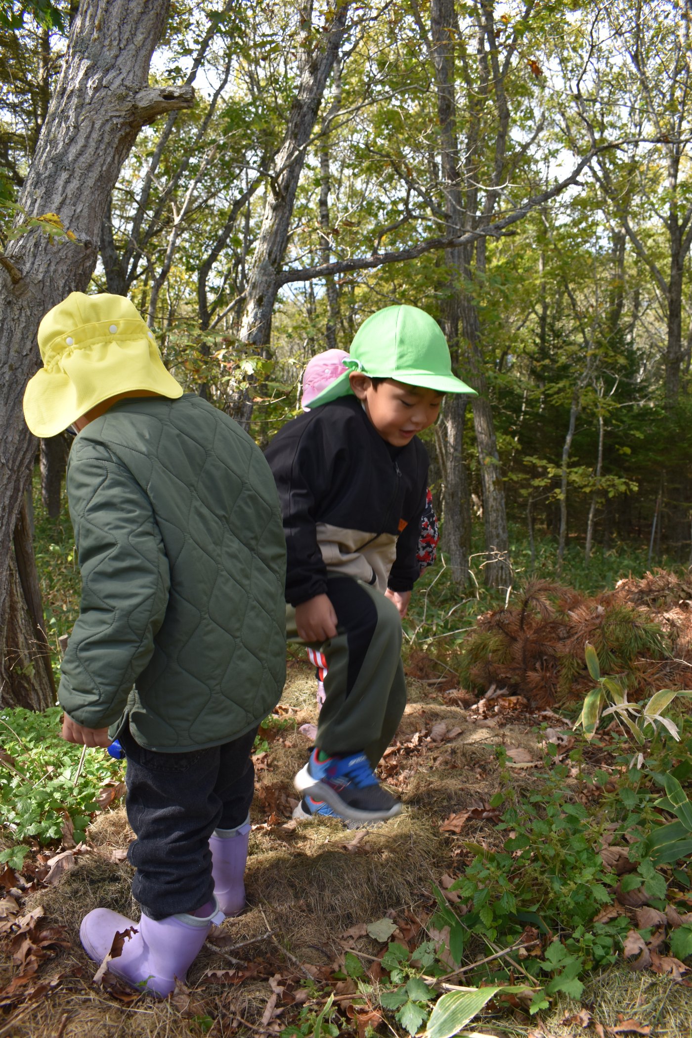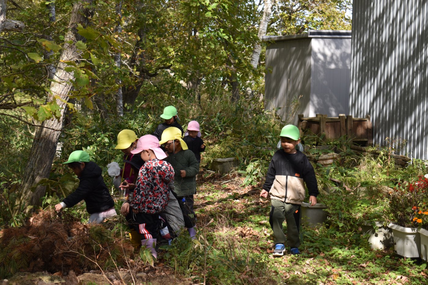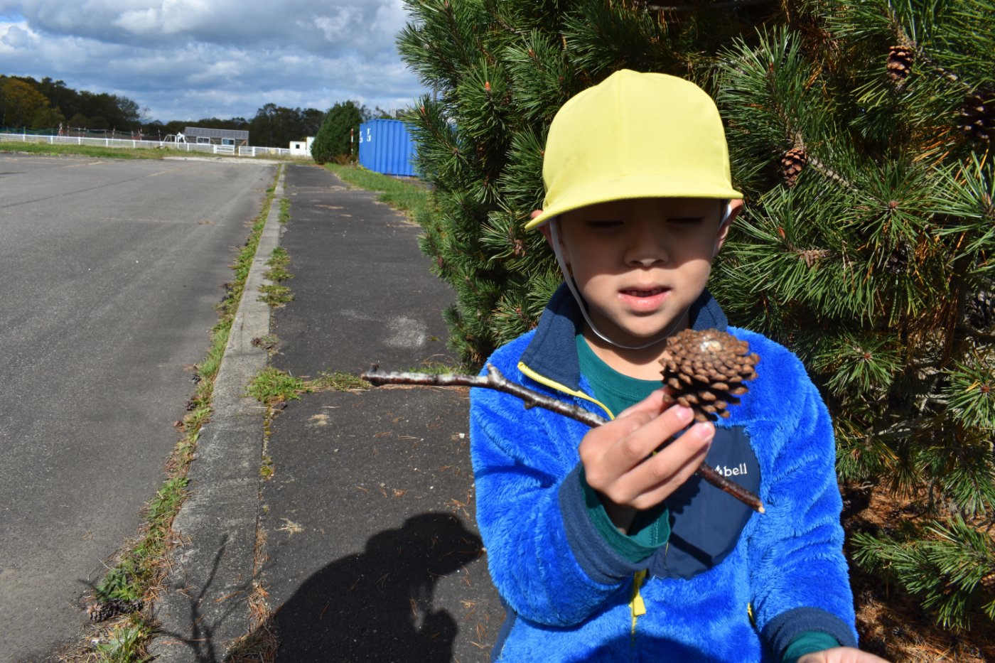 避難訓練の後は,Tクラスでの散策へ出かけました。前回,みんなで散策に出かけた時に,どんぐりがほとんど落ちていなかったことで,「もっとどんぐりを見つけたい」という声があがったようです。今日は支所の裏の方に出かけてきました。今日も気持ちの良いお天気で,Tクラスのお友達と手をつないで,ペットボトルを切った入れ物を持って,はりきって出かけました。