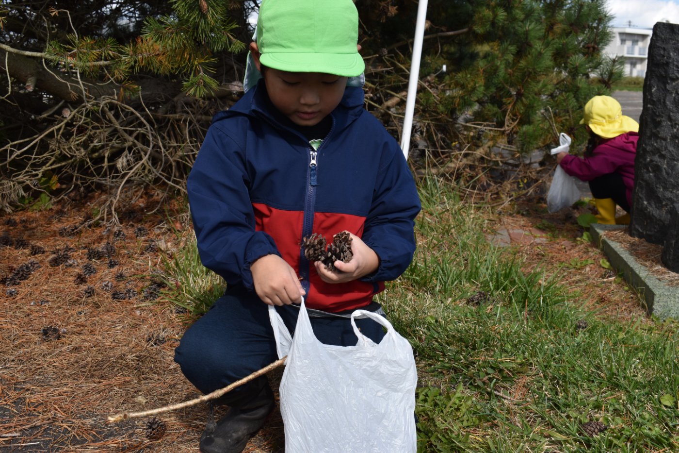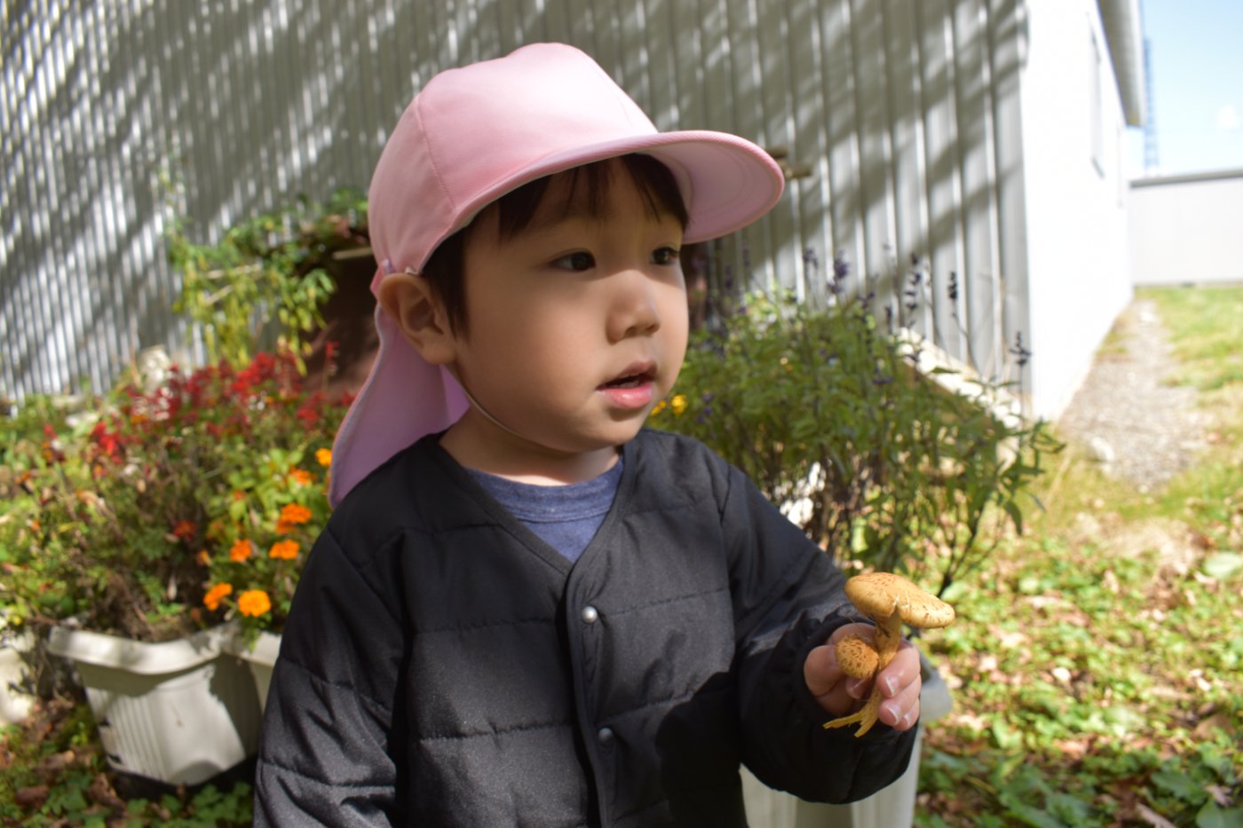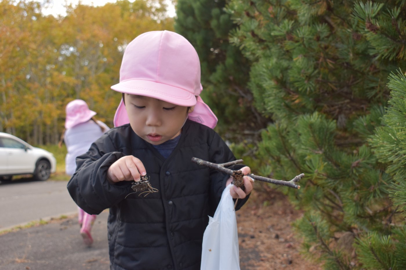 避難訓練の後は,Tクラスでの散策へ出かけました。前回,みんなで散策に出かけた時に,どんぐりがほとんど落ちていなかったことで,「もっとどんぐりを見つけたい」という声があがったようです。今日は支所の裏の方に出かけてきました。今日も気持ちの良いお天気で,Tクラスのお友達と手をつないで,ペットボトルを切った入れ物を持って,はりきって出かけました。