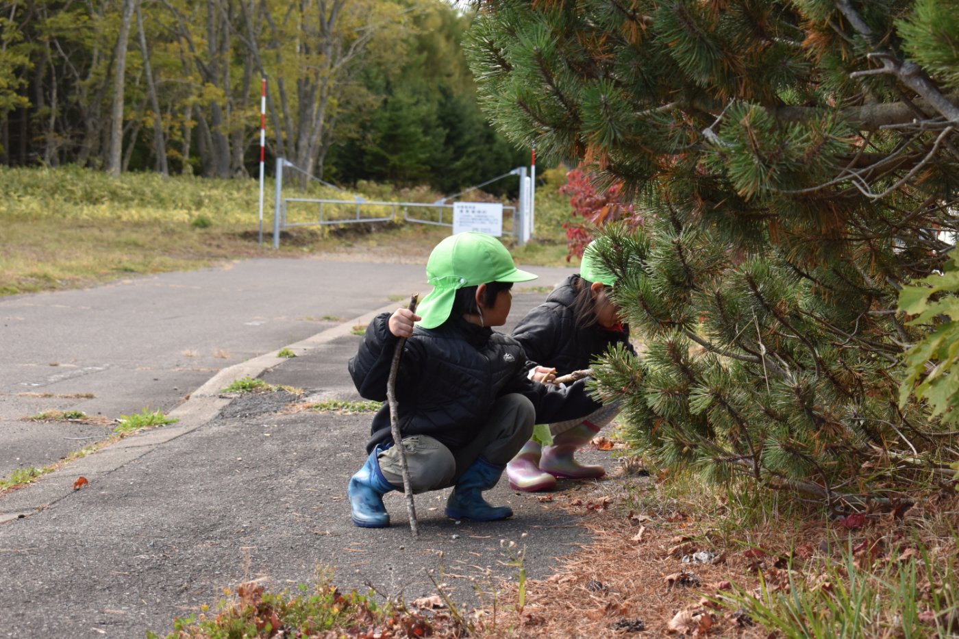 支所の裏の林に着きました。最近,近隣でクマが出没しているとのことですので,ホイッスルを吹いて,クマを追い払っている〇〇〇先生です。