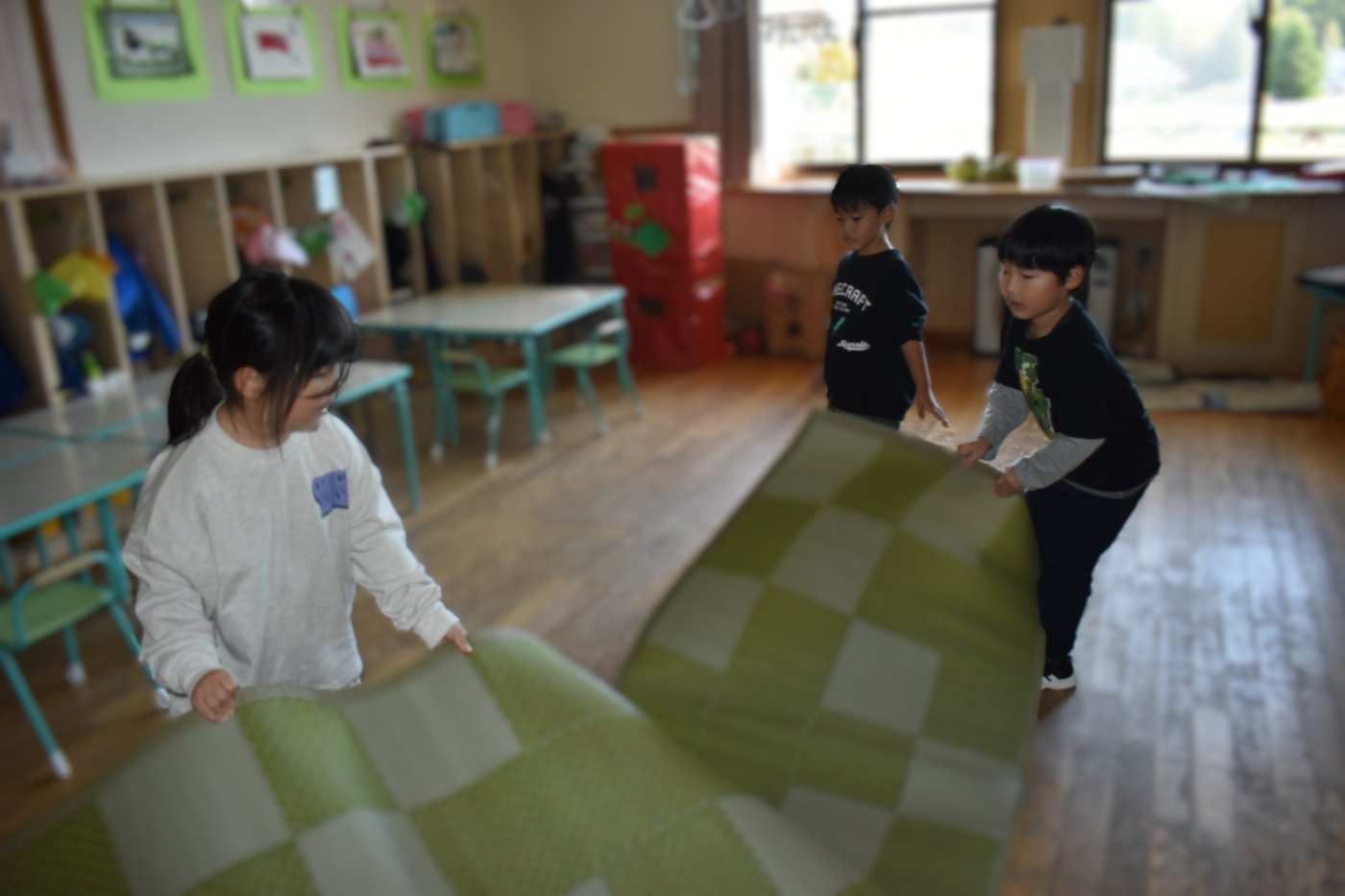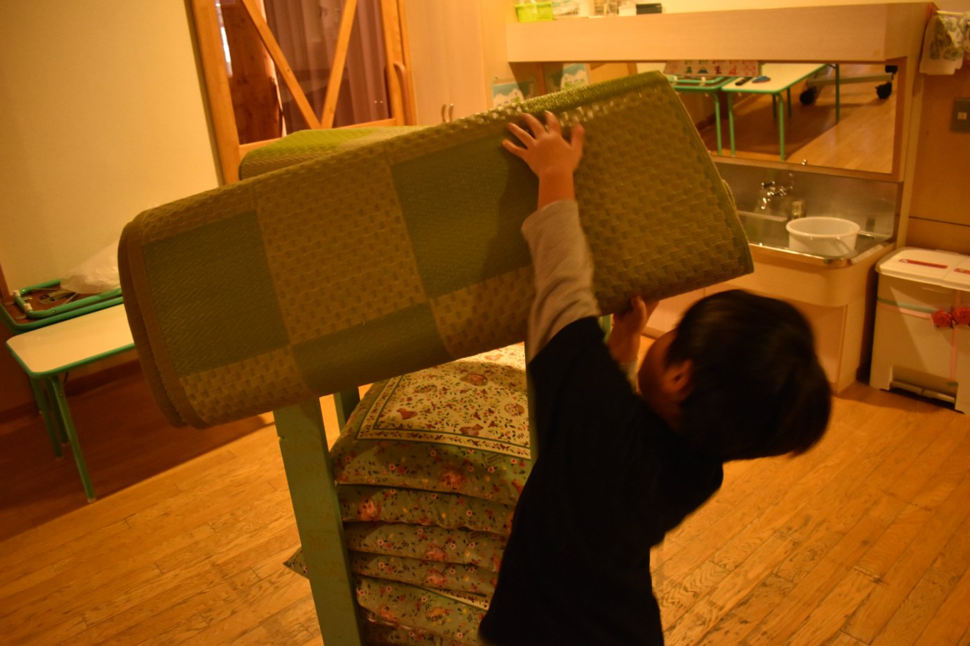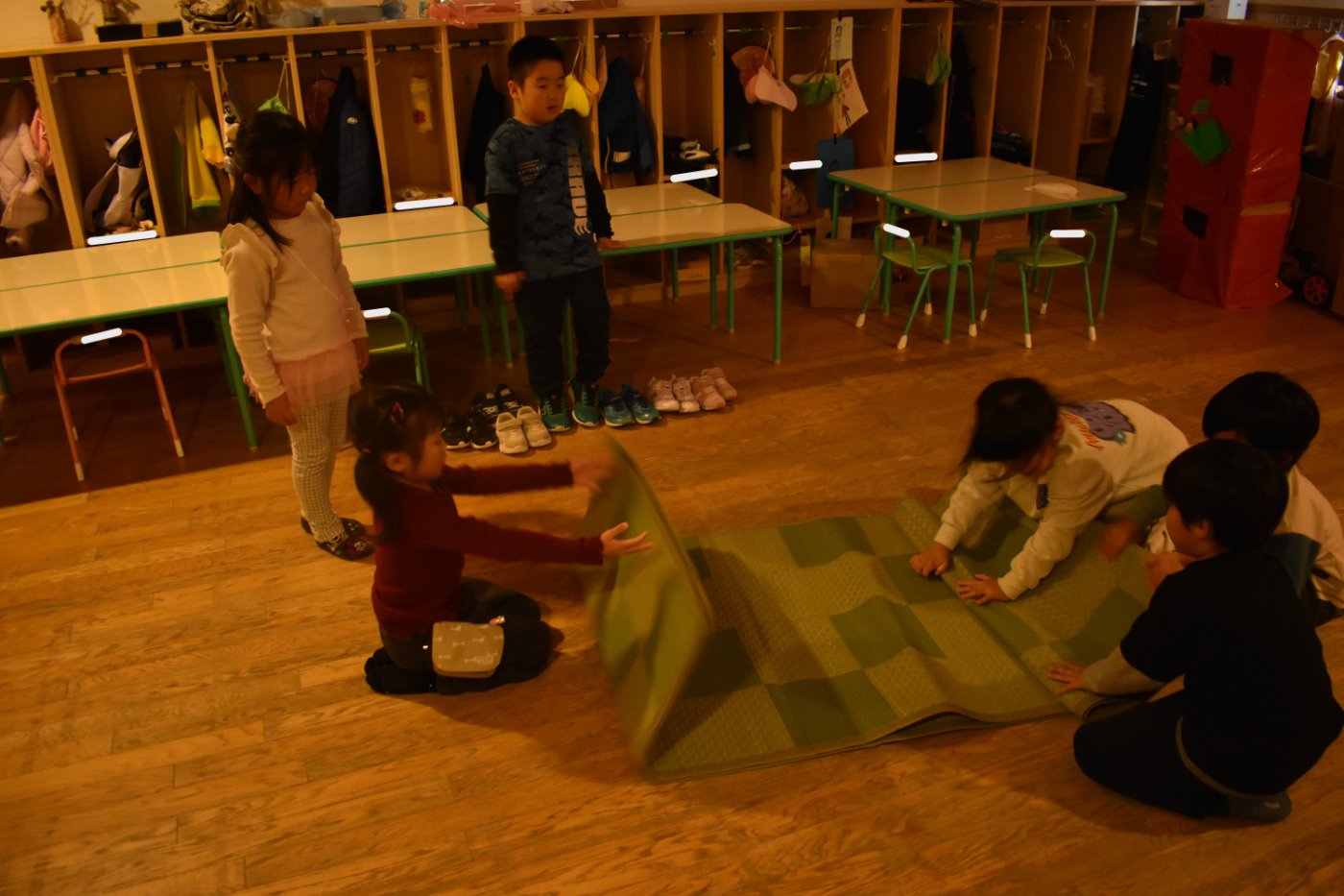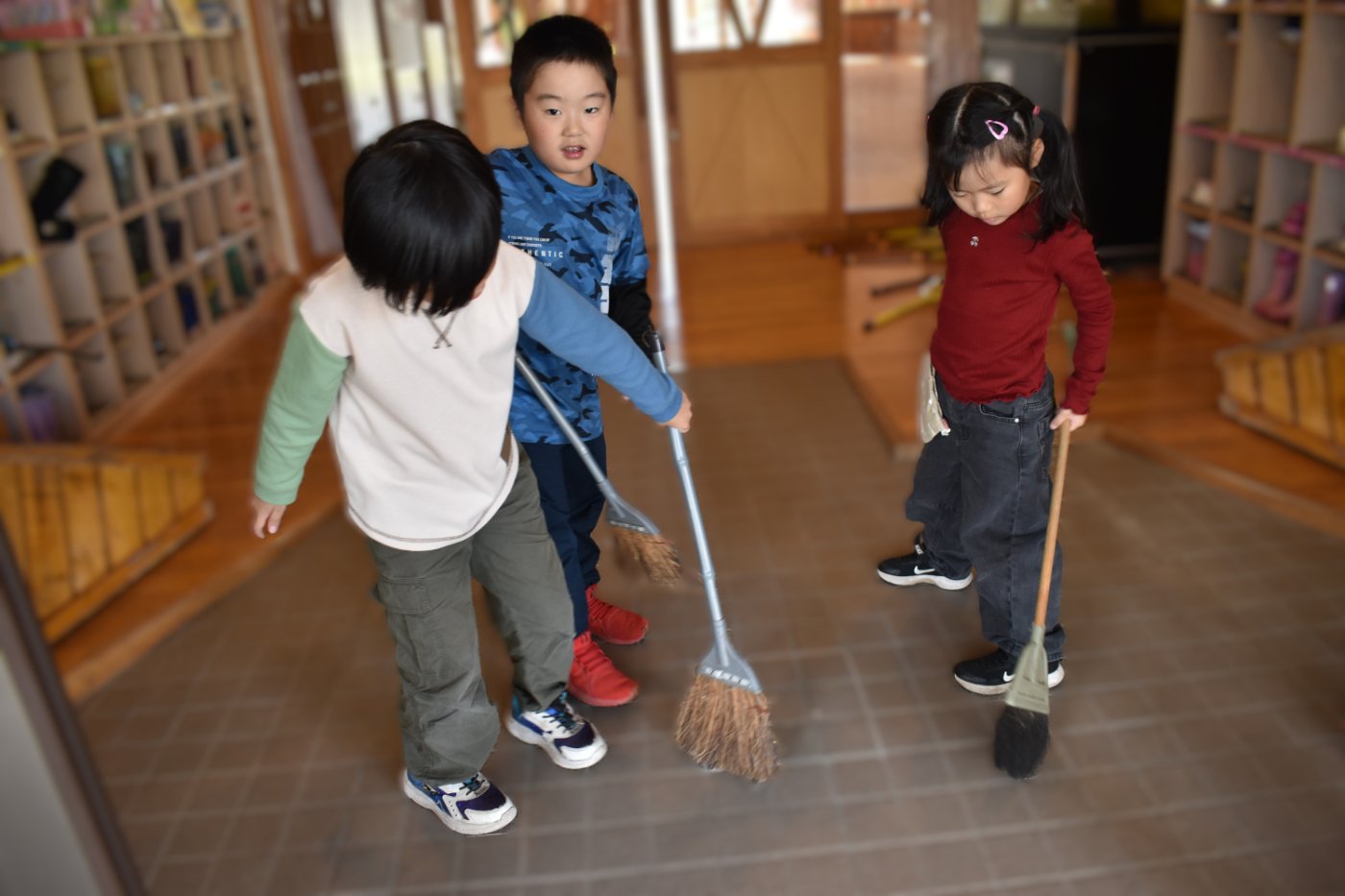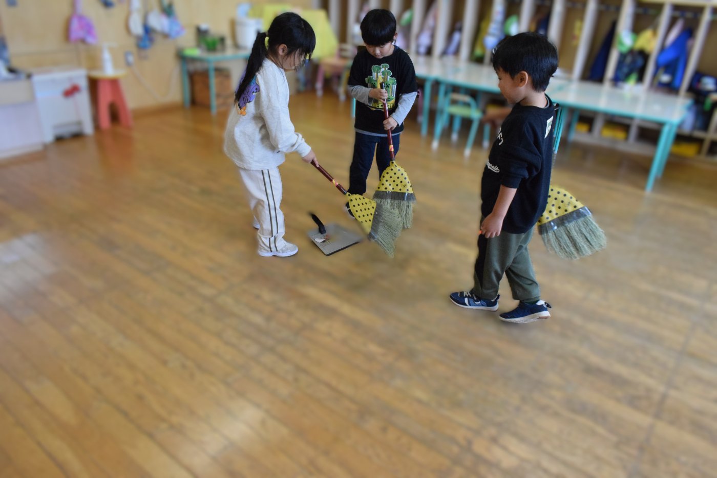 今日はTクラスの日でしたが,うめ組さんともも組さんは今はお昼寝中。さくら組さんは寝ないで,午後活動を行います。今日は2グループで,初めてのお掃除を行いました。