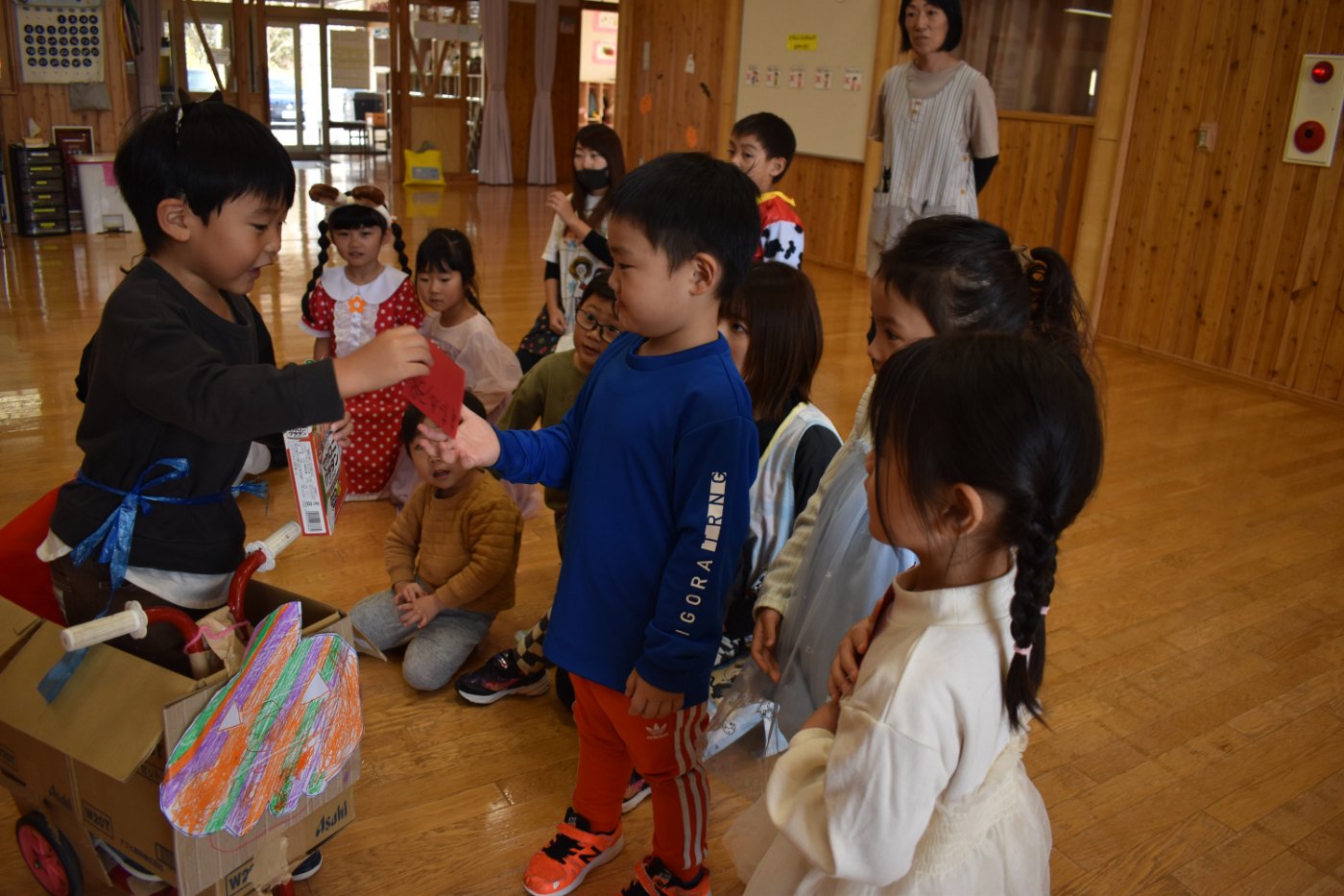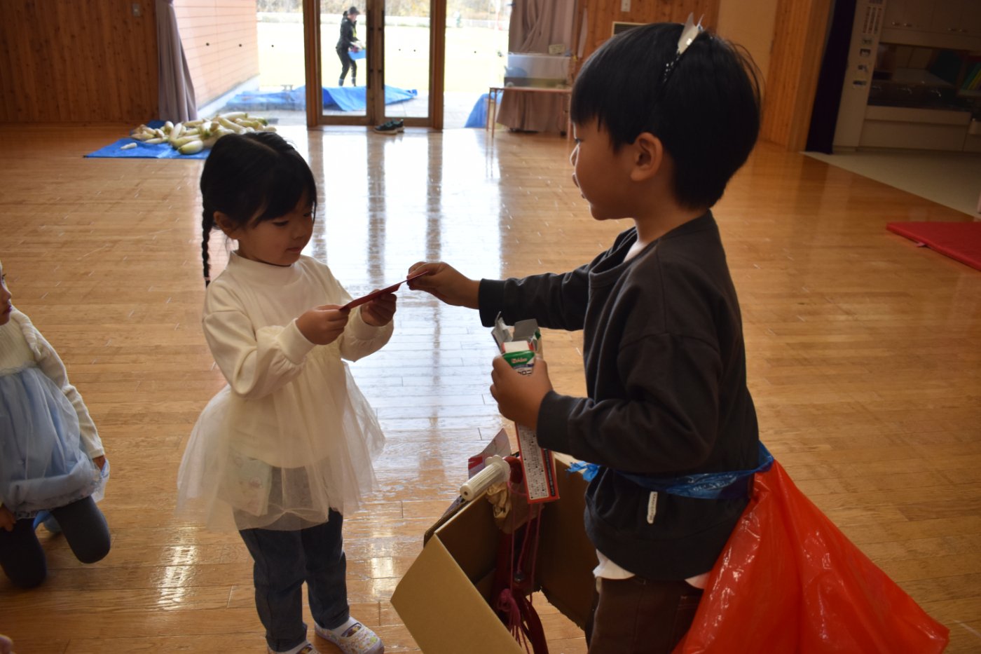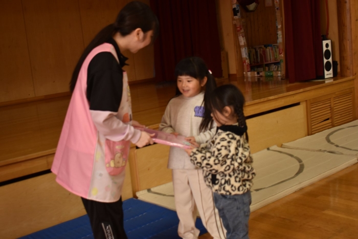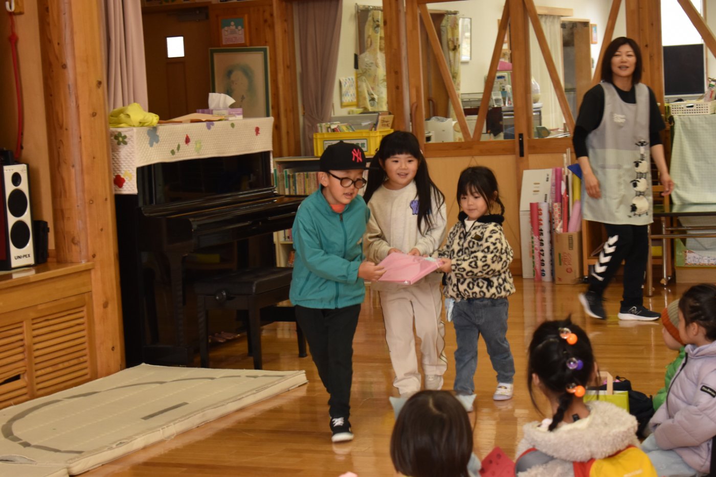 自分たちのアイディアを出しながら友達とコツコツと準備をしてきたさくら組さん。今日のどっきり大作戦part2でうめ組さんともも組さんの喜ぶ顔を見られて,大成功!さくら組さんも満足感を感じていたようです。うめ組さんともも組さんはpart1に続いてさくら組さんの企画に,今回もとても喜び,そしてさくらさんってすごいね,と憧れを感じていました。おもてなししてくれたさくら組さんの気持ち,しっかりと届いていたようです!さくら組さんお疲れ様でした(^^)