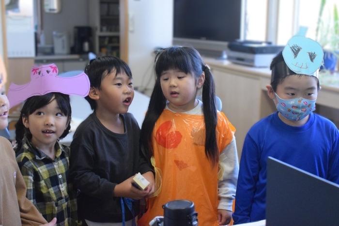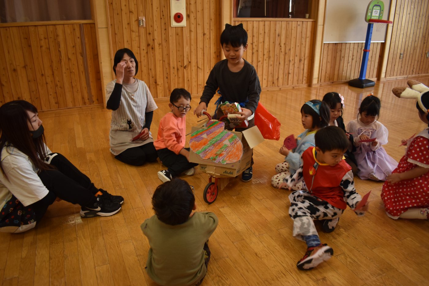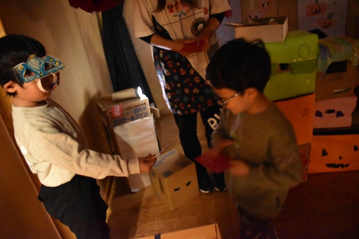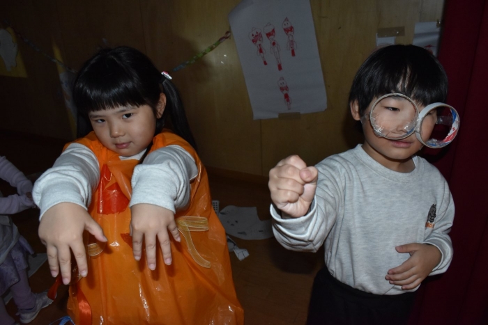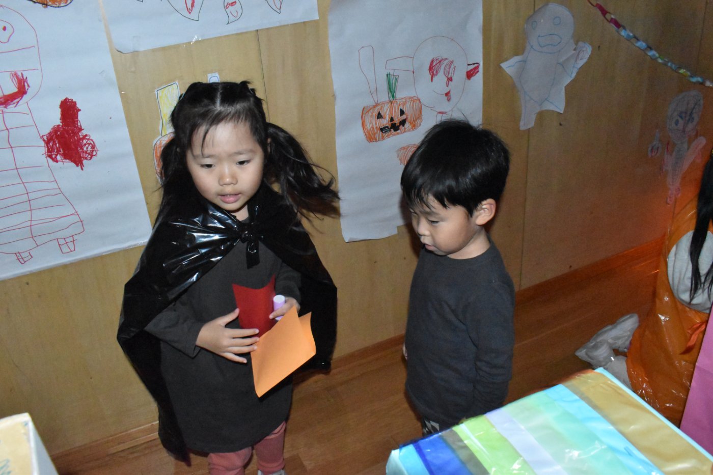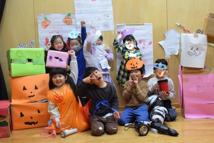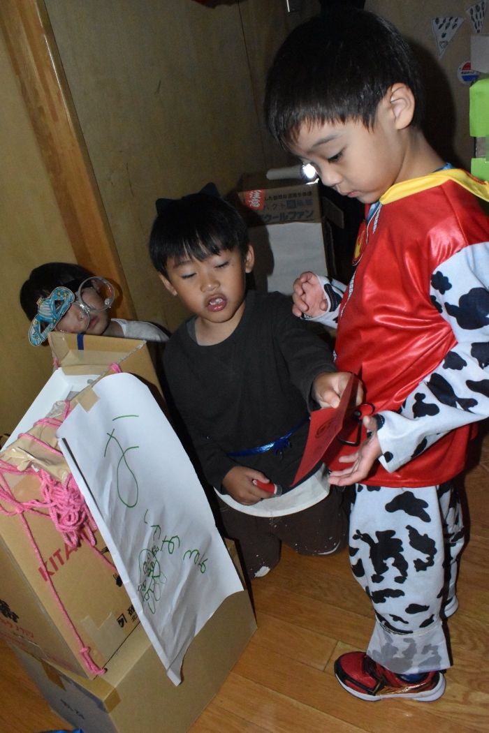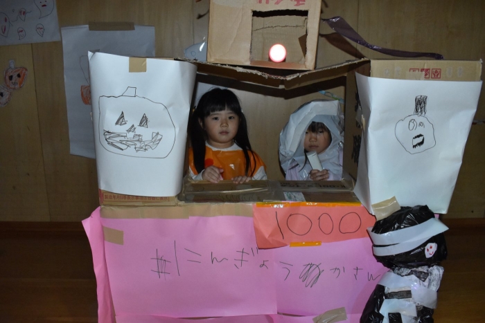 今日はさくら組のどっきり大作戦part2の日です。今日はハロウィンの日でもあるため,ハロウィンを取り入れた内容を考えたさくら組さん。ハロウィンにはお菓子が必要!ということで,幼稚園の会計を握る主査の先生に交渉したさくら組さん。交渉成立し,どっきり大作戦でみんなに配るお菓子も準備完了。以前に使っていたお店屋さんの道具なども再利用しながら,今日までコツコツと準備を進めてきました。そしていよいよ今日,本番を迎えました。さくら組さん,今朝は直前の準備を入念に行っていました。