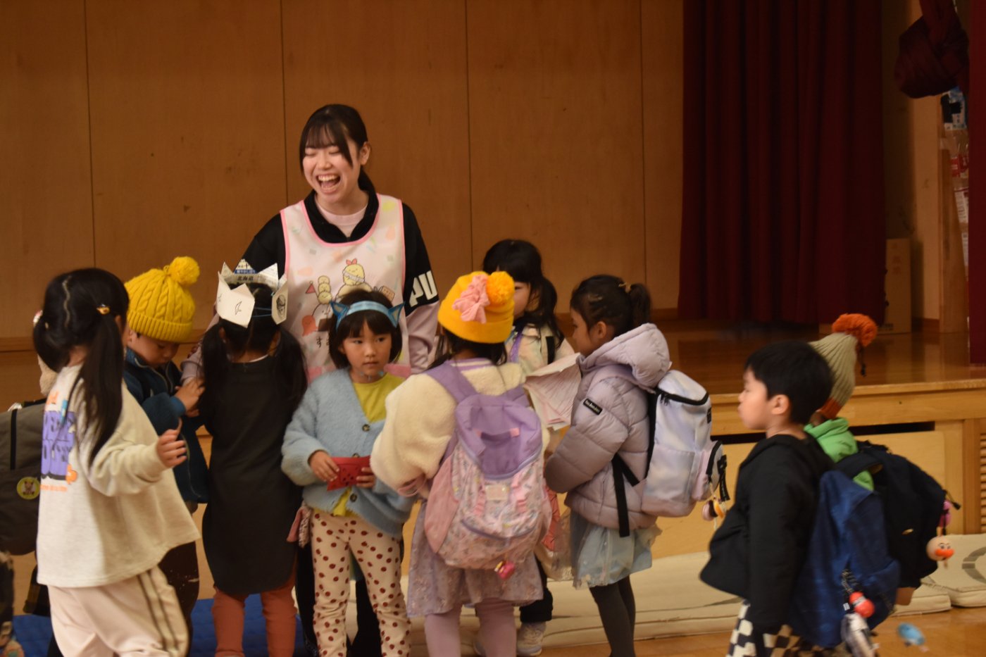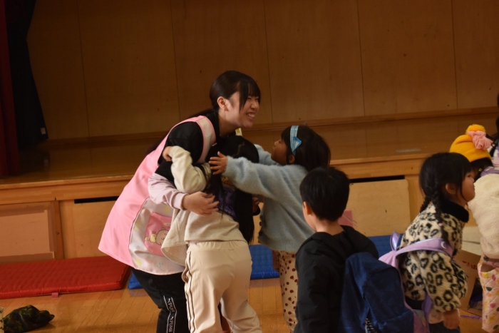 今後は専門学校に戻り,卒業まで頑張ってくださいね。ぜひ保育の道を進んでもらえるとありがたいなと思います。帰省の際は,幼稚園に顔を見せに来てくれると嬉しいです(*^-^*)実習お疲れ様でした!