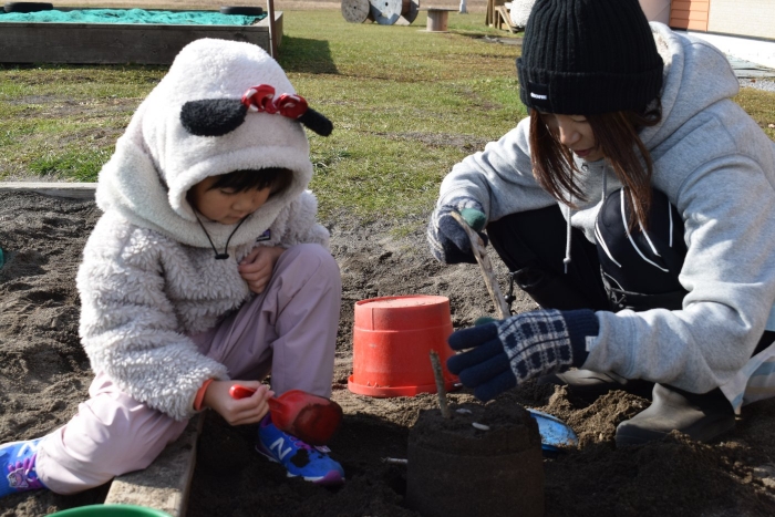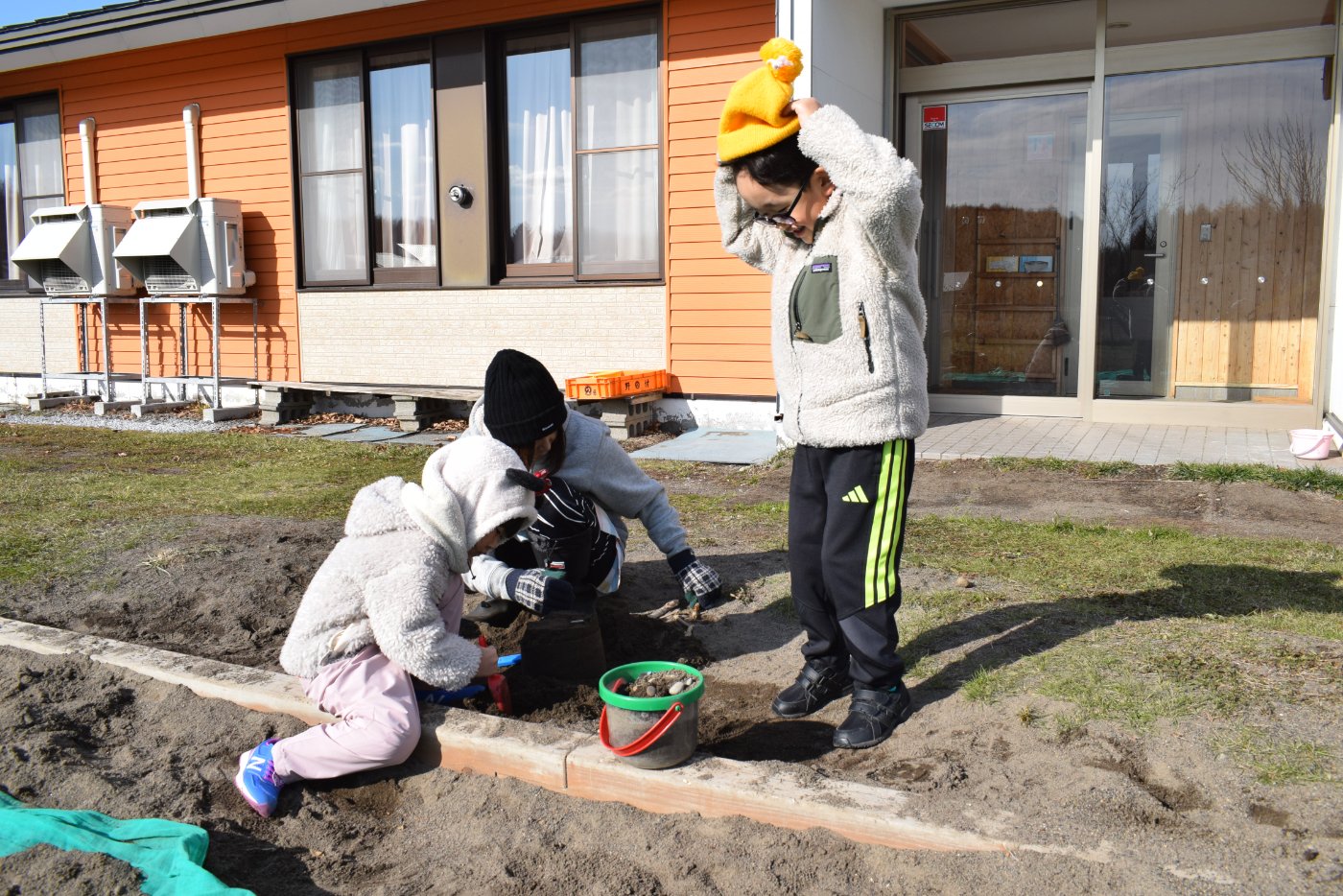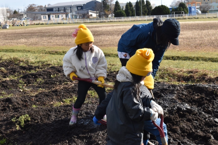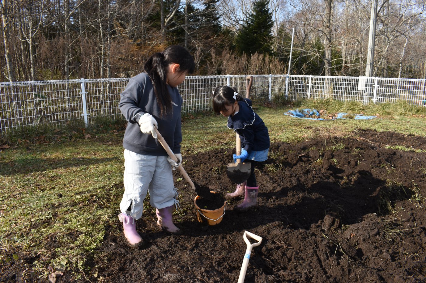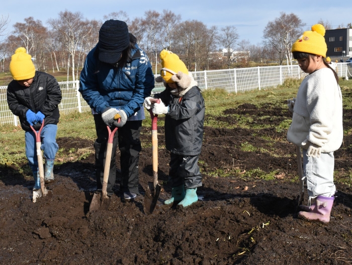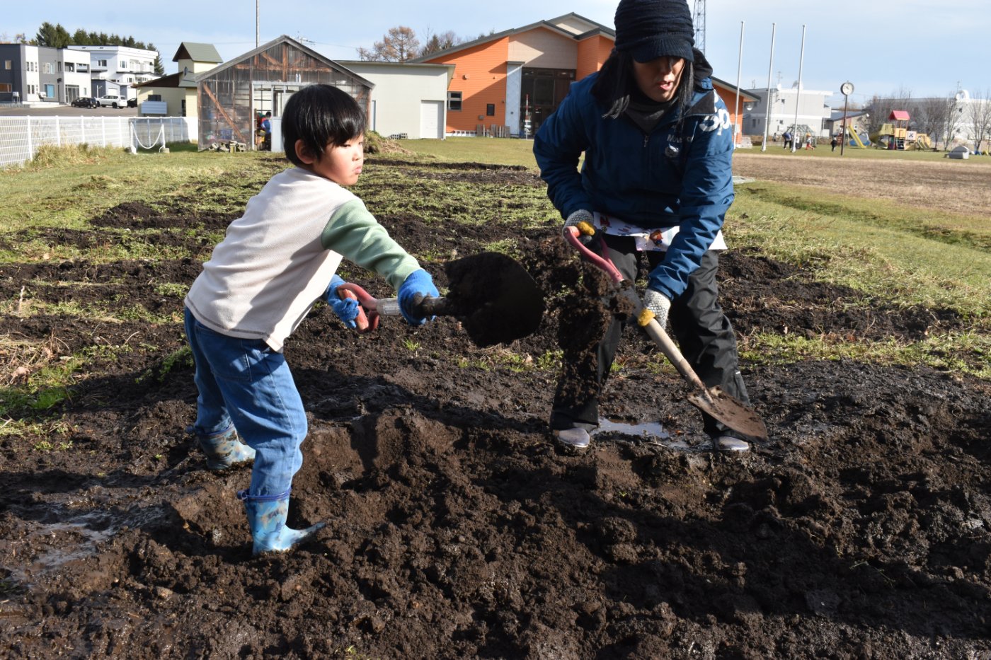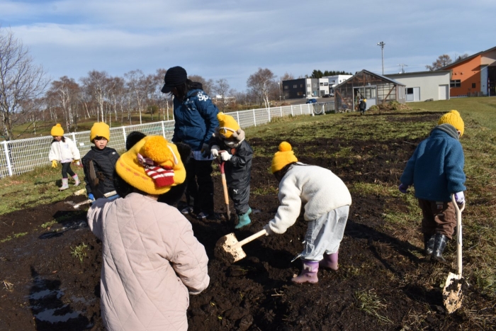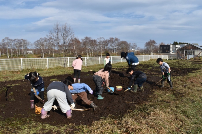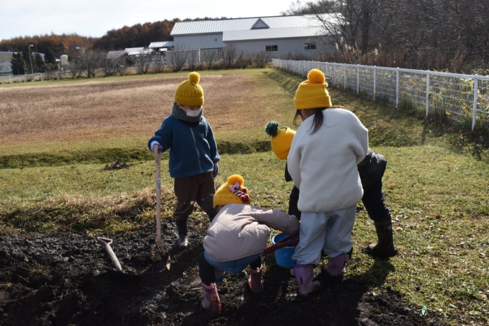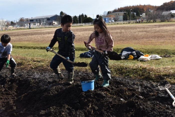 先日,途中まで片付けた鹿の罠、あとは穴を元通りに埋めると終了です。どろどろでとても重い土のため,みんなで剣先スコップを使って埋めていきます。元通りに埋めておかないと,来年,畑に野菜を植えられなくなってしまうので,がんばって元通りの畑に戻そう!