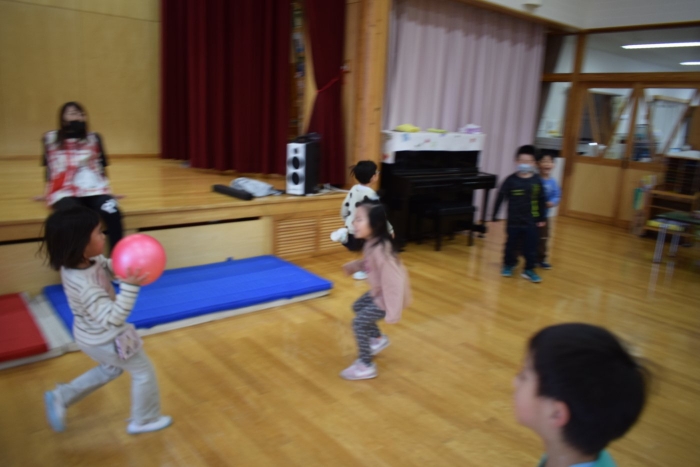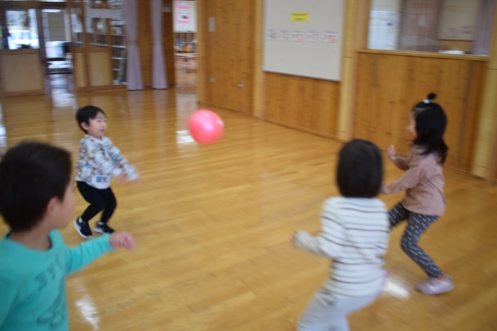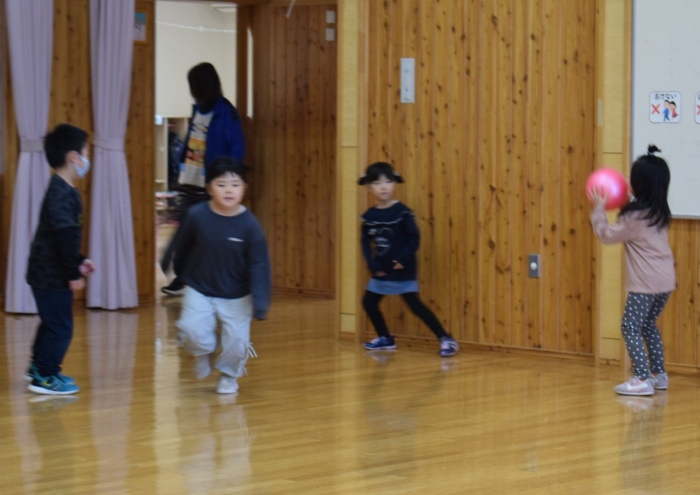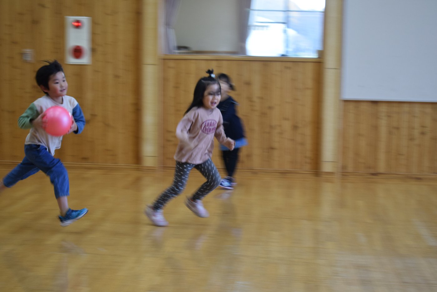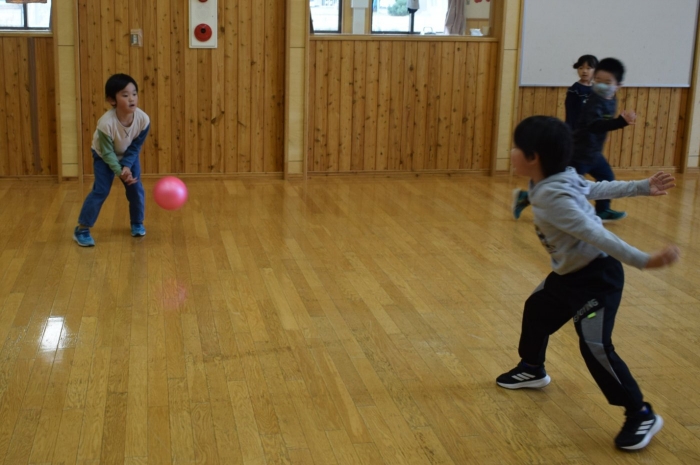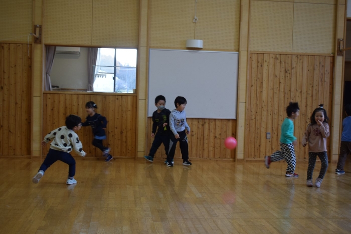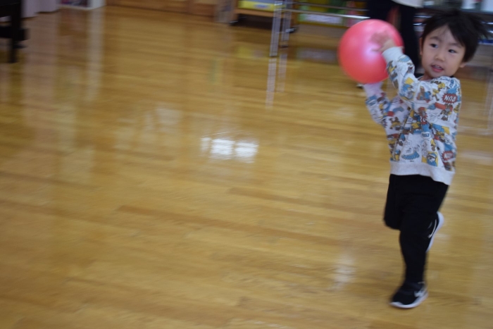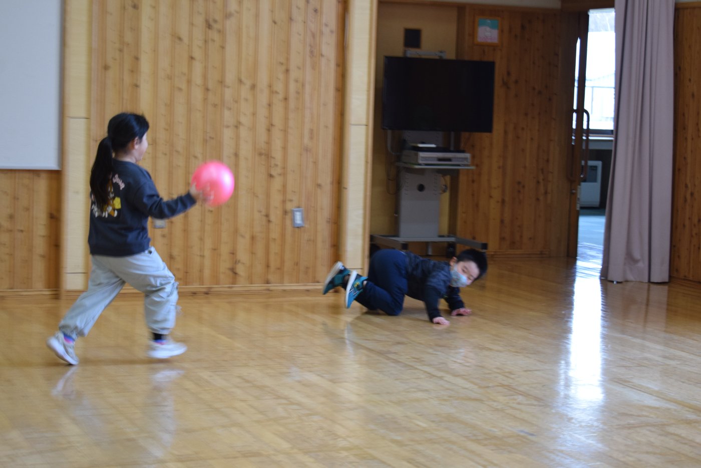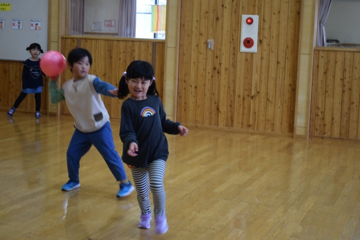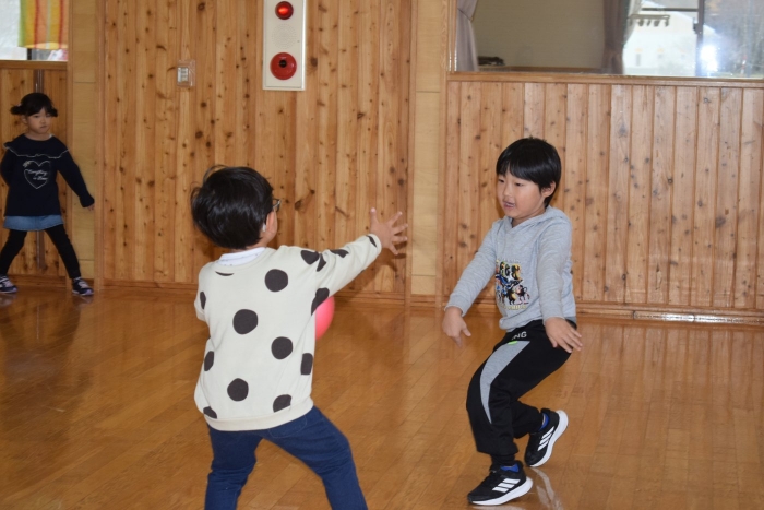 今朝も「かたき」が始まり,だいぶかたき慣れ(?)してきた子どもたちは,遊びの楽しさを感じながら,自分の力を出そうと張り切って遊んでいました。友達にボールを当てることや,投げられたボールをキャッチすることができるととても嬉しそうです。