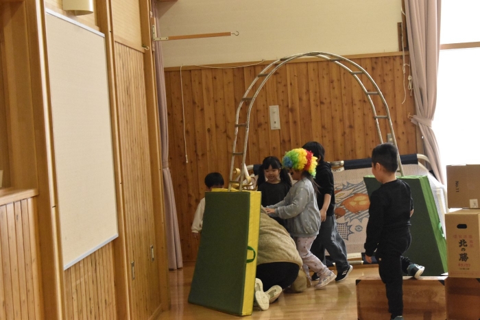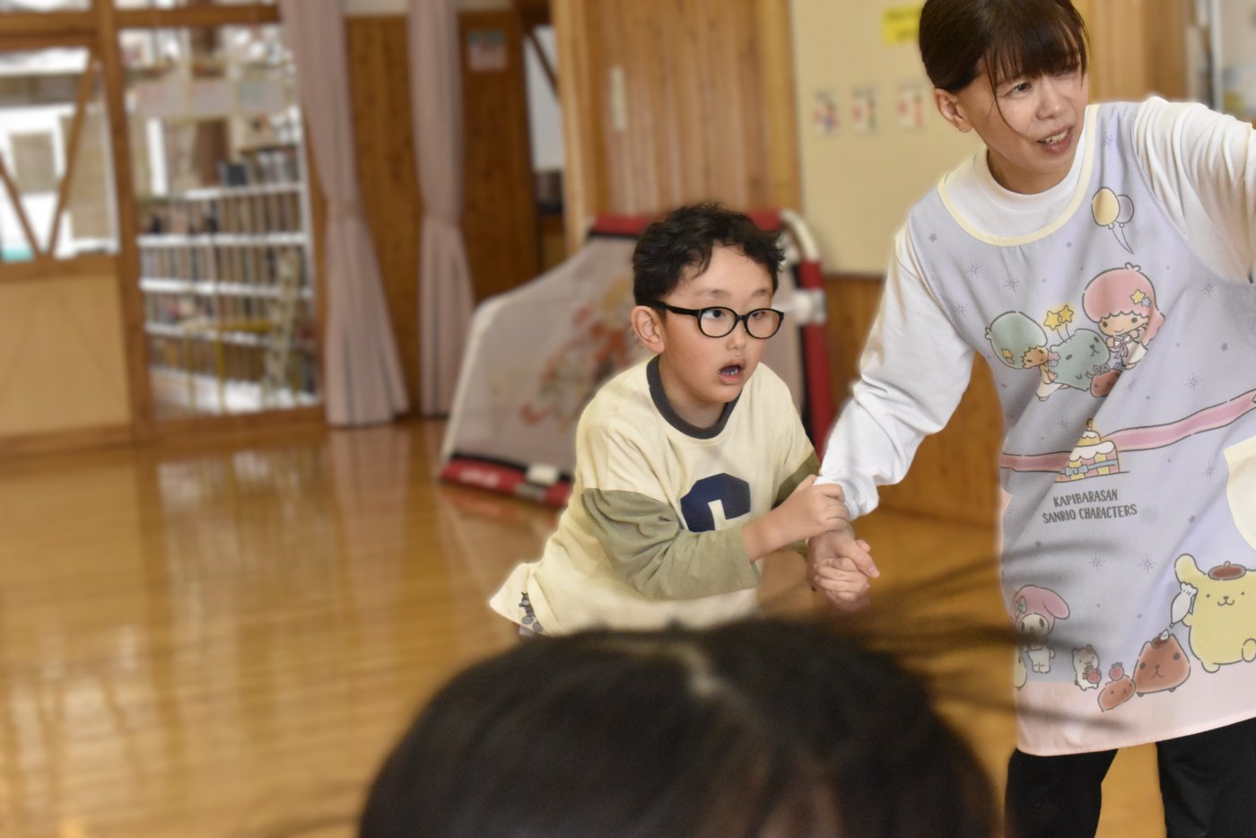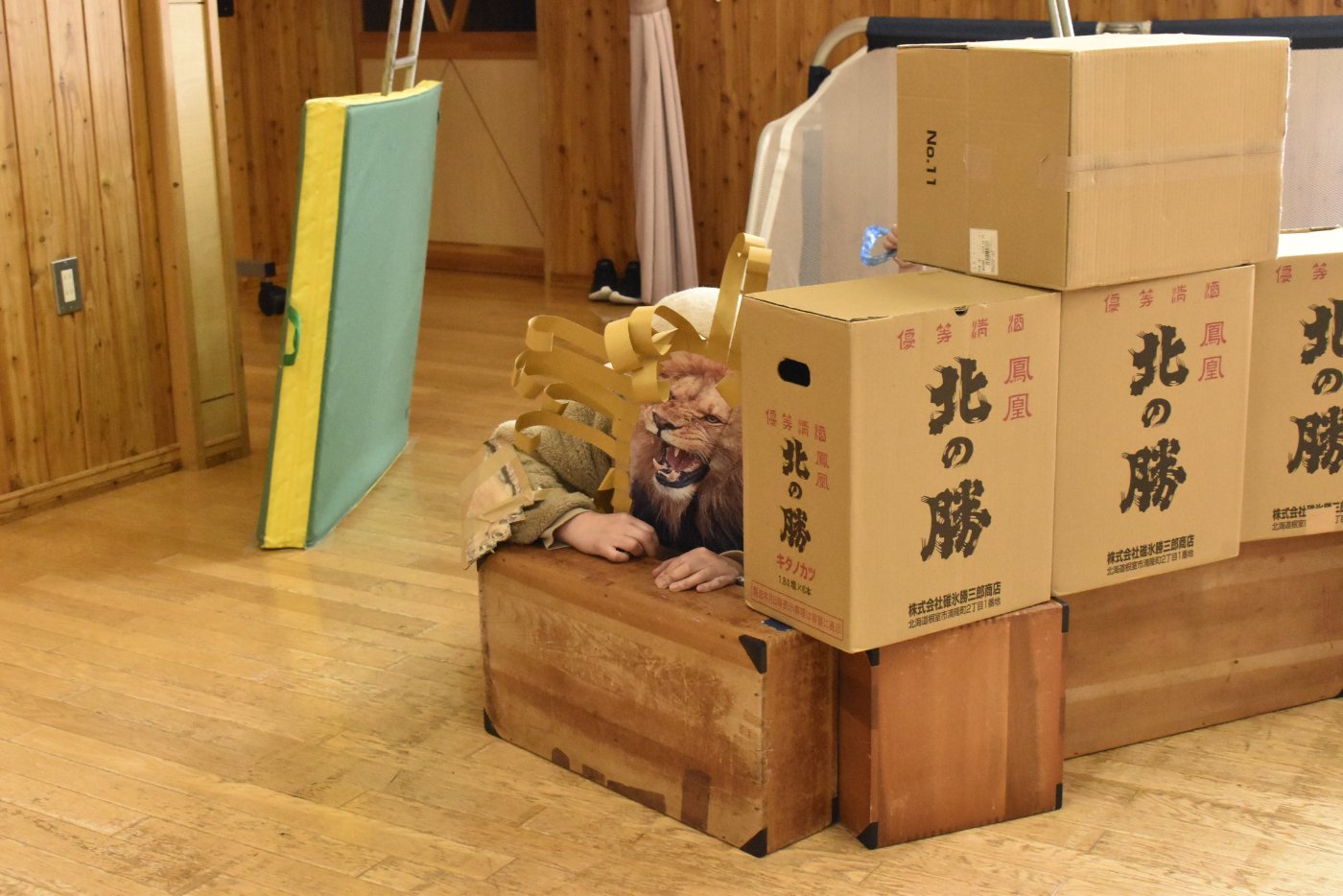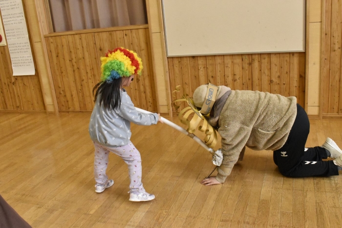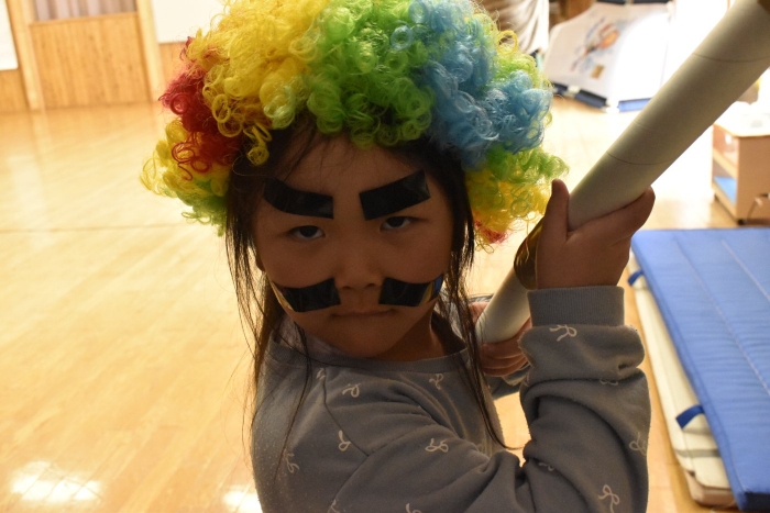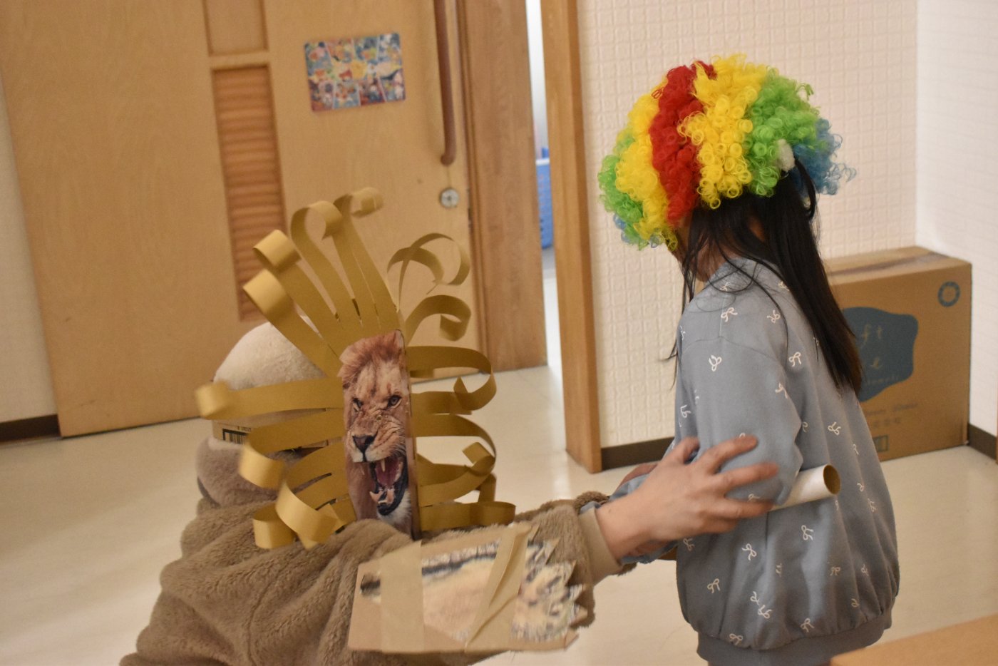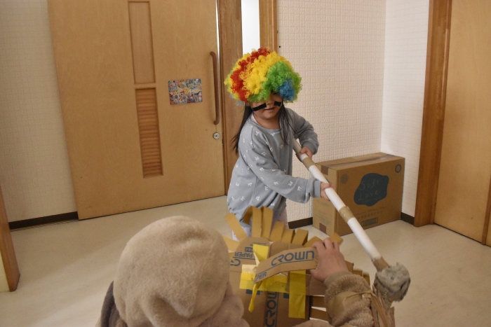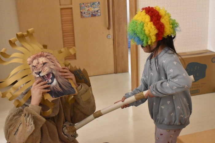 さくら組では,8名のさくらさん,一人ひとりの「卒園までにやりたいこと」を順番に叶えています。以前のクラスだよりにも少し載せていましたが,これまで,「女の子4人でダンスデビューしたい」「新聞紙で作った家やりたい」「お掃除ロボット人間型作りたい」「先生と本気でホッケー対決したい」「外で先生と相撲したい」「みんなでどっきり大作戦3したい」「先生と毎日お絵かきしたい」「毎日ハグしたい」「ぼくの好きなところを手紙に書いてほしい」「雪中サッカーしたい」などを叶えてきていますが,今日はまだ叶えていなかった最後のお友達のやりたいことを実現したのでした。そのやりたいこととは,「正義のヒーローになって,ライオンに襲われた〇〇〇先生を助ける・・・」ということでした。ヒーロー?のかつらをかぶり,メイク?をしてヒーローになりきるお友達。ライオン役は担任の先生です。