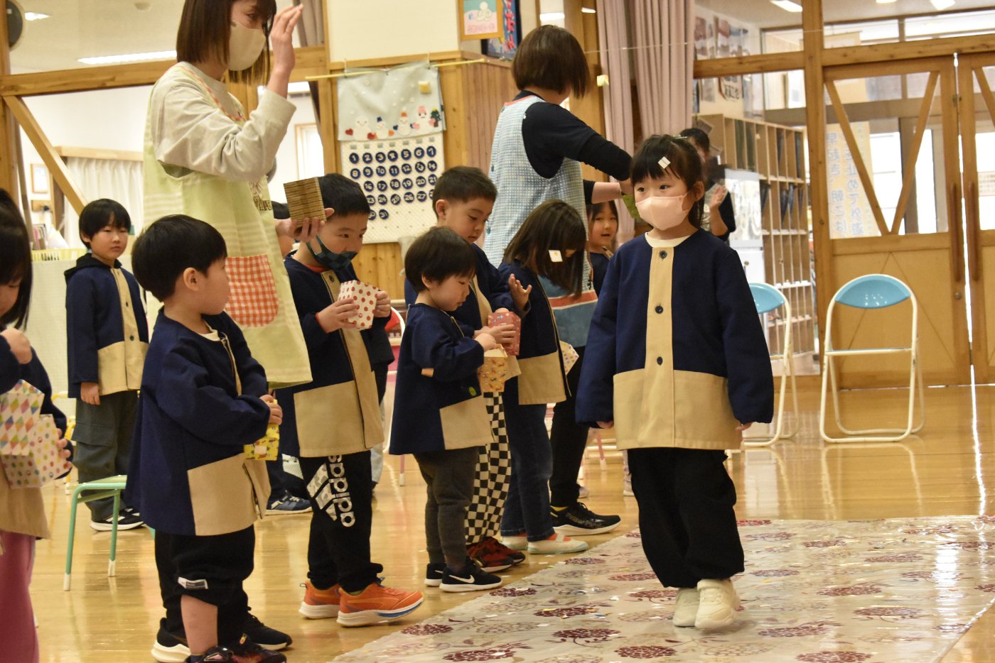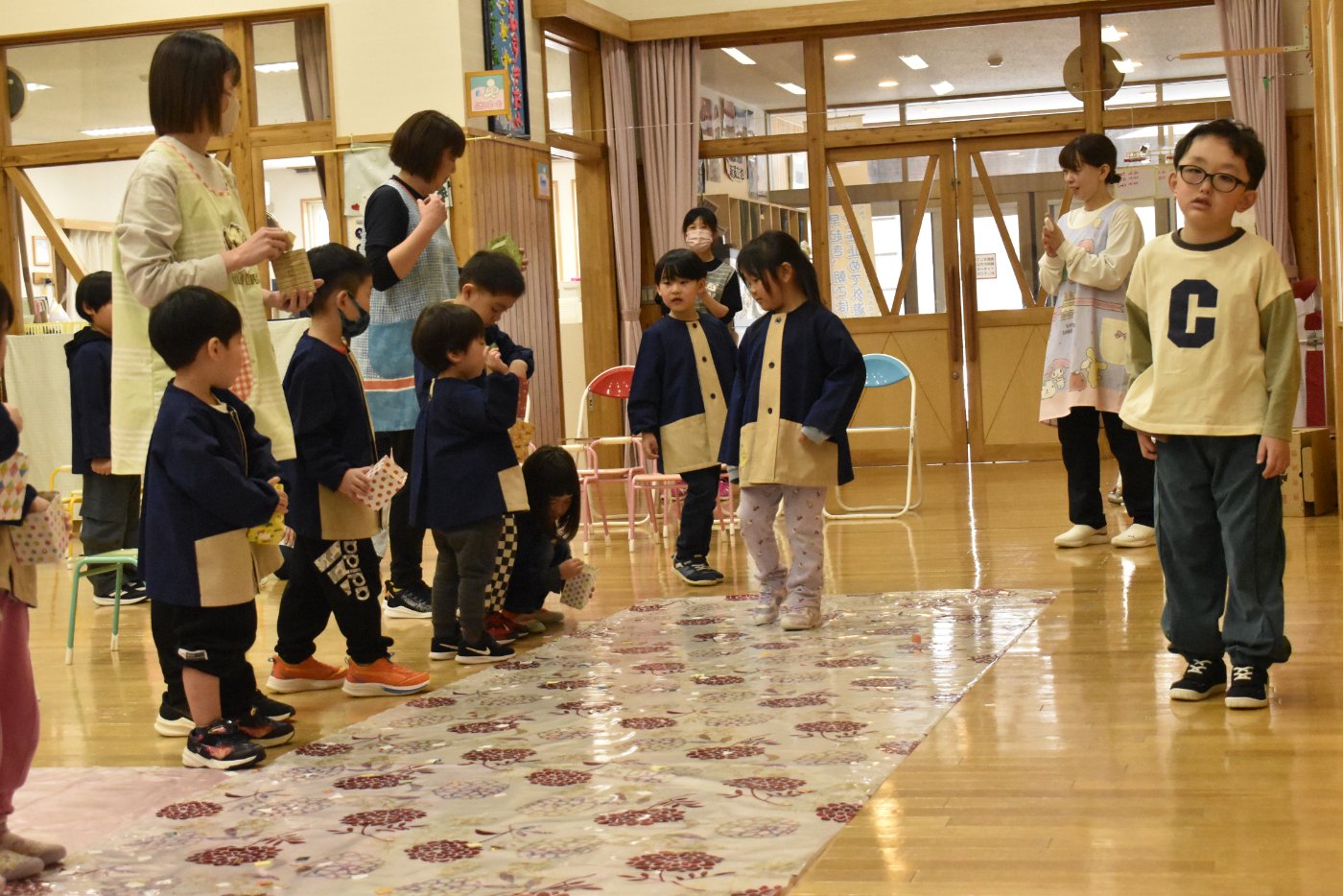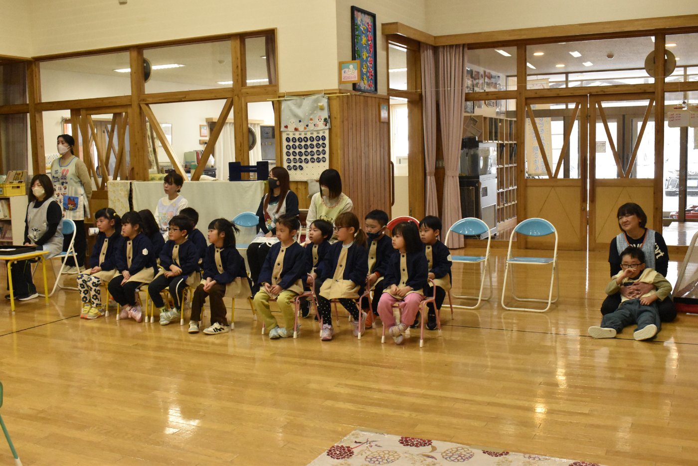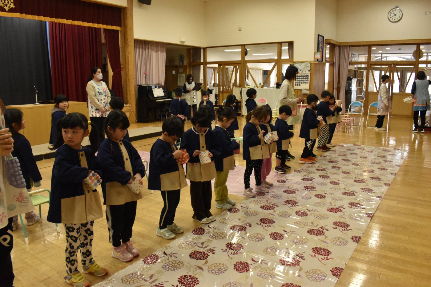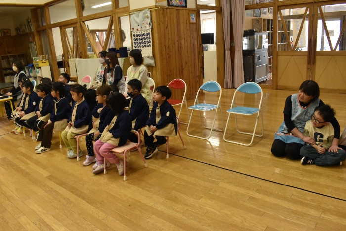 時間も前回よりも長くなりましたが,うめ・もも組さんも式の雰囲気を感じ,行儀よく座ろうとしたり,さくら組さんは前回よりも堂々と取り組む姿が見られていました。