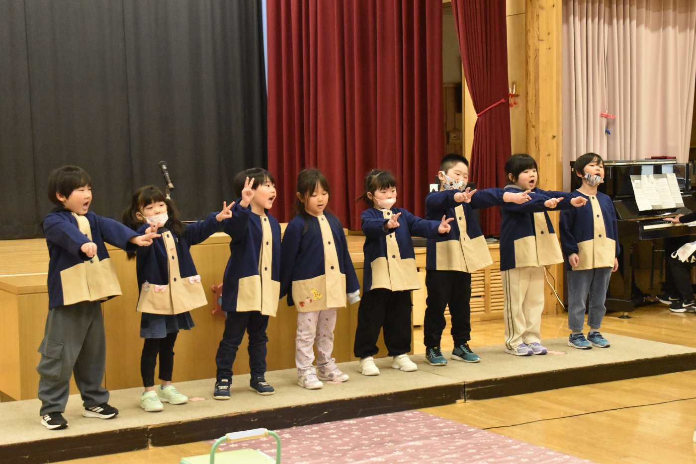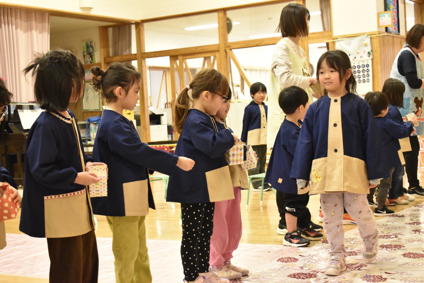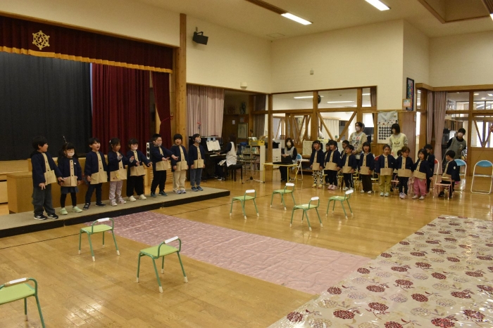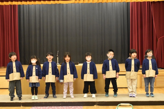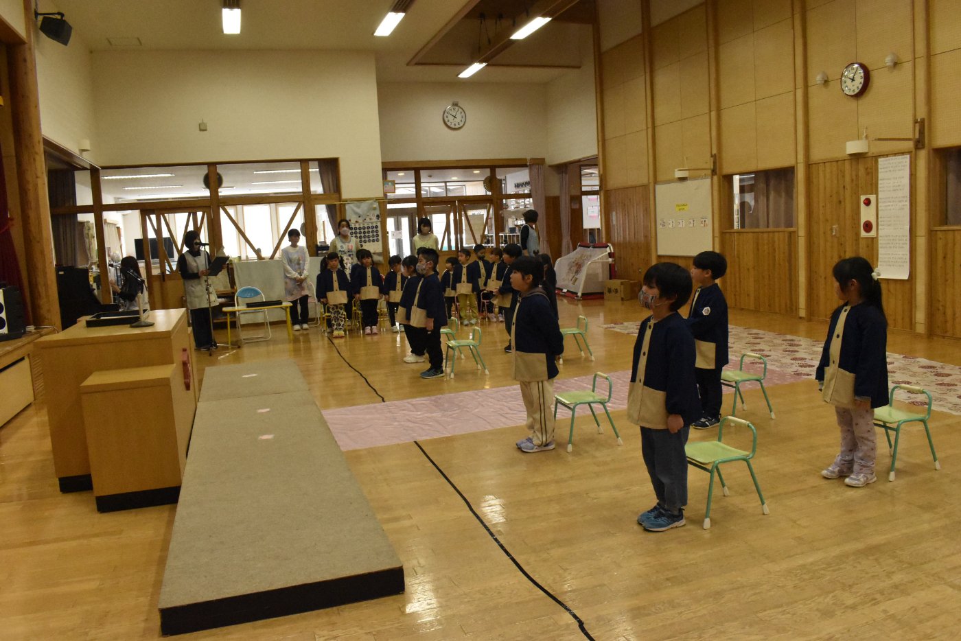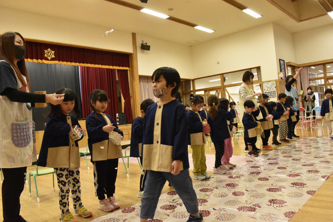 時間も前回よりも長くなりましたが,うめ・もも組さんも式の雰囲気を感じ,行儀よく座ろうとしたり,さくら組さんは前回よりも堂々と取り組む姿が見られていました。
