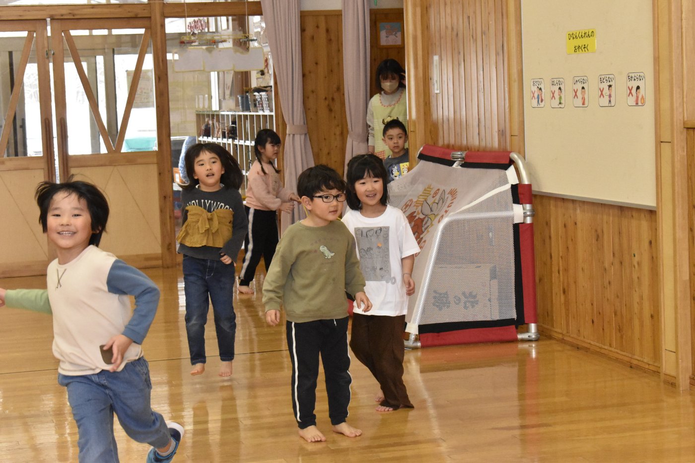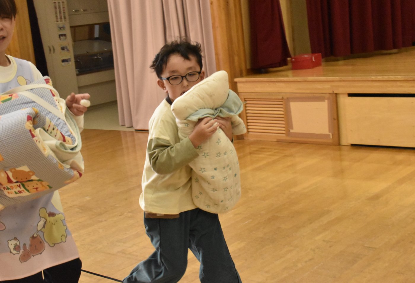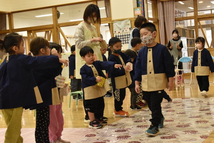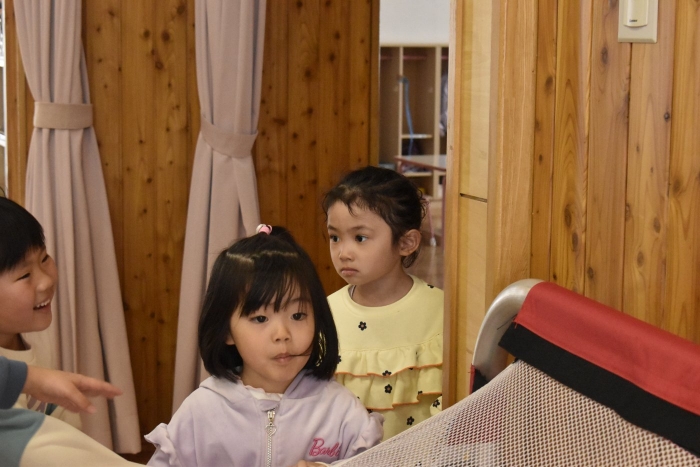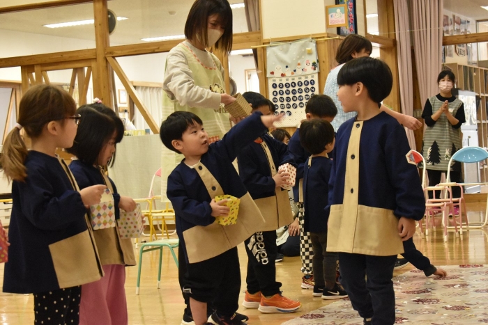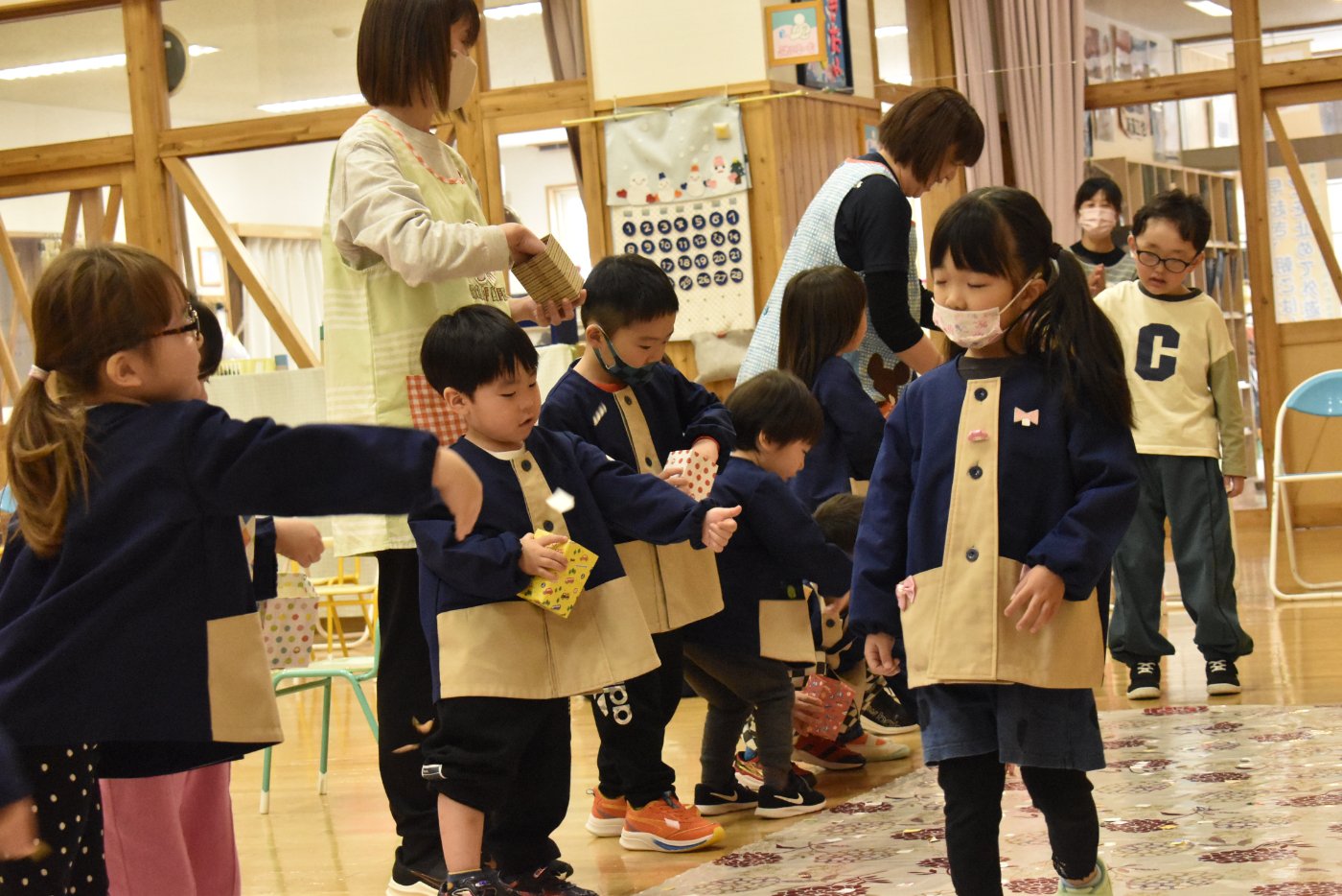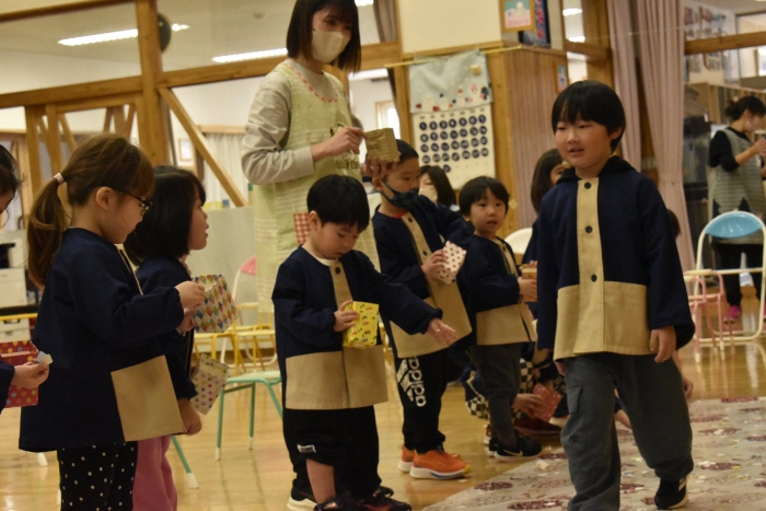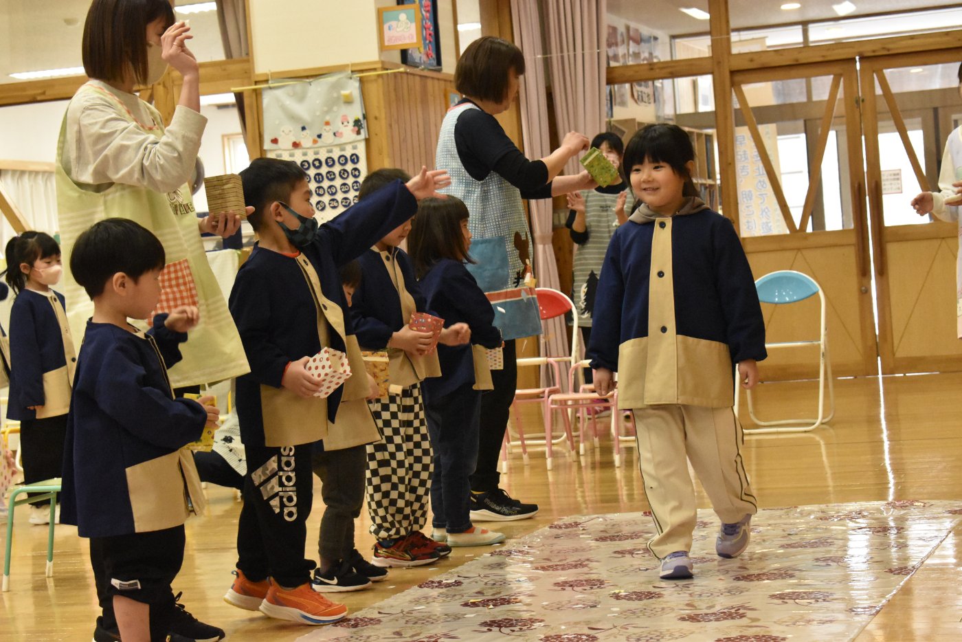 時間も前回よりも長くなりましたが,うめ・もも組さんも式の雰囲気を感じ,行儀よく座ろうとしたり,さくら組さんは前回よりも堂々と取り組む姿が見られていました。