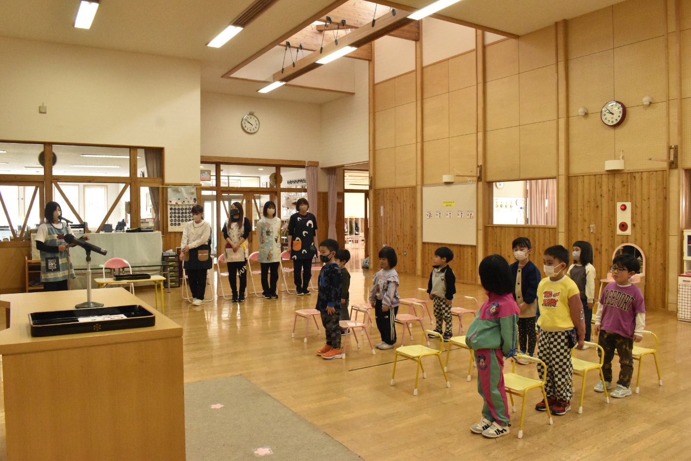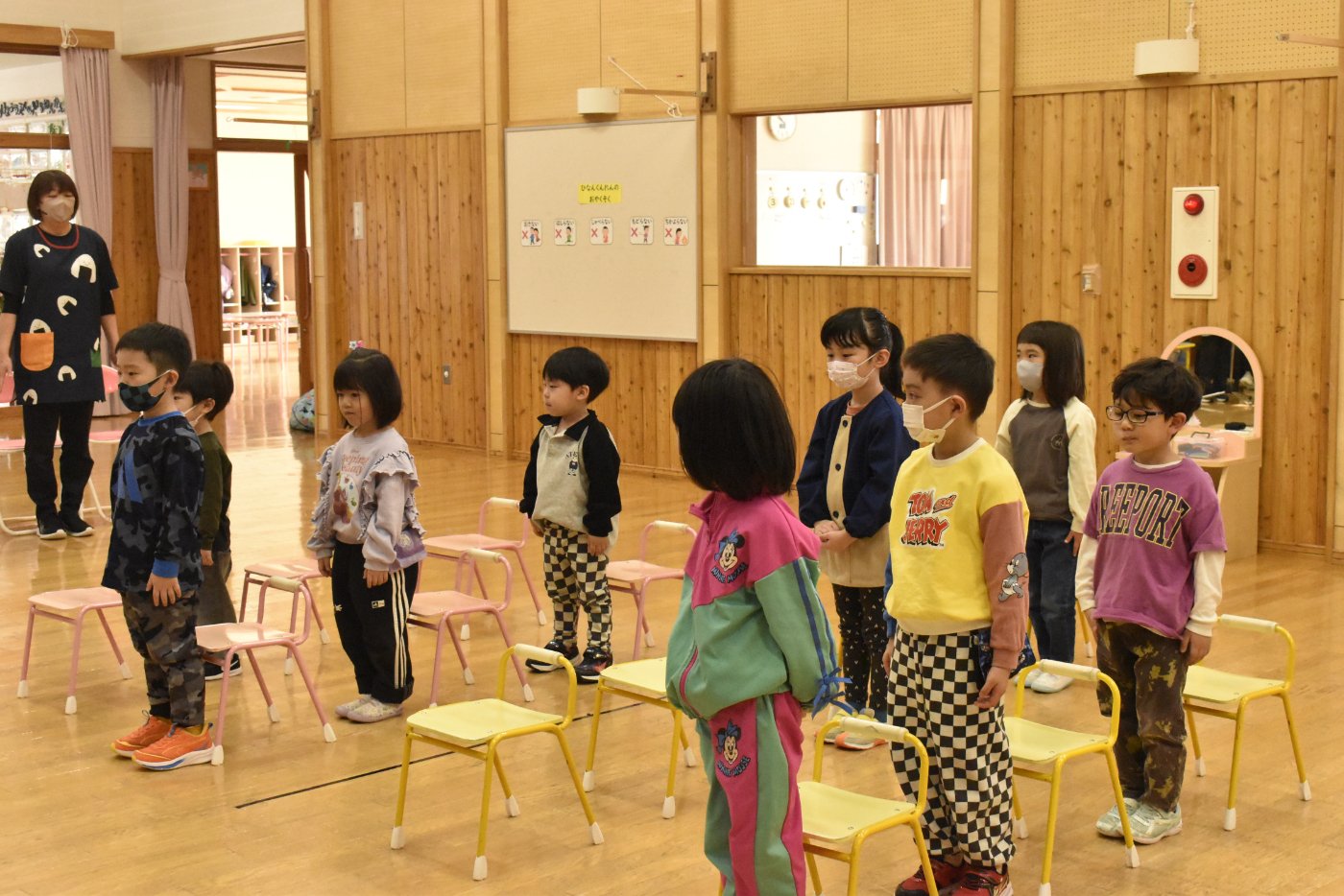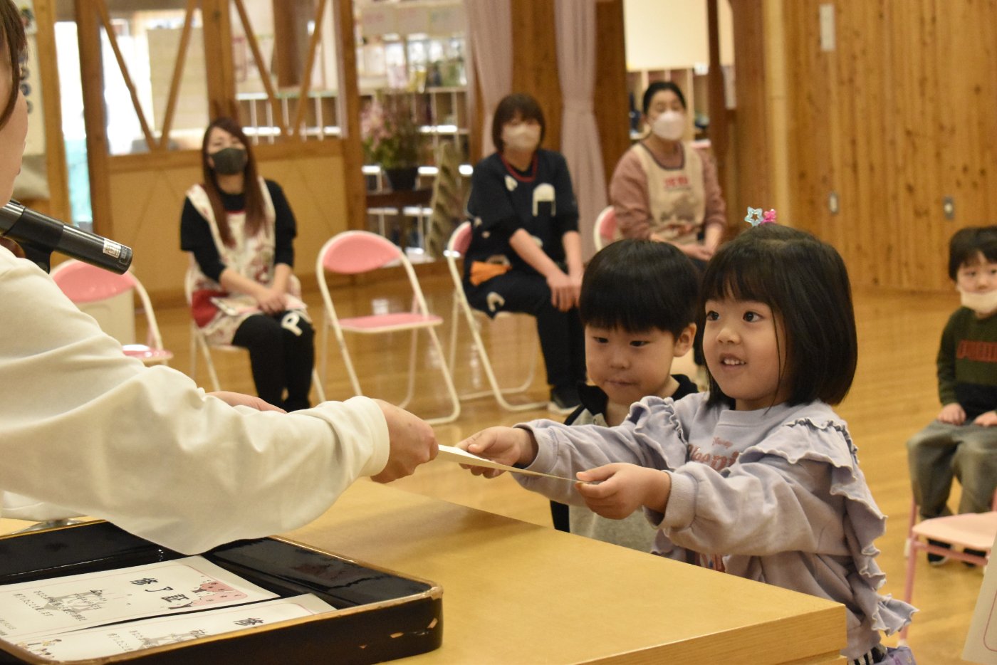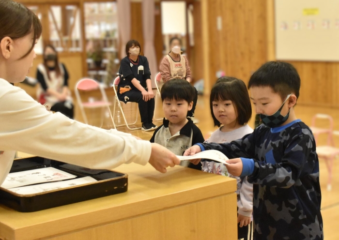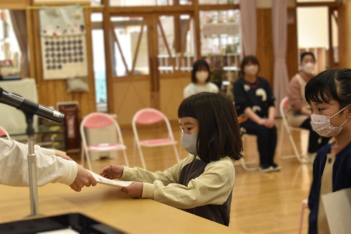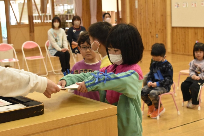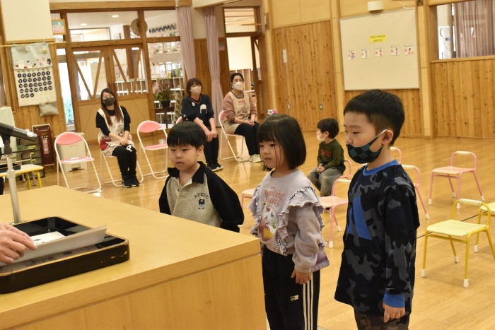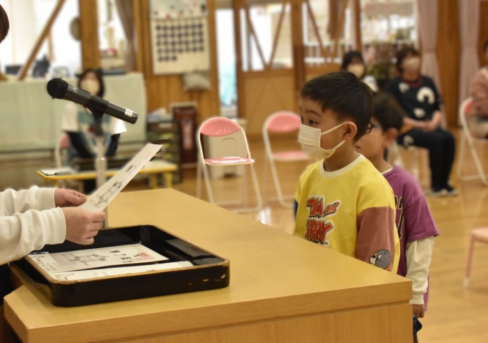 明日は令和7年度修了式。先日卒園式がありましたが,今度はうめ組さんともも組さんの番です。今年,うめ組ともも組の1年間でたくさん成長した証に,かっこよく終了証を受け取ってくださいね。