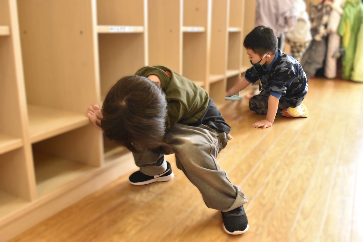 修了式練習の後は,うめさんとももさんそれぞれ,1年間使った保育室の大掃除をしていました。4月からはこのお部屋と別れ,新しい保育室になりますので,1年間の感謝の意味と,次にこのお部屋を使うお友達のためにピカピカにしました。