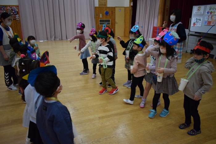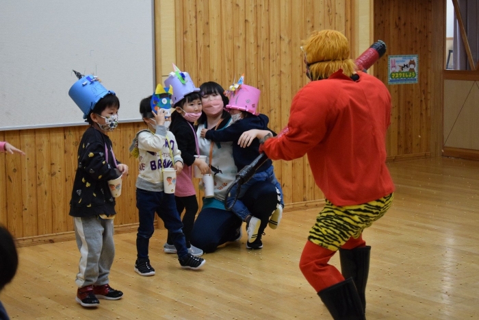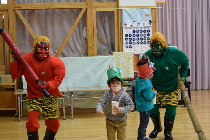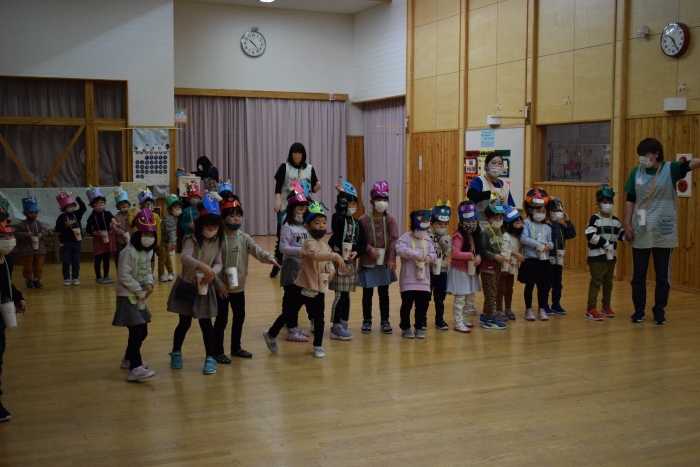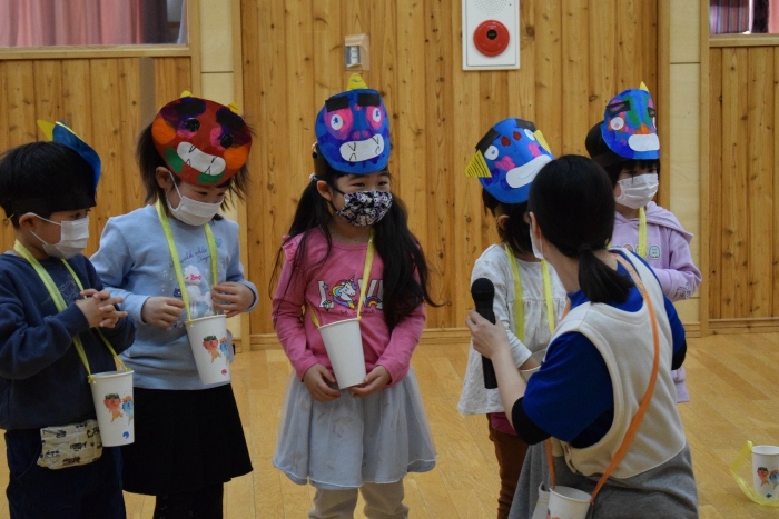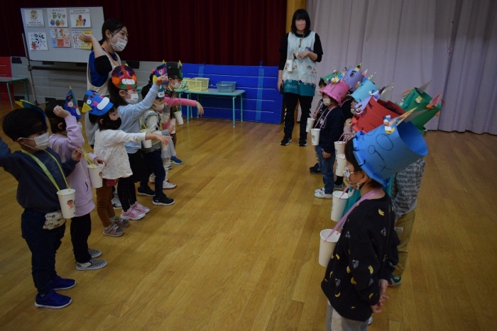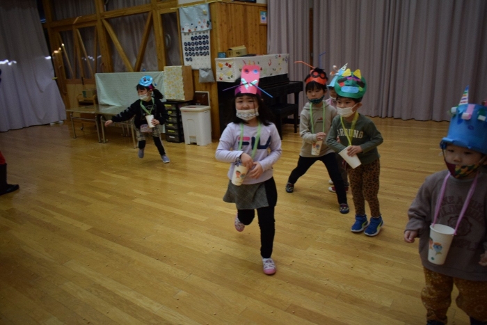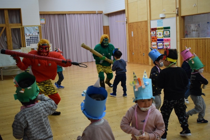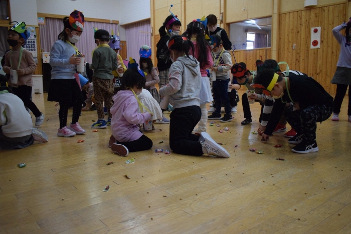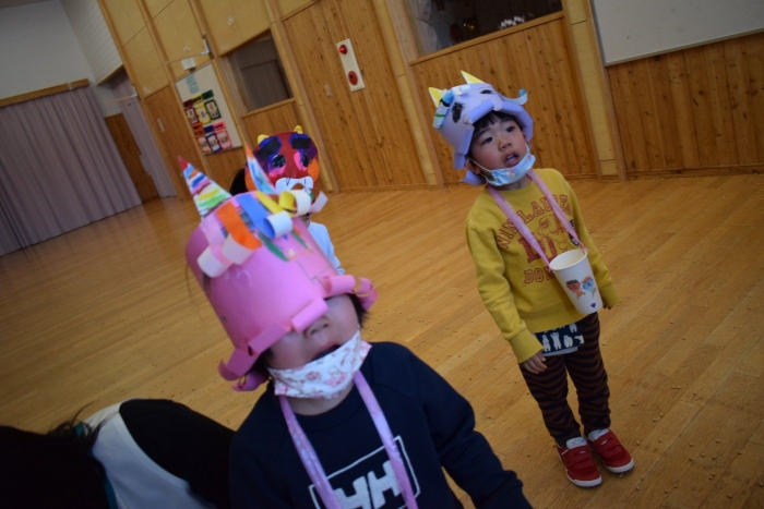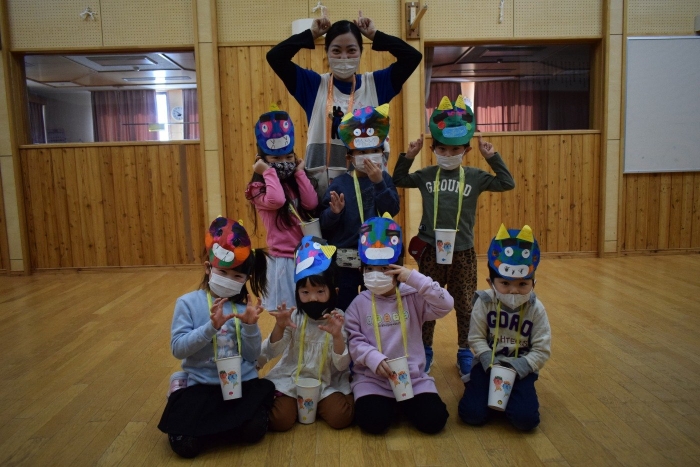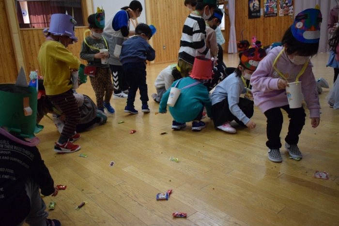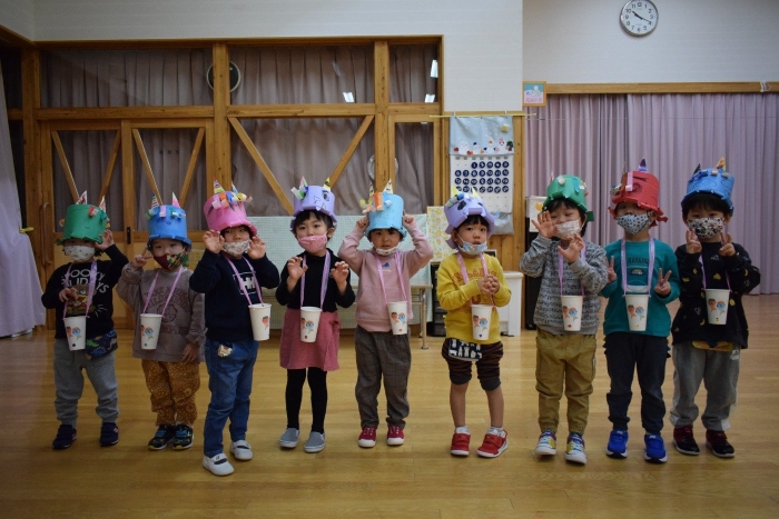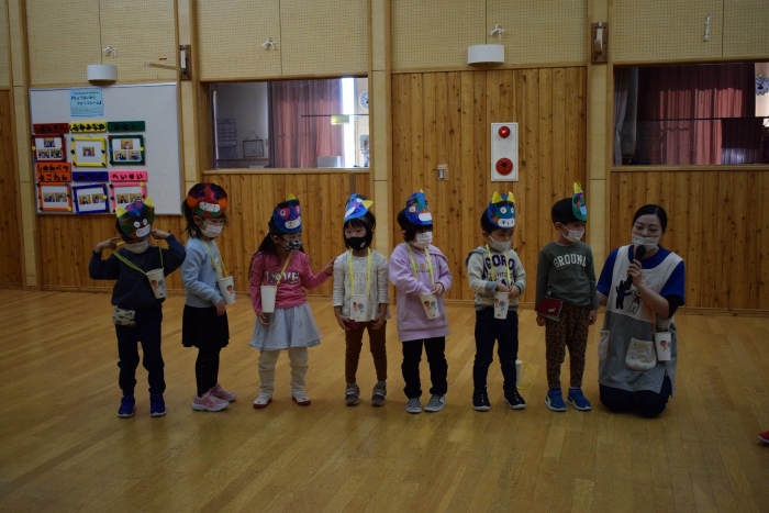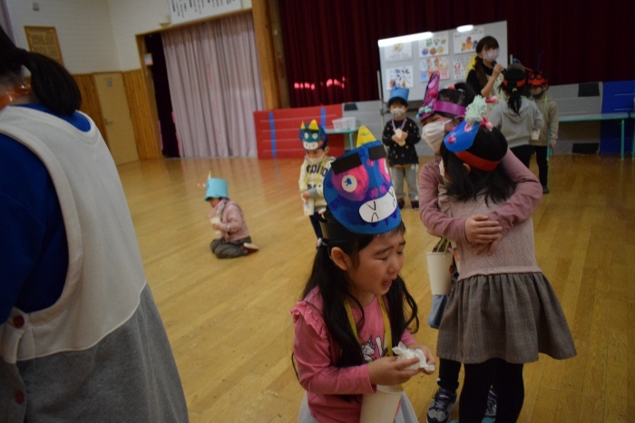 今日は節分。恒例の幼稚園豆まき会を行いました。はじめに自分で作ったお面をみんなで披露しあいました。それぞれ個性的なお面に仕上がってお友達同士で見入ってました。そのあと自分の心の👹を退治するという意味で豆をまきました。幼稚園も平穏な年であるように外に向かって豆まきをしていましたら、なんと本物の👹が二匹現れみんなパニックに!泣き出す子が続出しましたが、みんな勇気を出して豆をまき、鬼を退散させることができました。よかったよかった。最後に福男が現れ「福は内~!」の掛け声とともに豆やお菓子をまいてくれてみんなで拾いました。おうちに持って帰って食べることになりました。