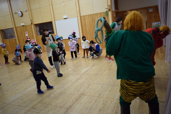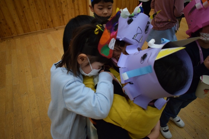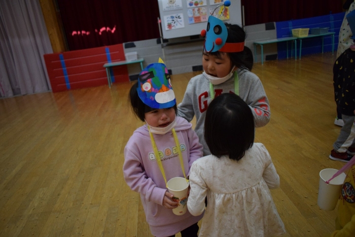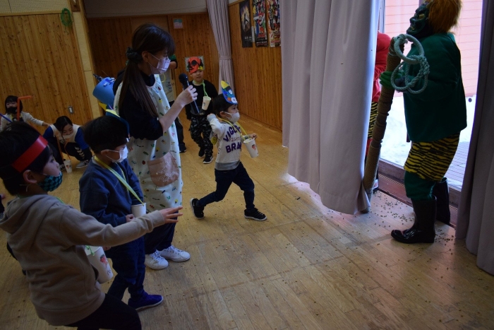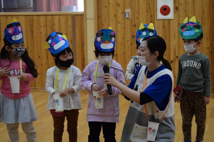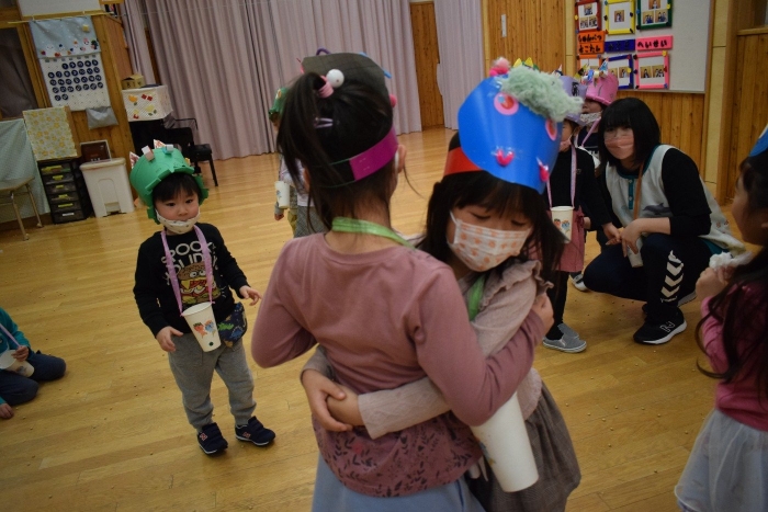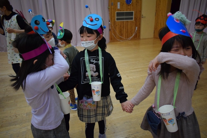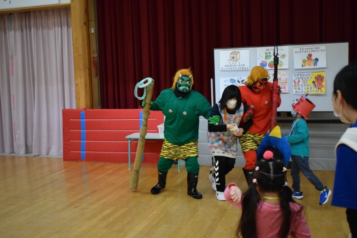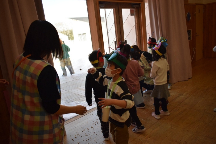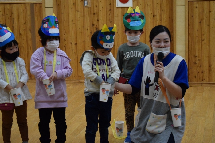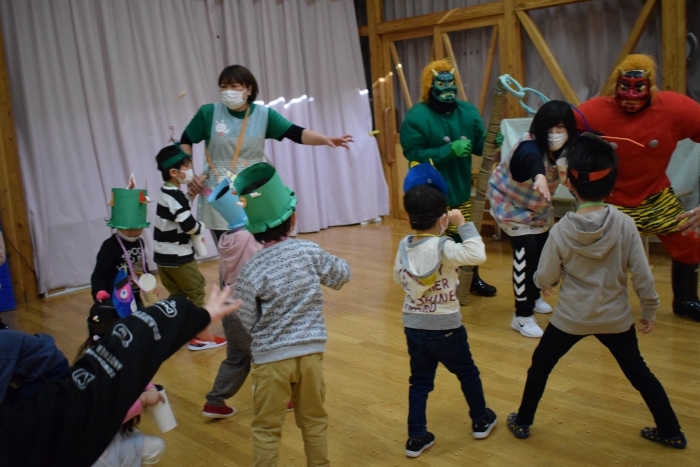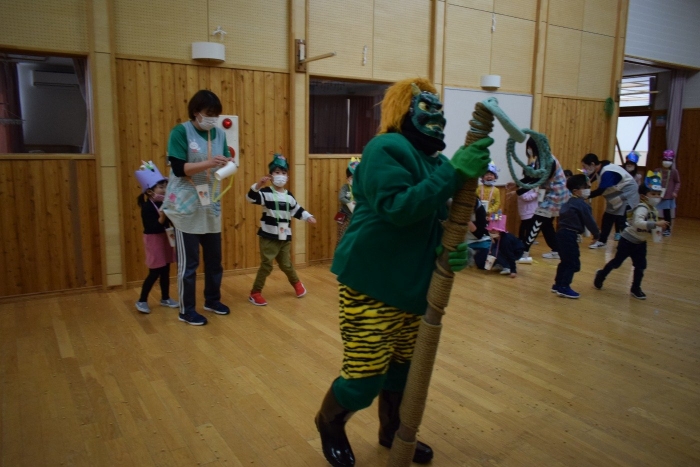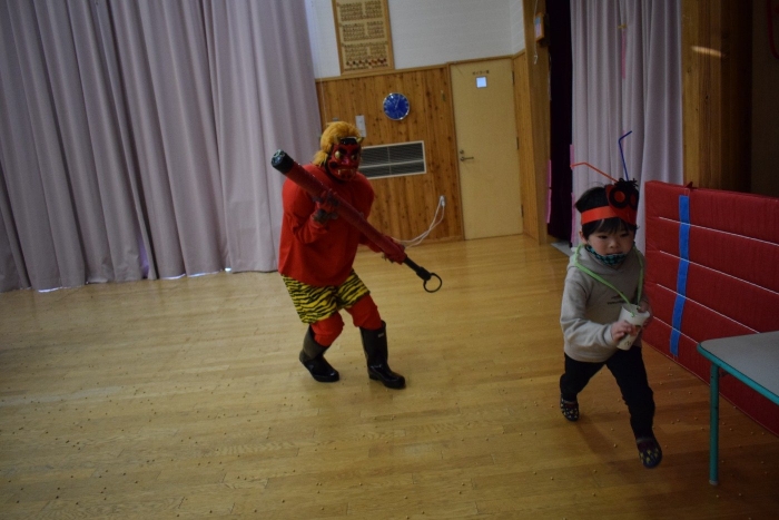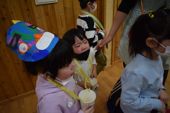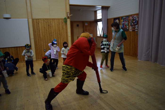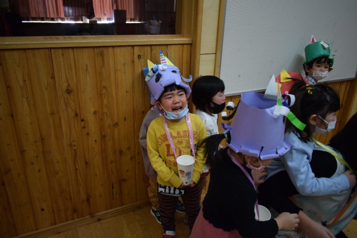 今日は節分。恒例の幼稚園豆まき会を行いました。はじめに自分で作ったお面をみんなで披露しあいました。それぞれ個性的なお面に仕上がってお友達同士で見入ってました。そのあと自分の心の👹を退治するという意味で豆をまきました。幼稚園も平穏な年であるように外に向かって豆まきをしていましたら、なんと本物の👹が二匹現れみんなパニックに!泣き出す子が続出しましたが、みんな勇気を出して豆をまき、鬼を退散させることができました。よかったよかった。最後に福男が現れ「福は内~!」の掛け声とともに豆やお菓子をまいてくれてみんなで拾いました。おうちに持って帰って食べることになりました。