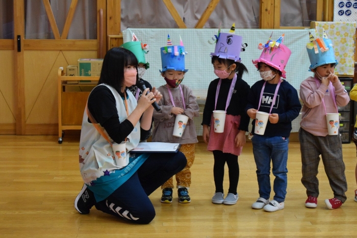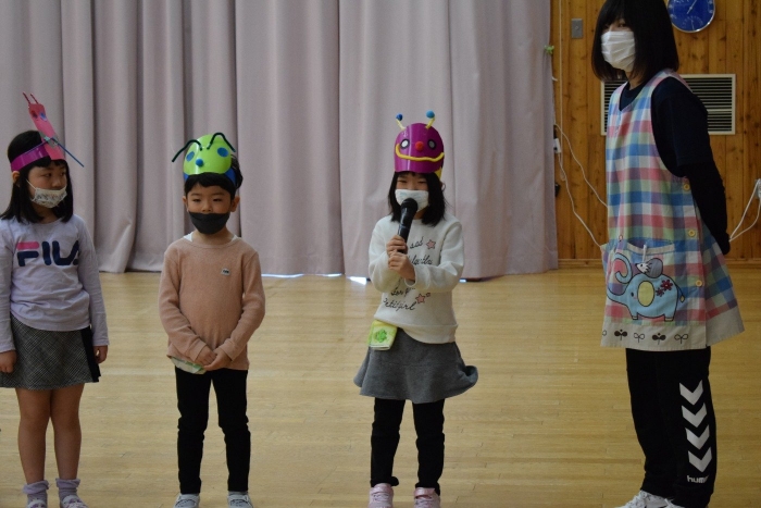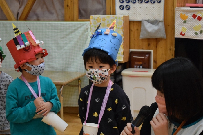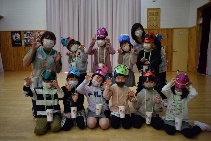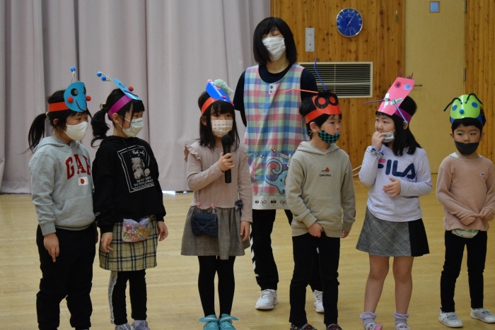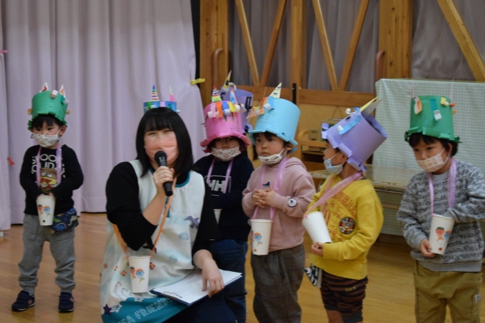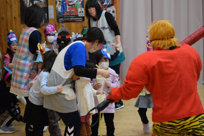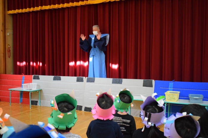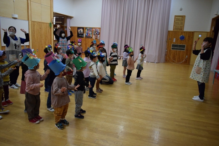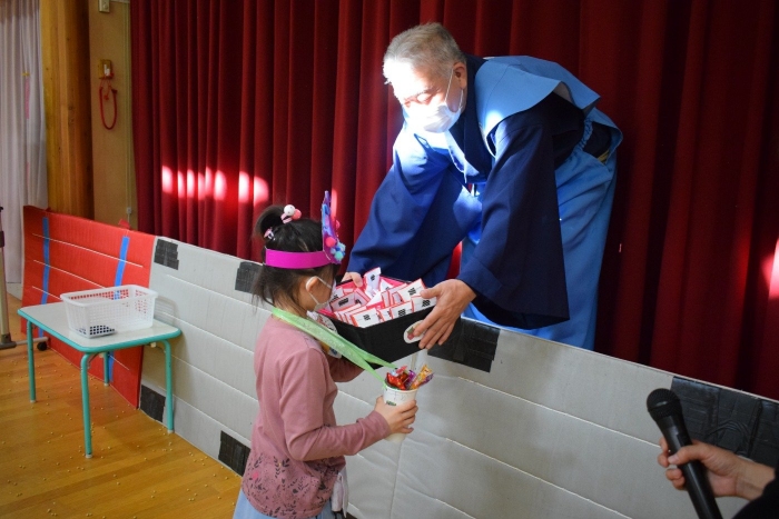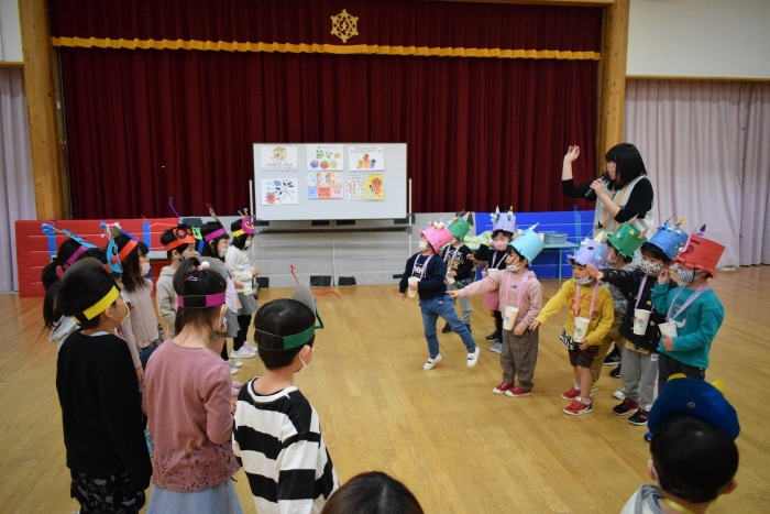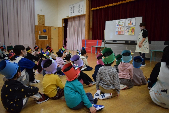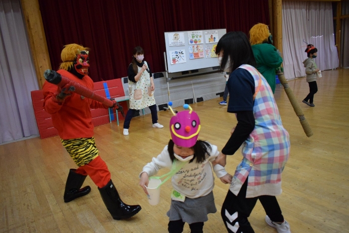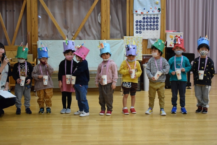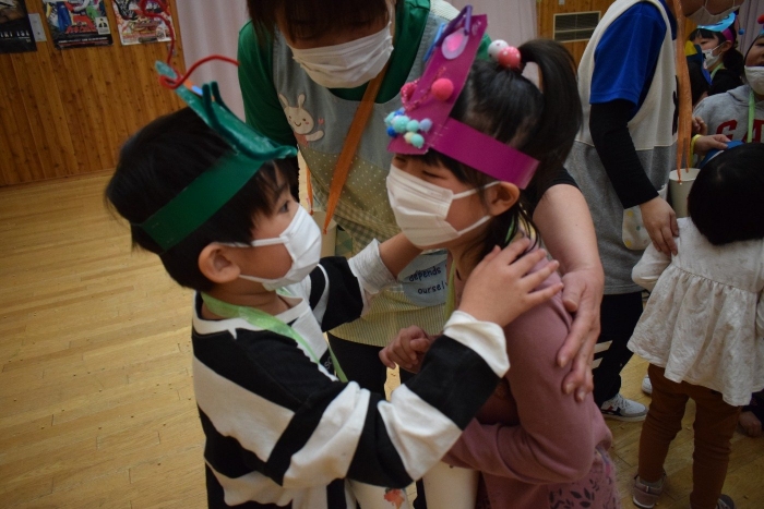 今日は節分。恒例の幼稚園豆まき会を行いました。はじめに自分で作ったお面をみんなで披露しあいました。それぞれ個性的なお面に仕上がってお友達同士で見入ってました。そのあと自分の心の👹を退治するという意味で豆をまきました。幼稚園も平穏な年であるように外に向かって豆まきをしていましたら、なんと本物の👹が二匹現れみんなパニックに!泣き出す子が続出しましたが、みんな勇気を出して豆をまき、鬼を退散させることができました。よかったよかった。最後に福男が現れ「福は内~!」の掛け声とともに豆やお菓子をまいてくれてみんなで拾いました。おうちに持って帰って食べることになりました。
